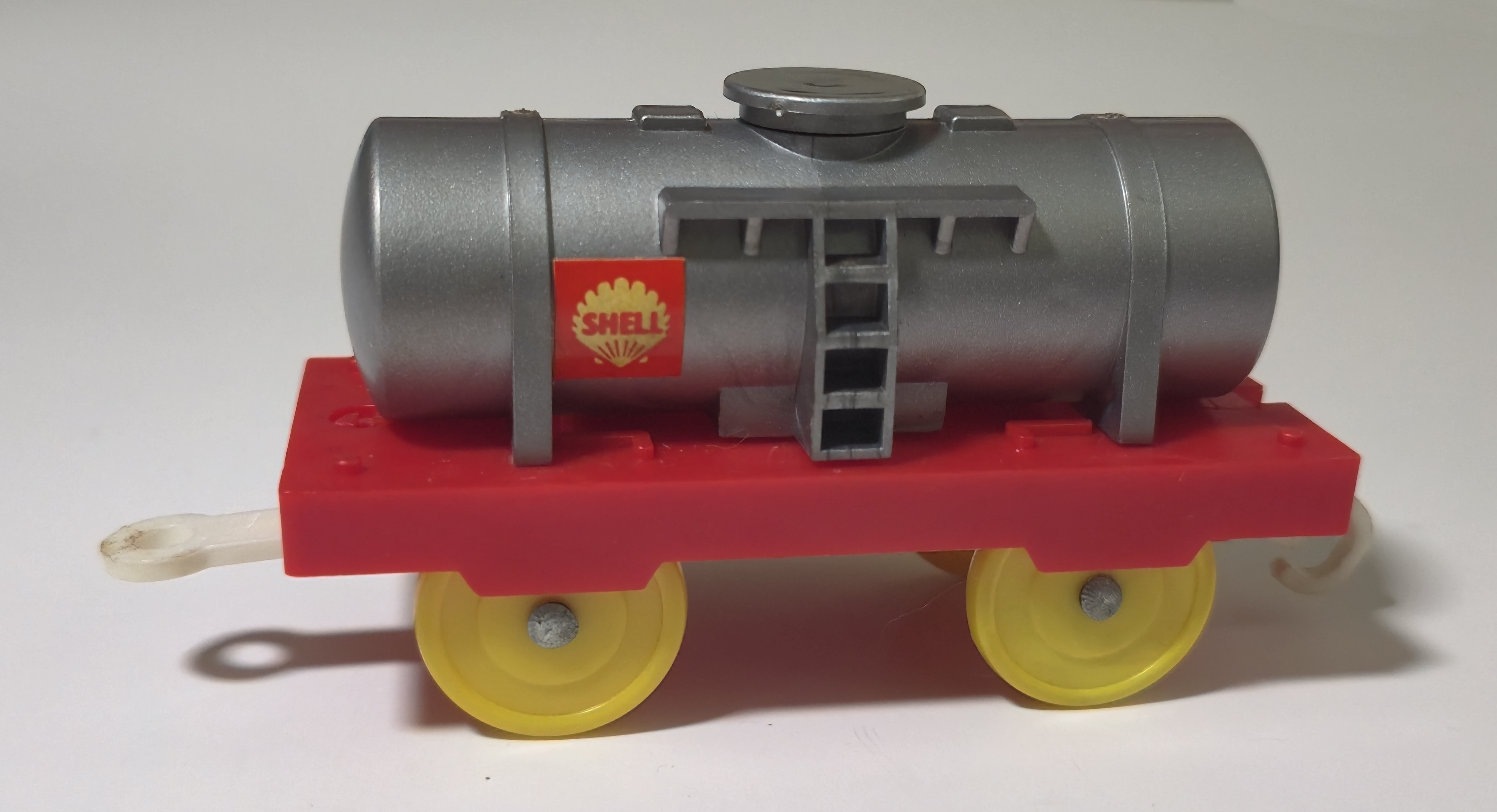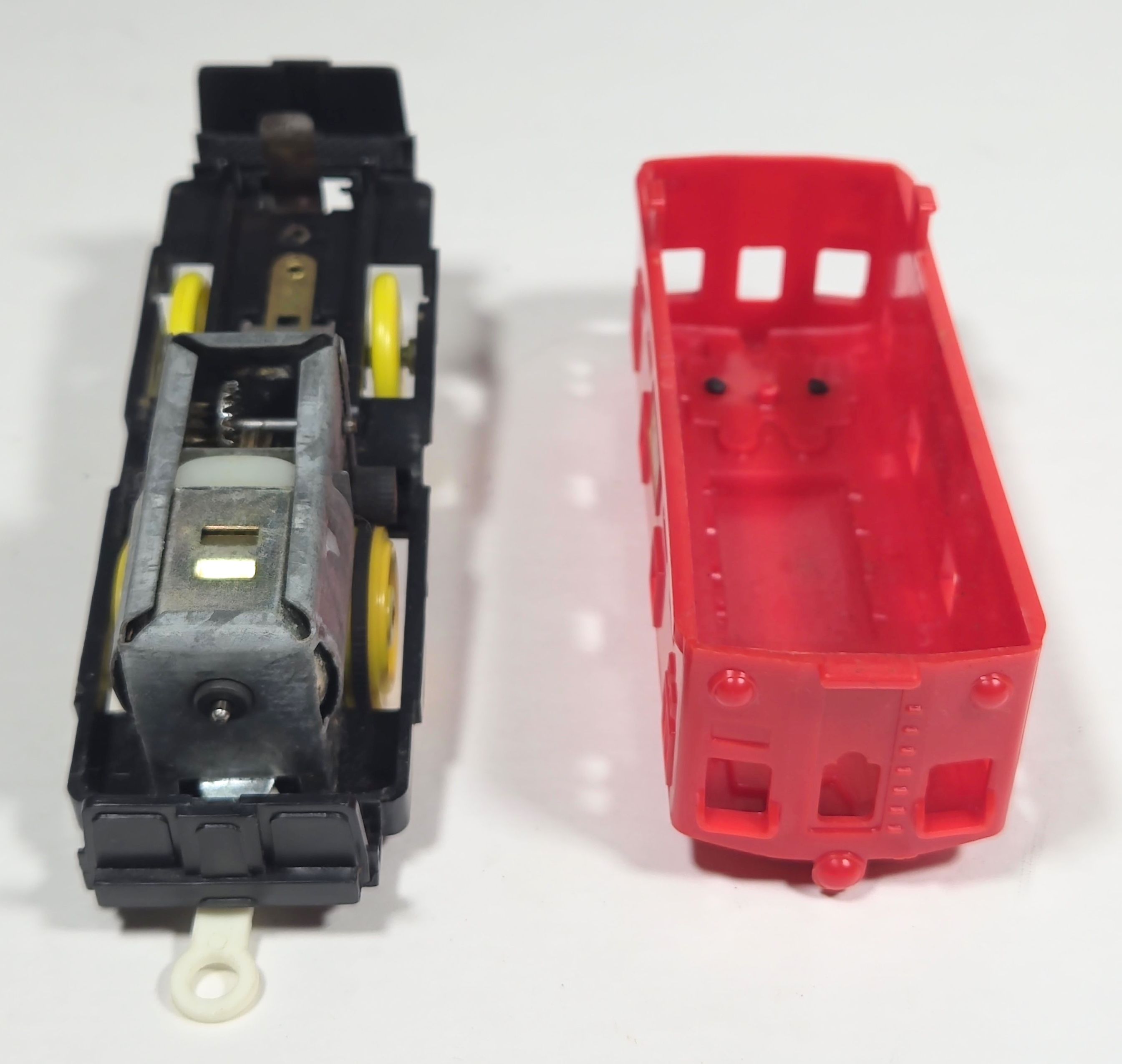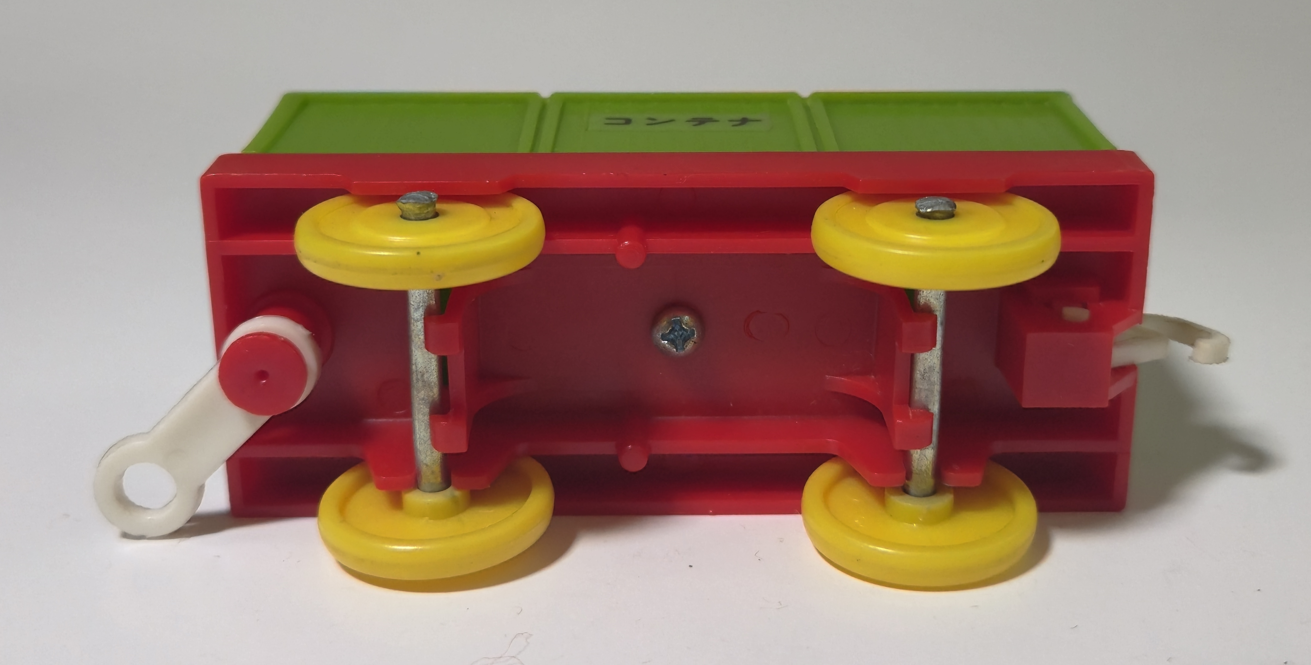 The freight cars are the early type with red chassis and yellow wheels, with the more fragile style of axle holders and plastic plugs holding the rear coupling in.