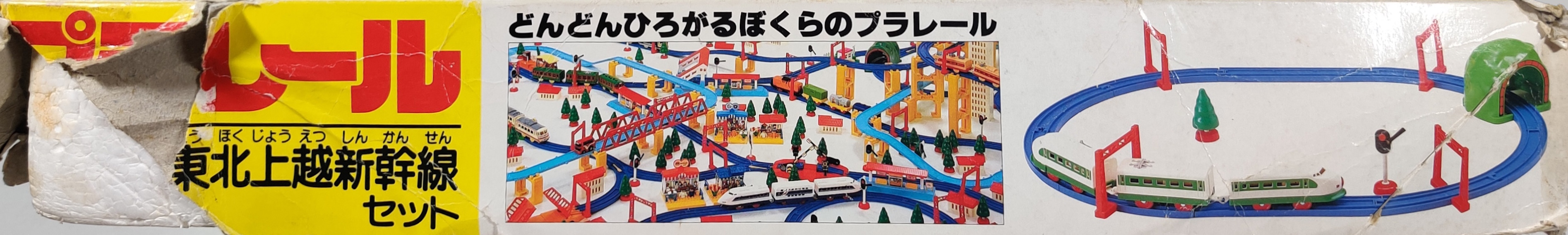 The Tohoku Joetsu Shinkansen with Light Set (ライト付東北上越新幹線セット) was released in 1987 and is a small Basic No.1 style set with an oval of track and 200 series Shinkansen. It is based on the Tohoku Joetsu Shinkansen Set from 1982. Even though this is a small set, the box still shows a wide range of Plarail, Plaroad, and related toys - there are even some old power trains still hanging out on the layout, showing the period of the early new power era.
