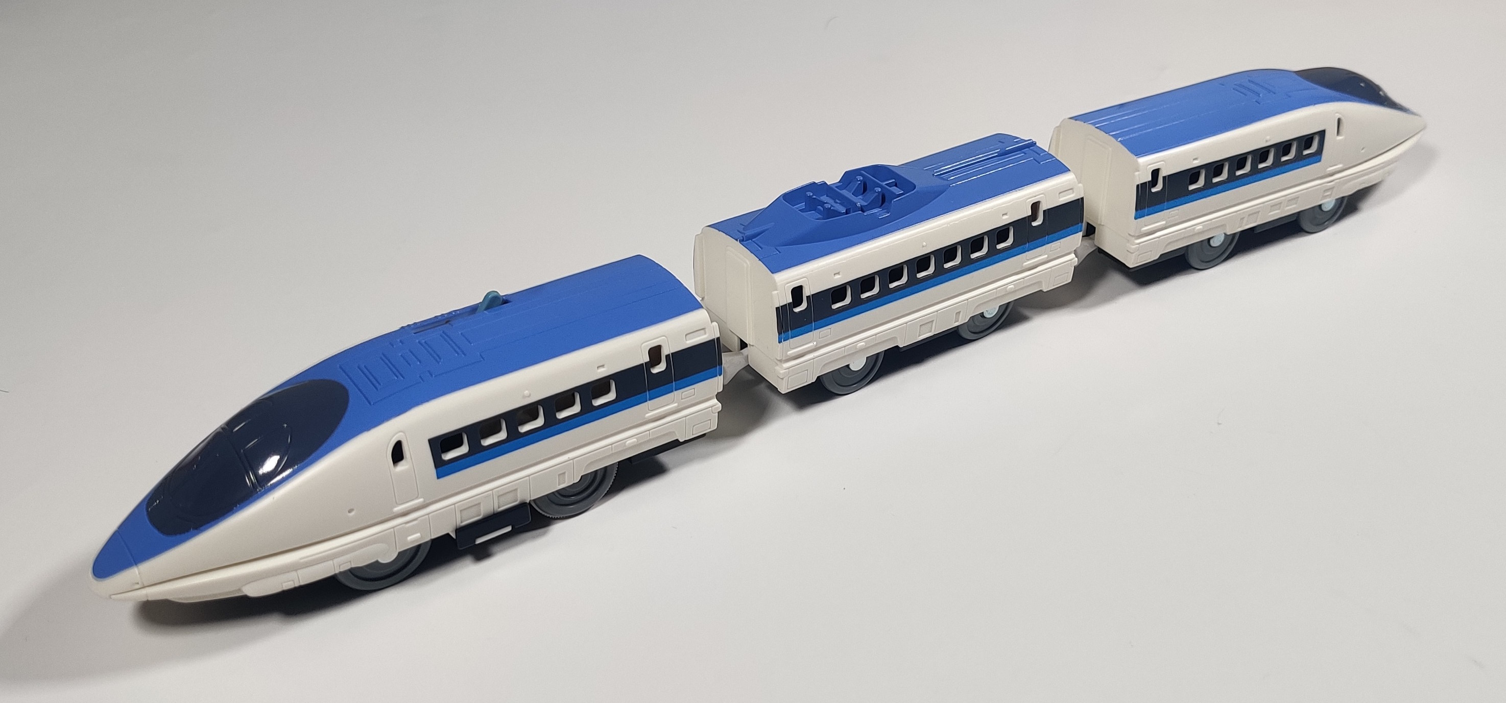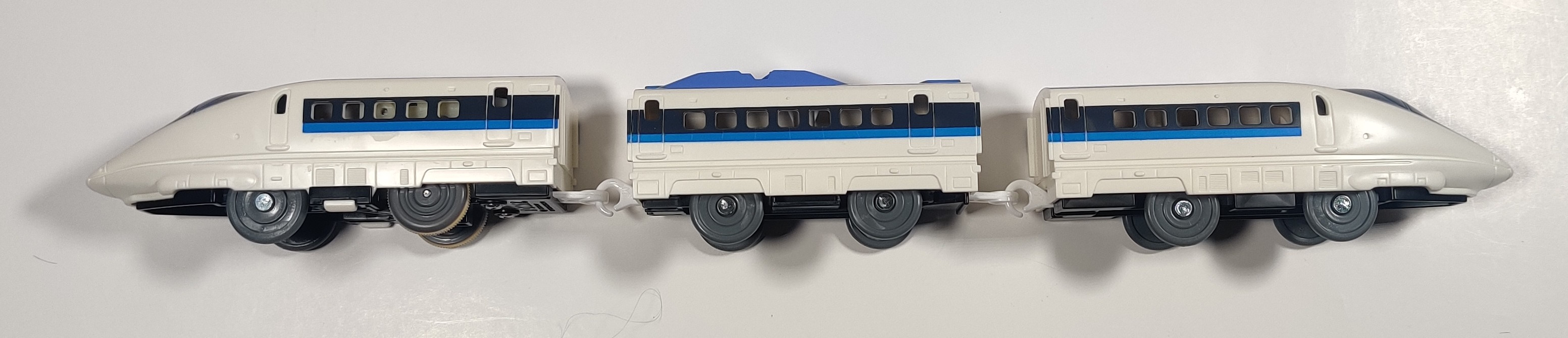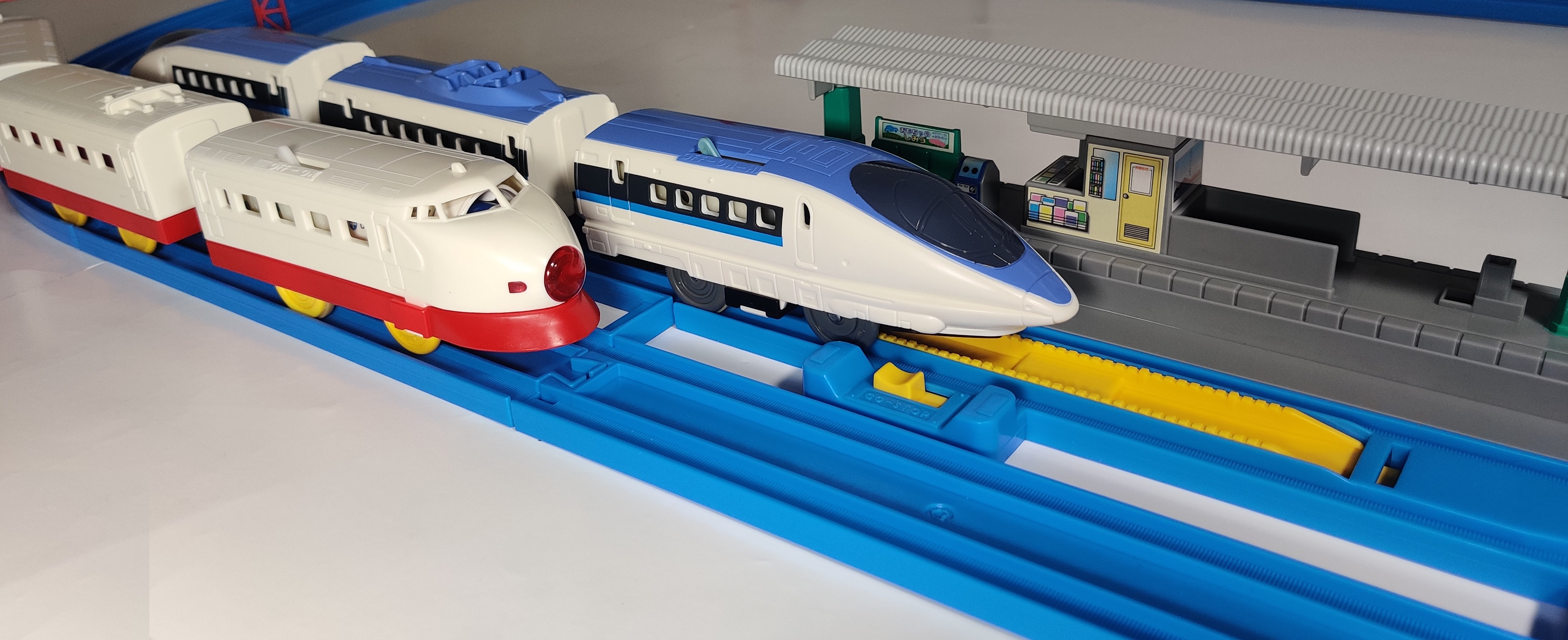 I am a big fan of the 0 series Shinkansen, the red and white Hikari, the Plarail double rail standard, and almost any set with two powered trains, so it is probably not surprising that I quite like this set. There are no smaller accessories other than the double track catenaries but they fit the idea of a two-track high speed line and the station and crossover switch are both nice.