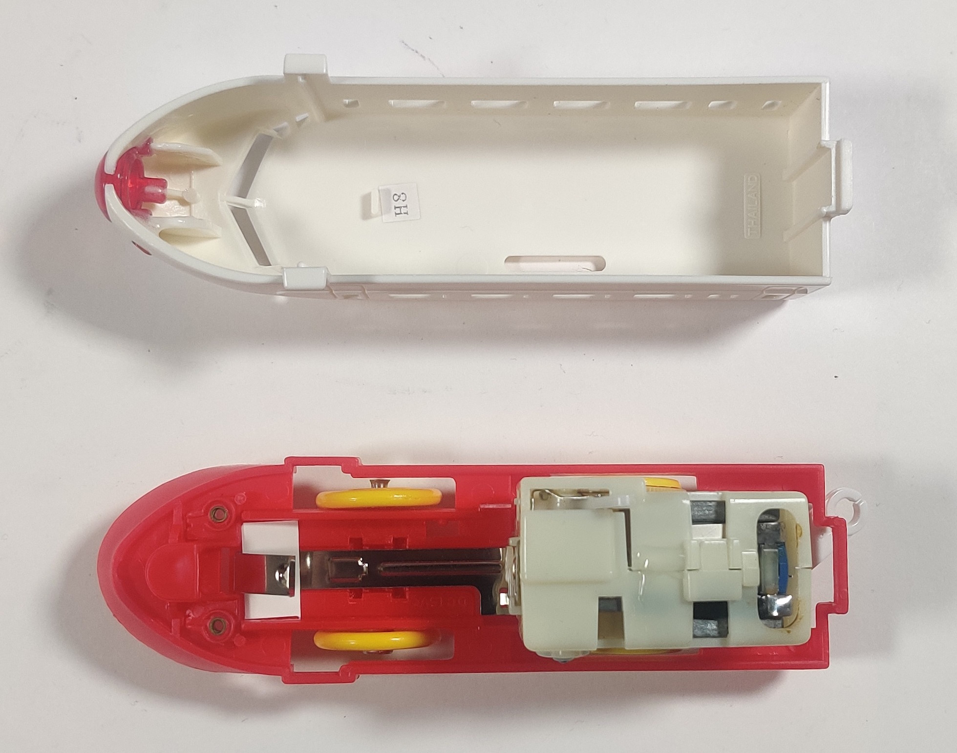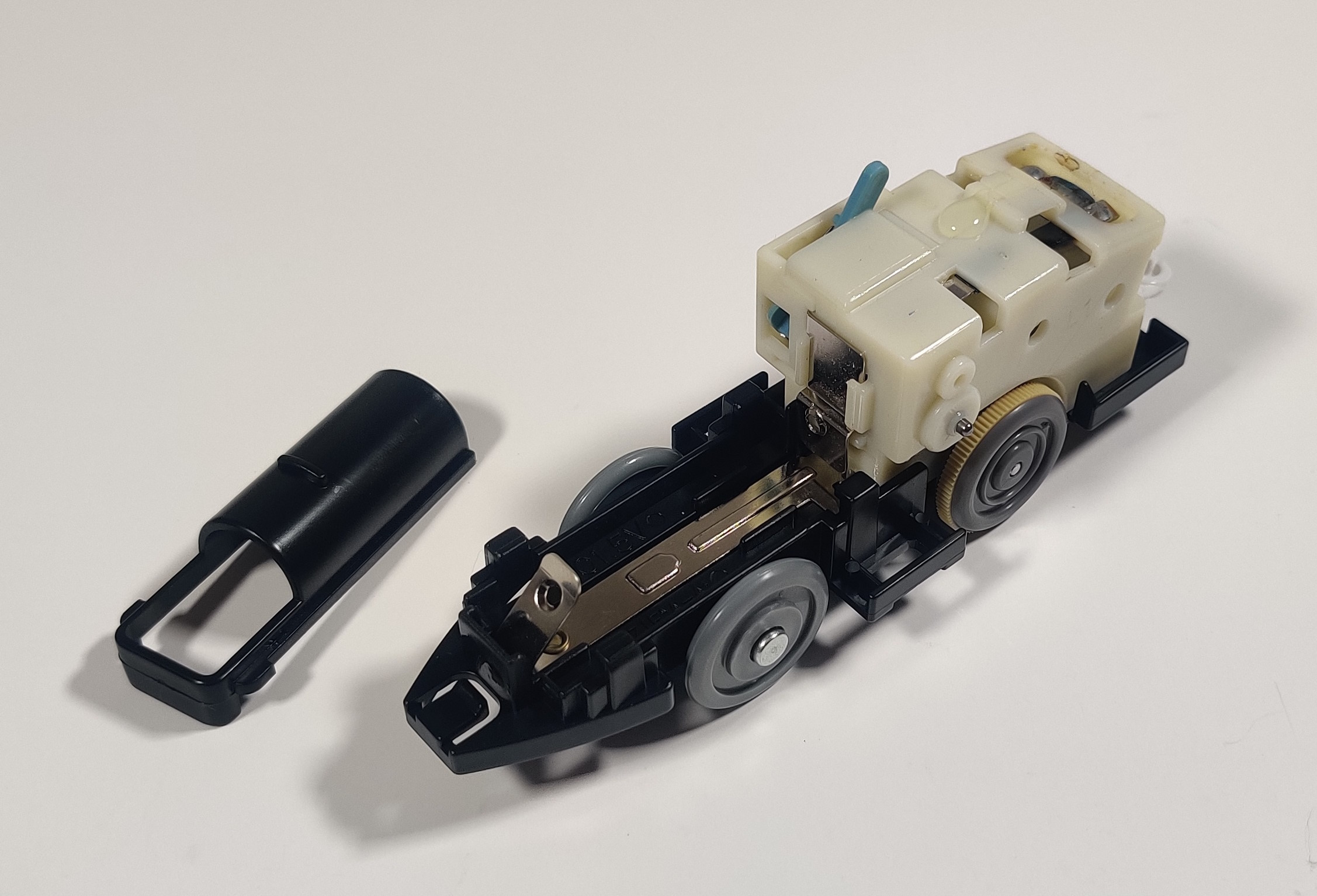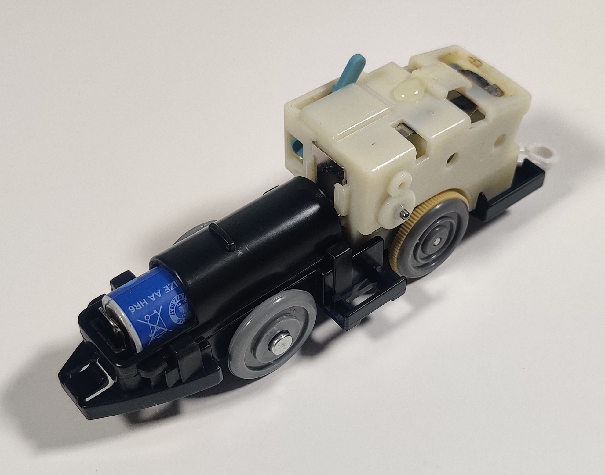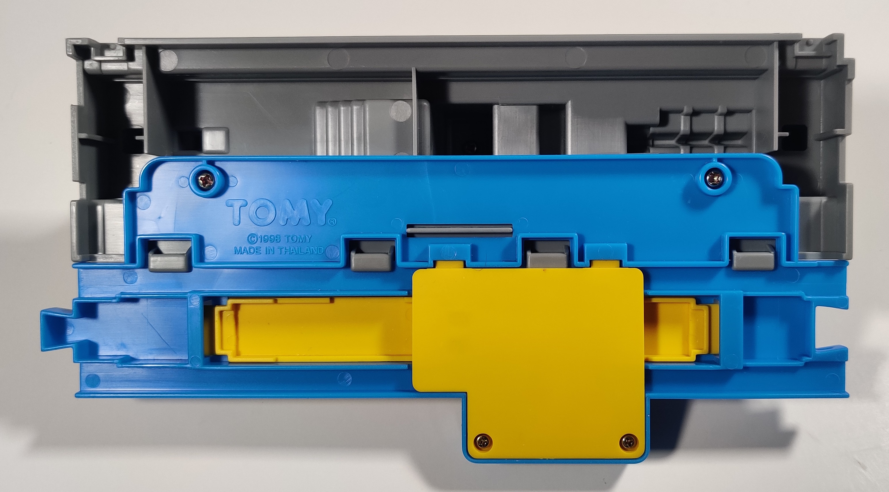 The Plarail 500 series was introduced in late 1996 and was one of the earlier standard Plarail trains to use a AA battery instead of the C battery that almost every Plarail train had used up to that point. The battery compartment includes a plastic cover insert that stops the battery from moving around inside the chassis which is held in by a tab at the front of the chassis. Depressing the tab allows the insert to be slid forward and removed. The gearbox is a period two-speed new power gearbox with blue power switch. The 500 series in my copy of the set was manufactured in August 1998.