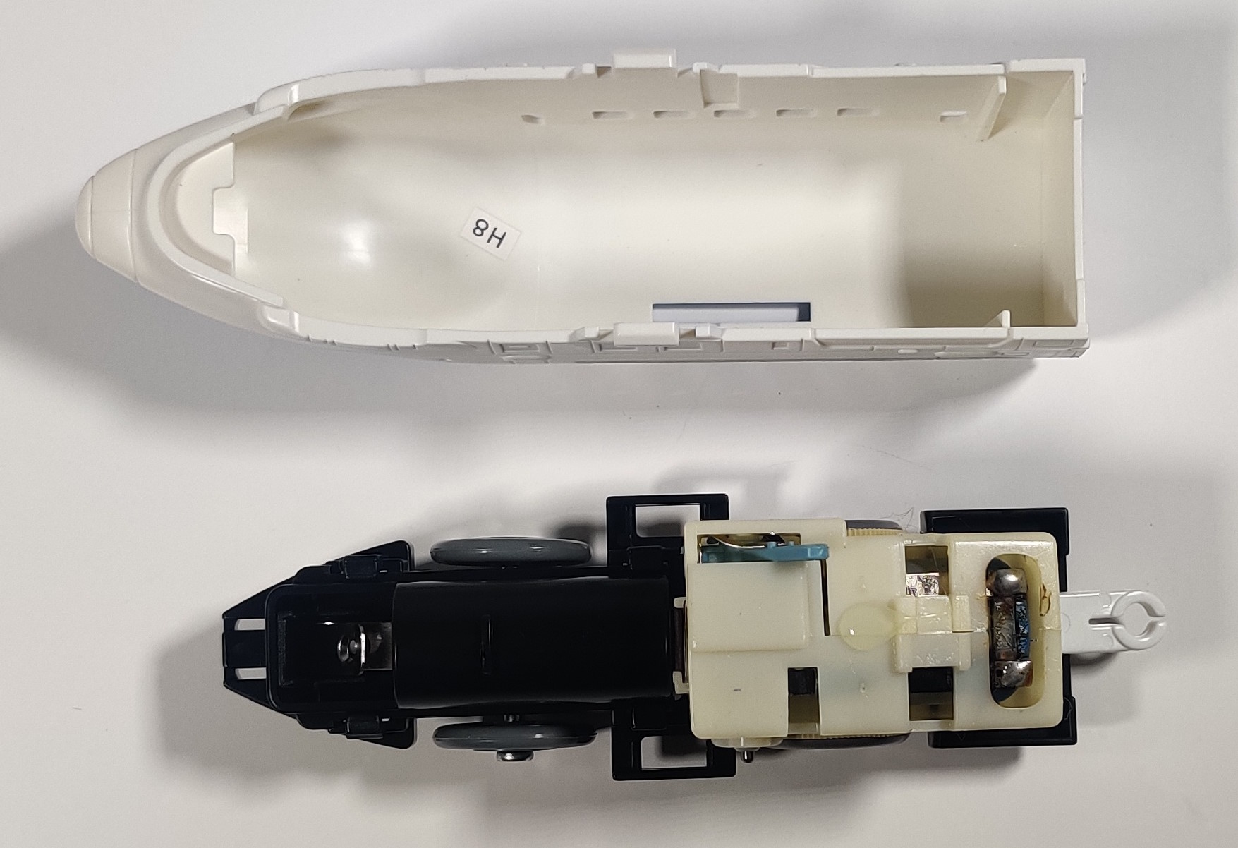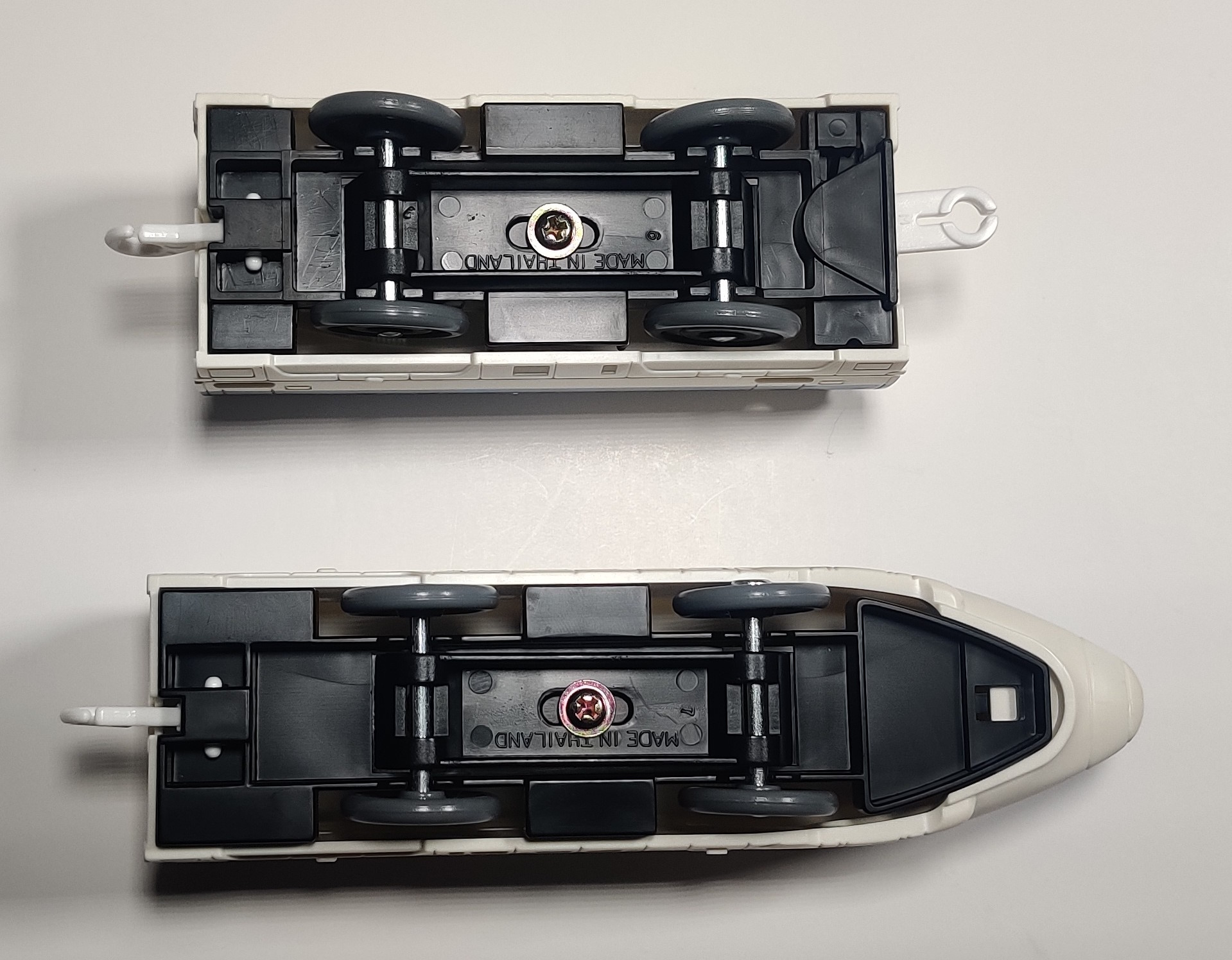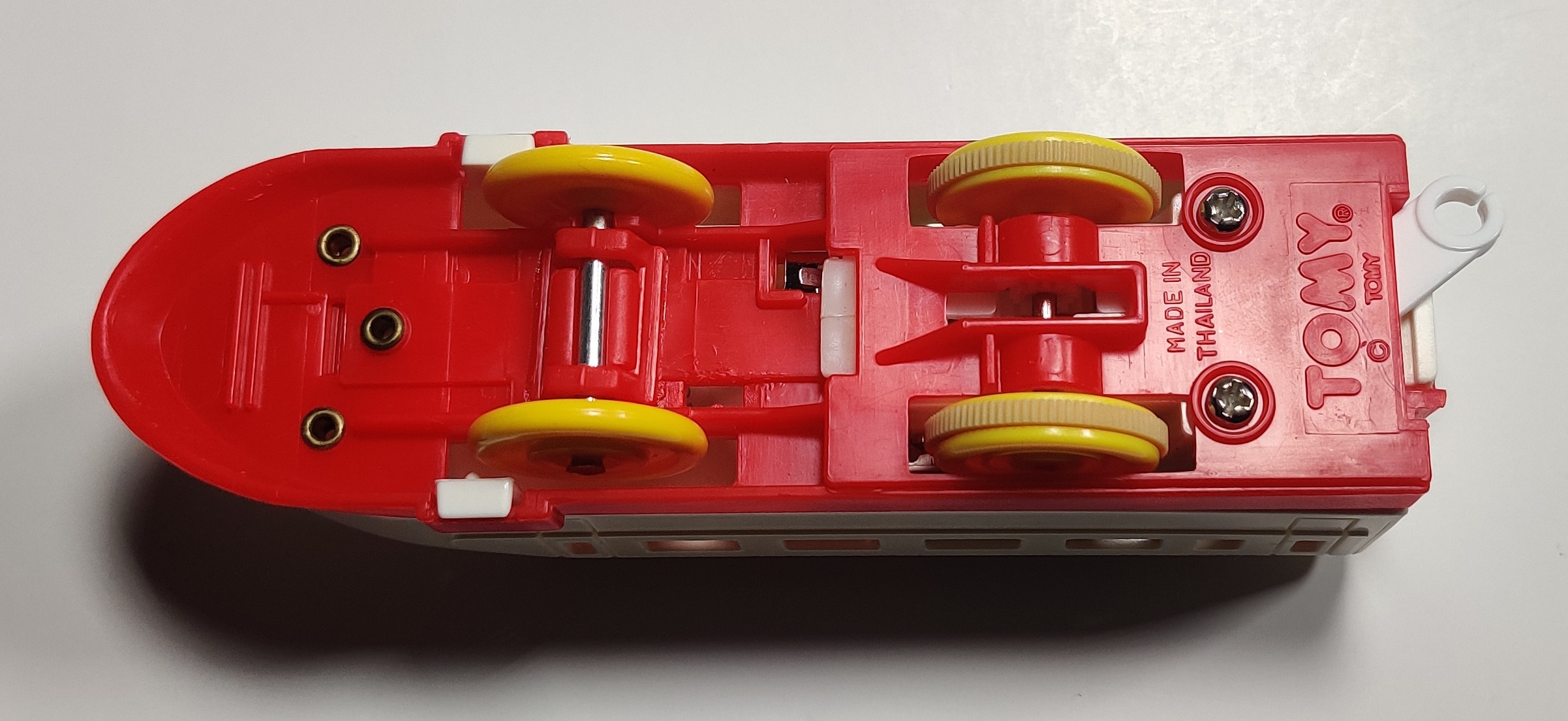 The front contact strip has a white sticker over the front rivet, which is somewhat odd as it does nothing to cover the otherwise exposed contact strip running down the chassis. The Hikari in my set was also manufactured in August 1998. The chassis is the updated version that reads made in Thailand instead of just Thailand. The intermediate and power car use descendants of the tooling for the mid 1980s radio control Hikari like the other new power 0 series trains.