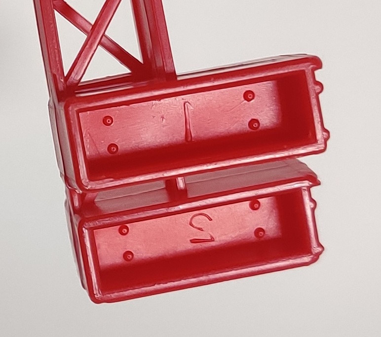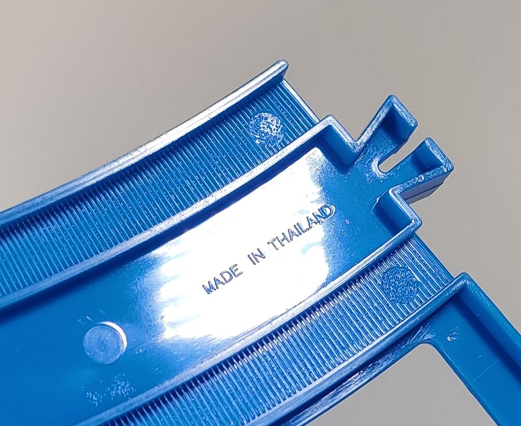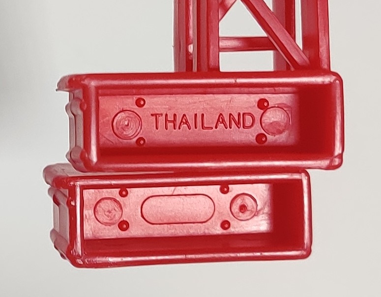 The double track catenaries are marked with slot marks on one side and Thailand on the other, with some slots having the text on one base or the other depending on where the Japan text was on the original mold before it was covered in the Thailand version.