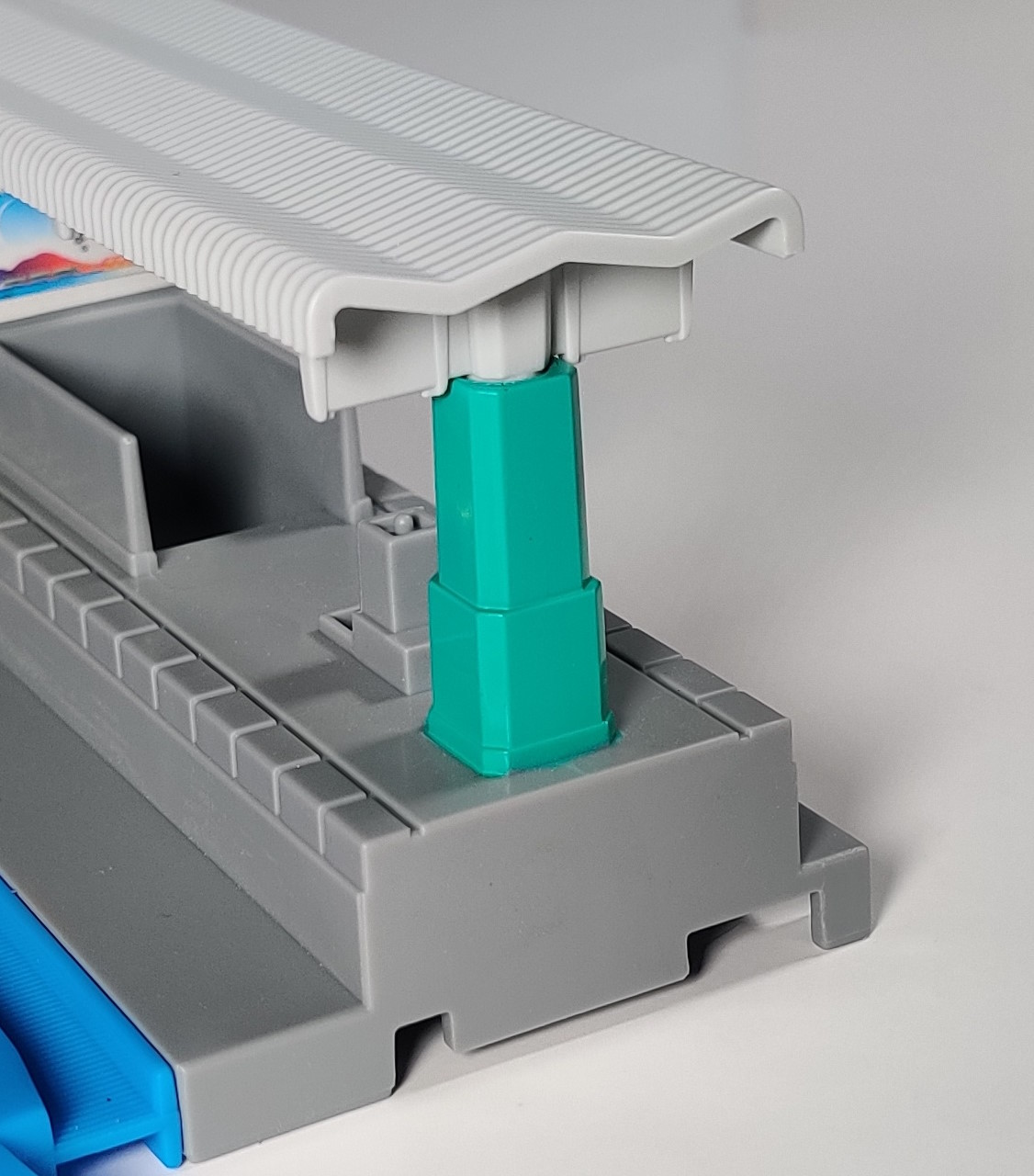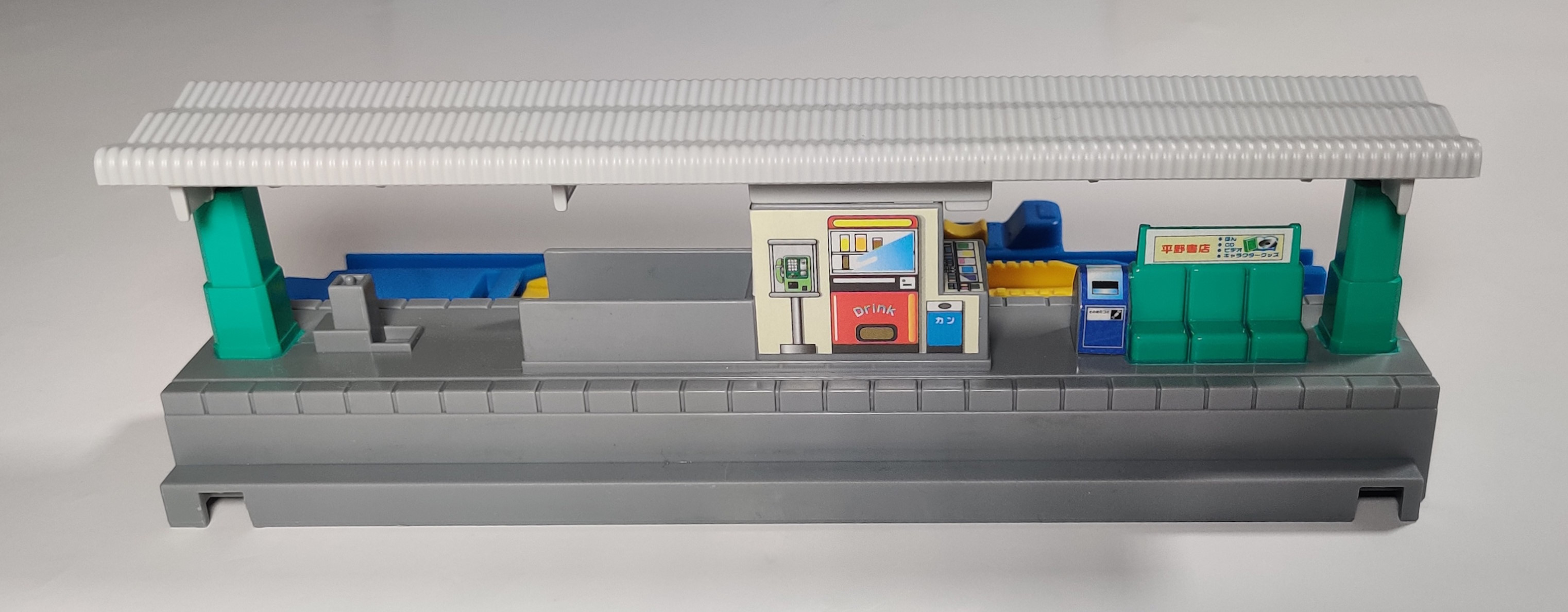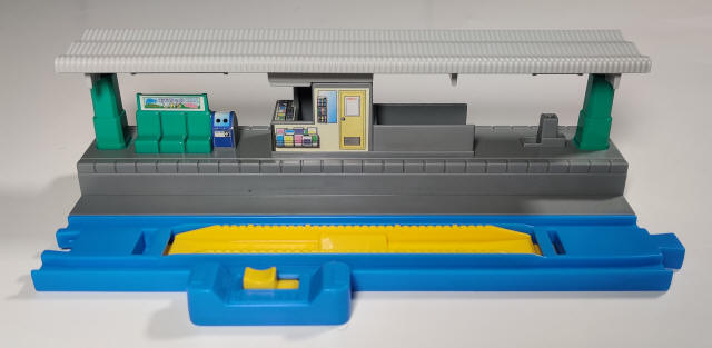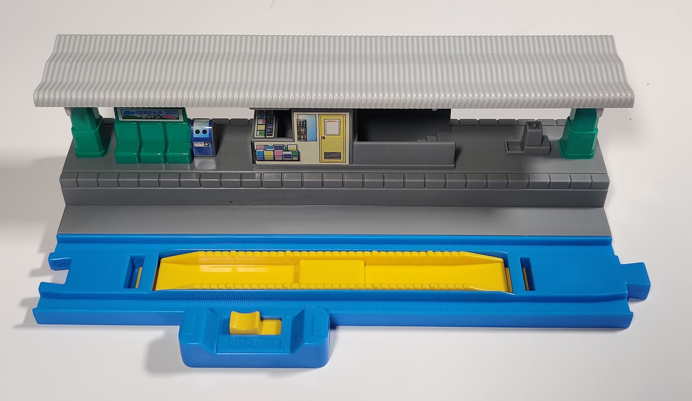 The station in this set seems to be the standard J-16 City Station and has the nice integrated stopper and ability to be used next to additional city stations as well as on top of double track bridge piers. The station has some nice stickers showing vending machines and other station details and the molding includes benches and stairs down to a theoretical lower level of the station.