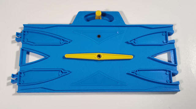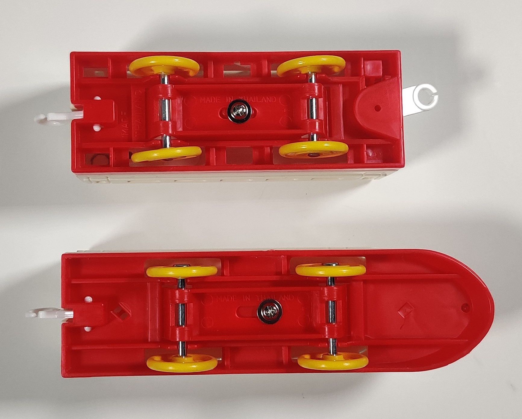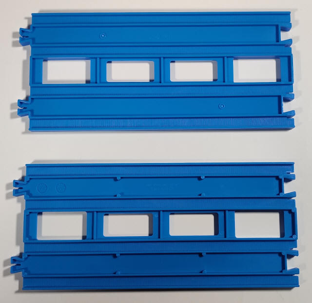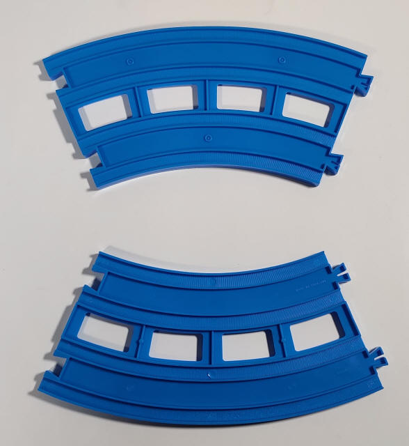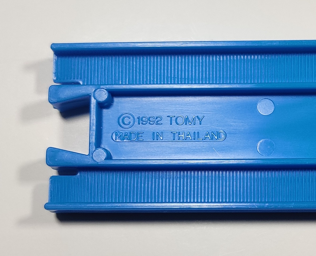 The track in this set is mostly double rail, with the curves being the updated Thailand version of an earlier set of Japanese molds and straight rails from the new-for-1998 tooling. The single normal straight rail is the Thailand update of the 1992 Japanese tooling.