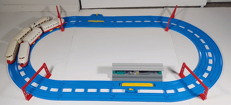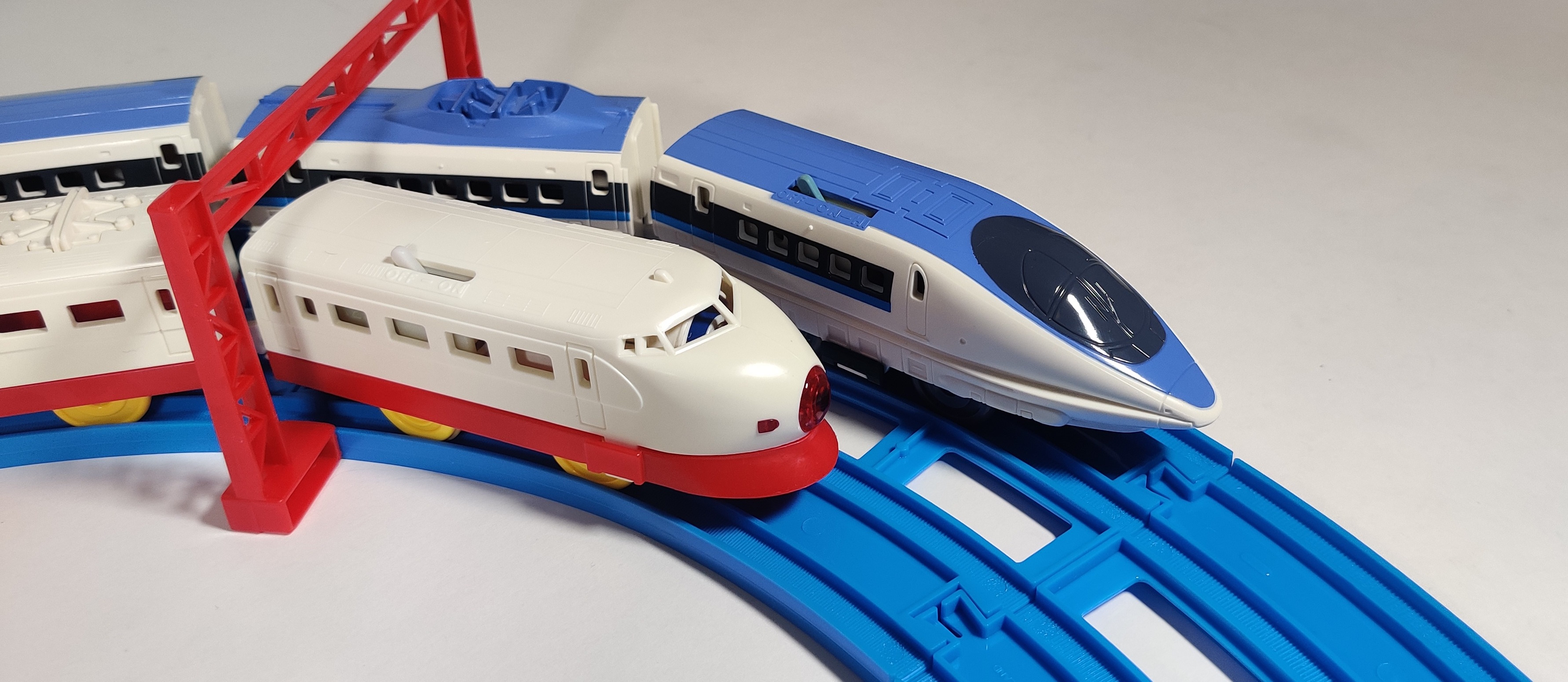 Having two complete three-car sets, one of which is a nice homage to the early days of Plarail, is pretty cool, and the endless loop double track layout is fun and has lots of useful double rail pieces. The single speed gearbox in my Hikari seems fairly quick and it about keeps pace with the two-speed 500 series at high speed.