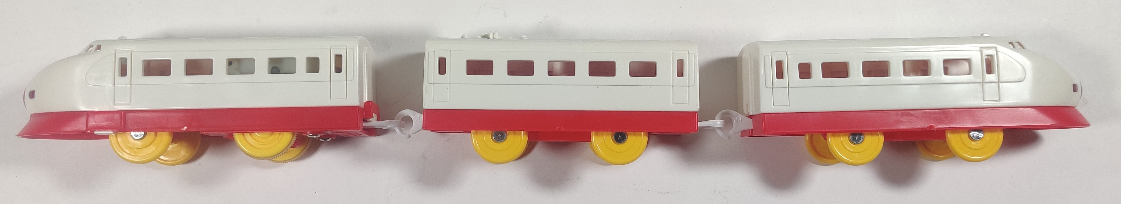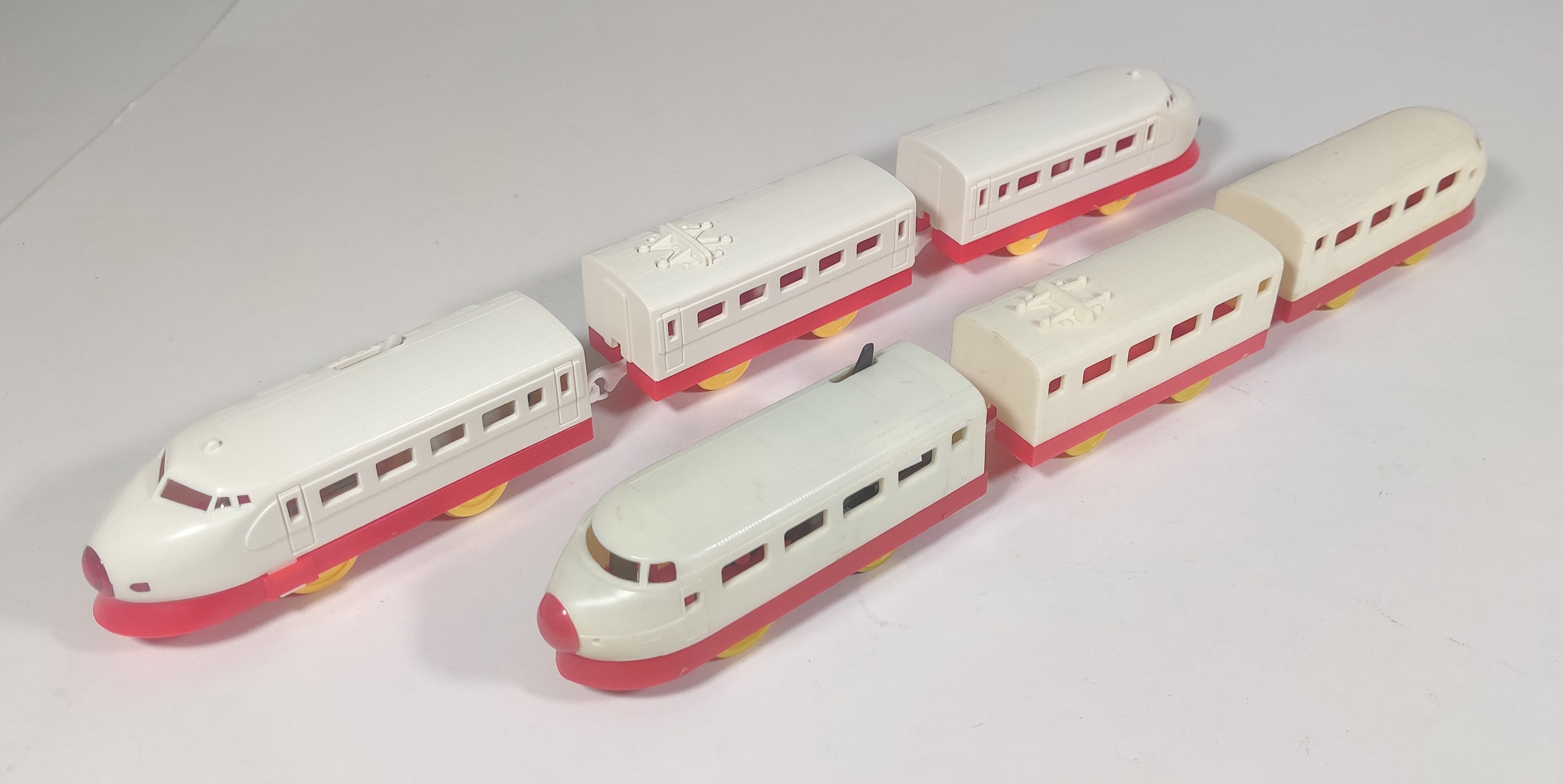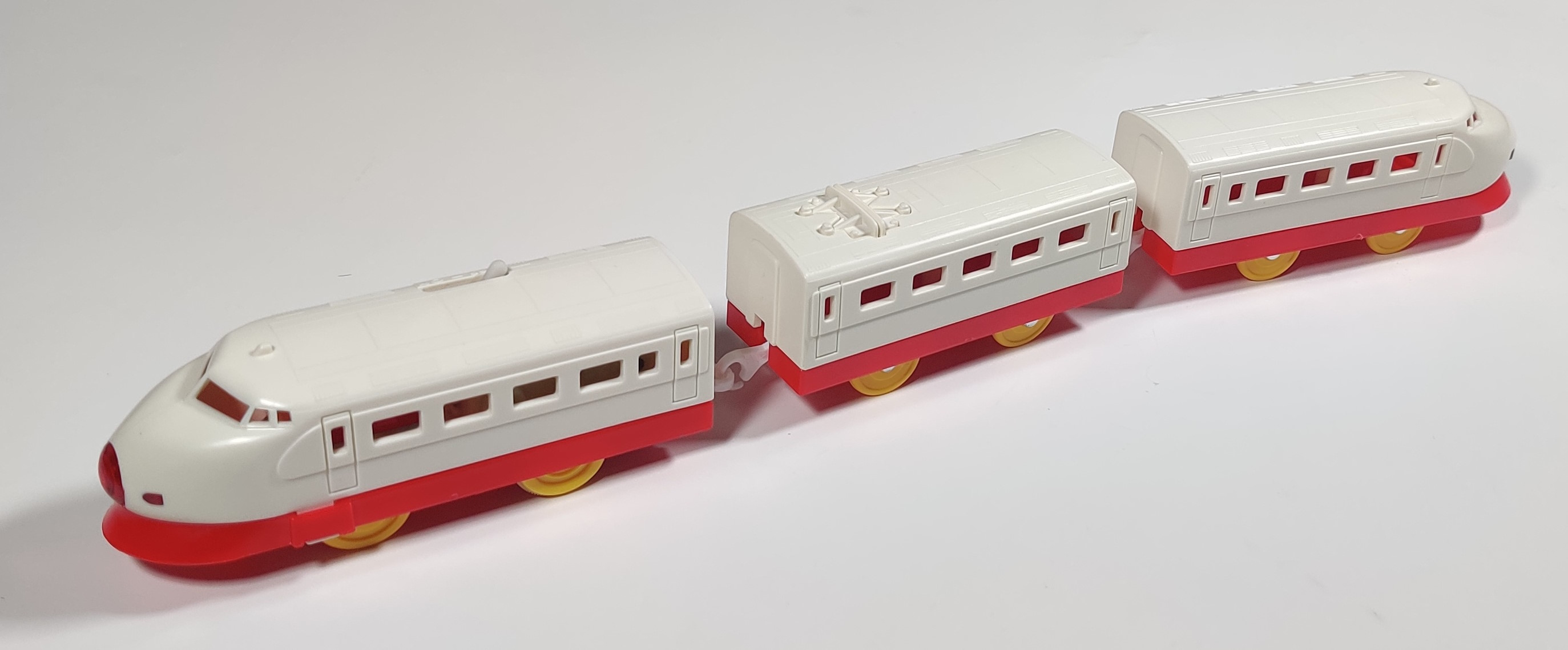 The other train in this set is a throwback Dream Super Express Hikari 0 series Shinkansen. The red and white color is a callback to the 1960s and early 1970s Electric Super Express Hikaris which used this color scheme instead of the real-life blue and white. The tooling used is the same as the new power Hikari with Light but without the light installed.