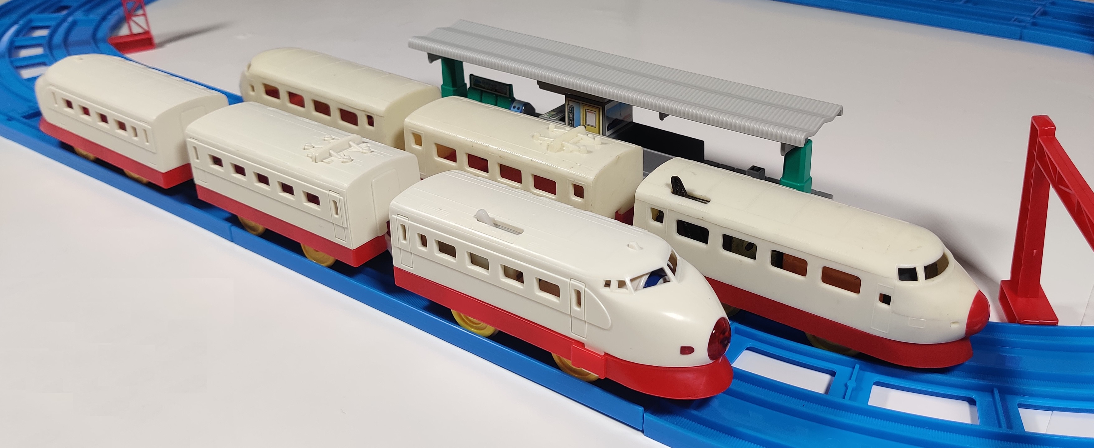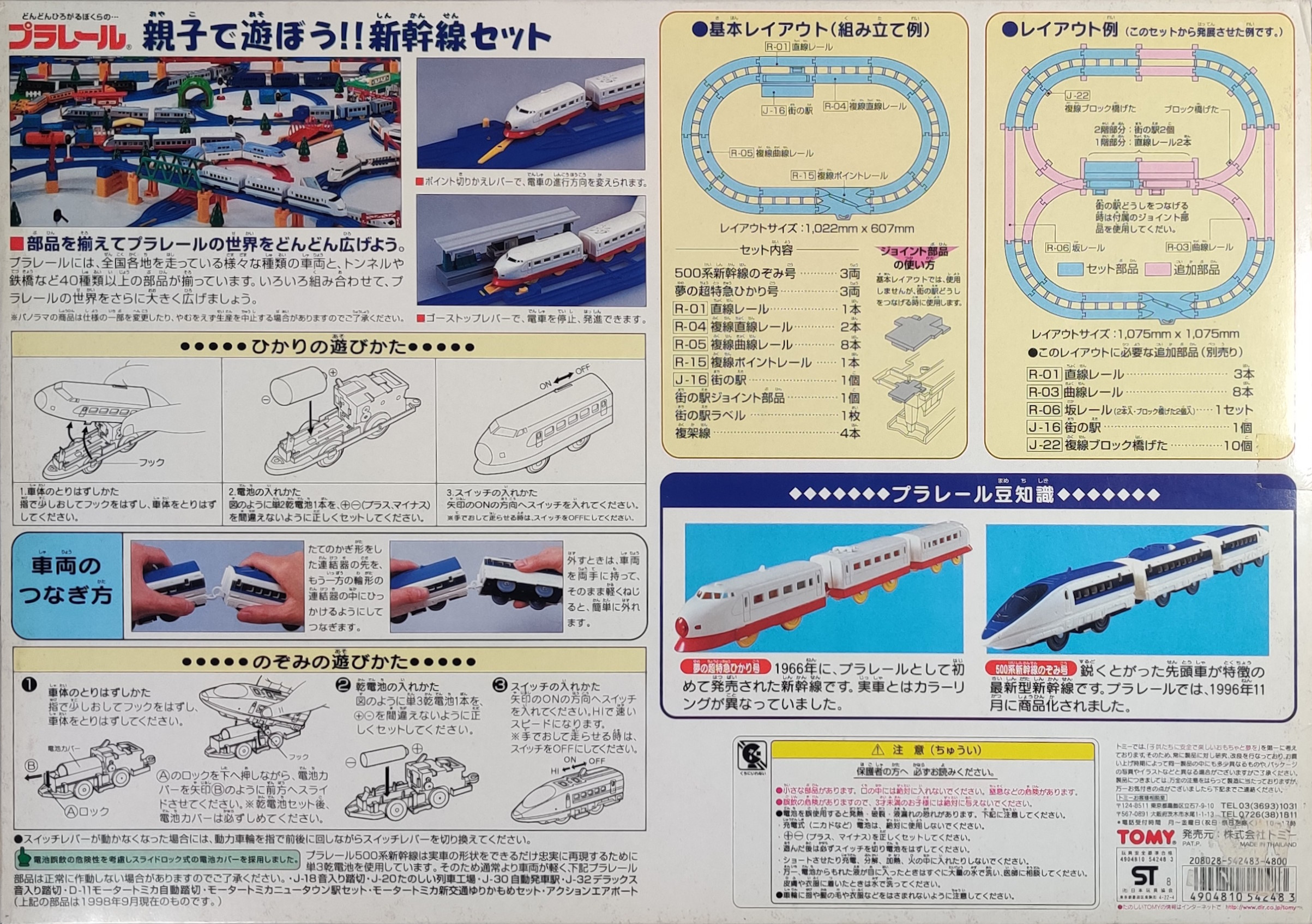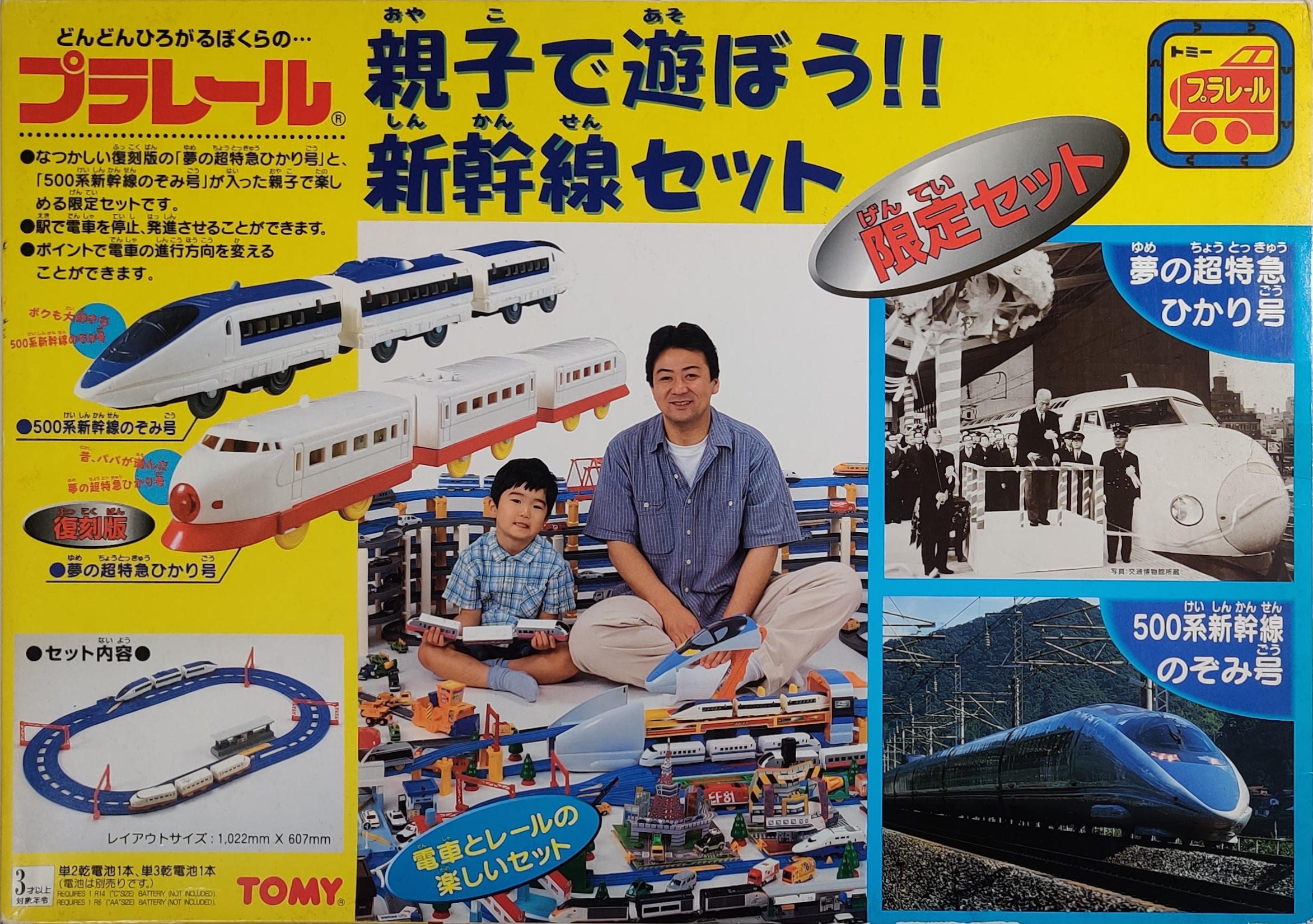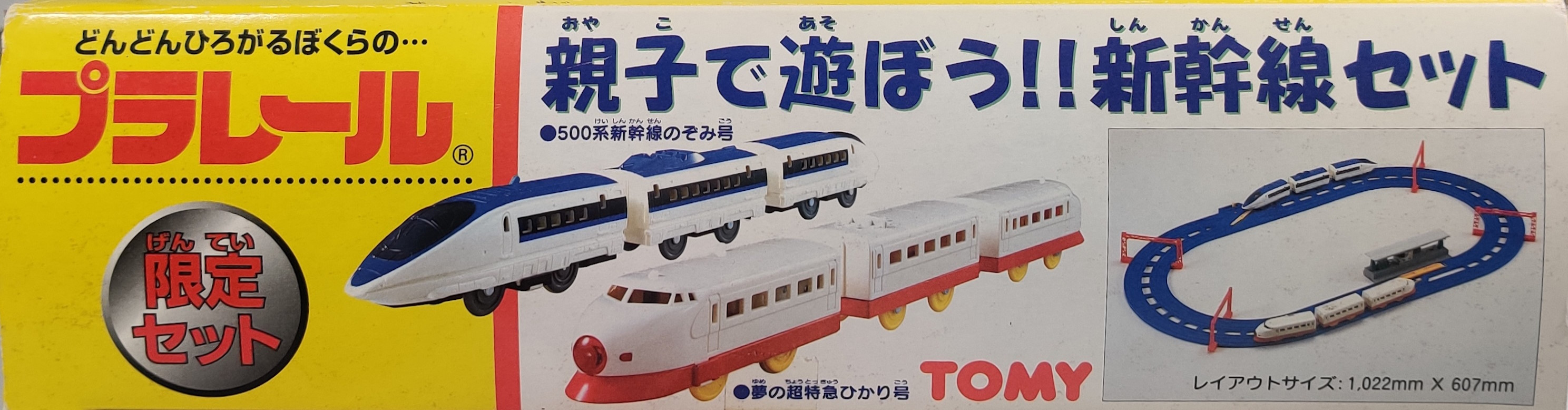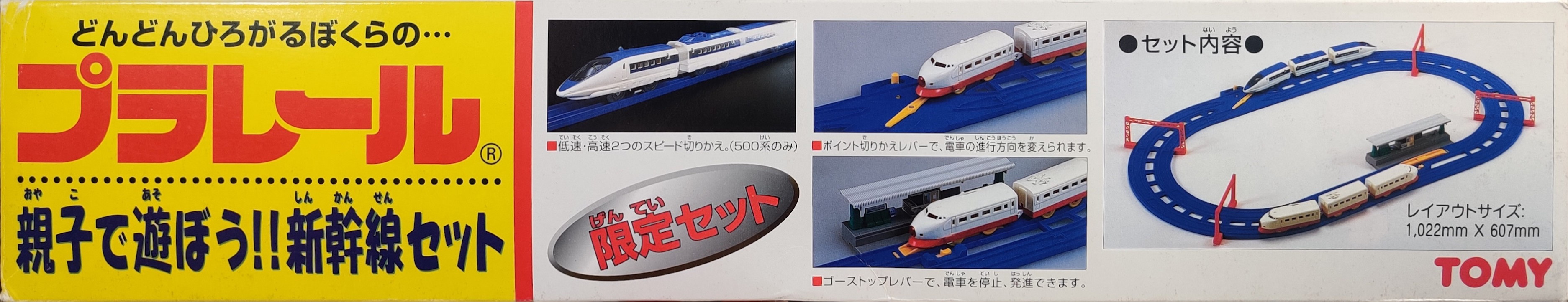 The Let's Play With Parents and Children!! Shinkansen Set (親子で遊ぼう!! 新幹線セット) was released in 1999 in part to commemorate 40 years of Plarail. The set includes the 500 series Shinkansen which was the newest Shinkansen running on the original Tokaido shinkansen line when the set was designed as well as a new power version of the red and white 1960s Electric Super Express Hikari using the new power Hikari with Light tooling. The layout is a double track endless loop with station and crossover switch. As the name of the set implies, the throwback red and white Hikari is intended to represent the Plarails that a child's parents might have played with years prior and the double track layout and two powered trains let a parent and child easily play with the set together.