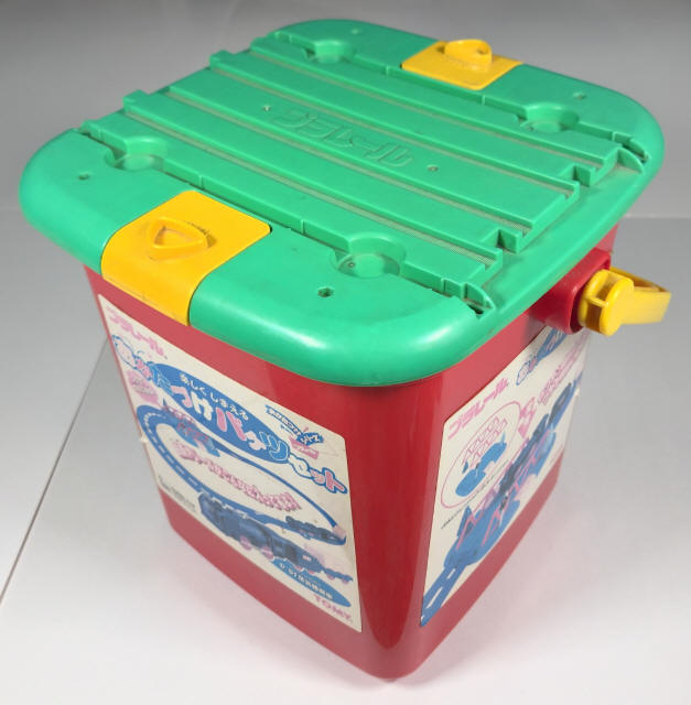 The 2000 Cleaning Bucket Set (おかたづけバケツセット) was the first of several "bucket sets" released in plastic buckets that the sets could easily be picked up and put away in - boxes that could fit track and trains also appeared around this time, and the lids of the buckets and cases was often usable as an accessory or accessory base. This set includes a partially double-rail loop with stop rail and a D-51 steam locomotive with tender and container car.