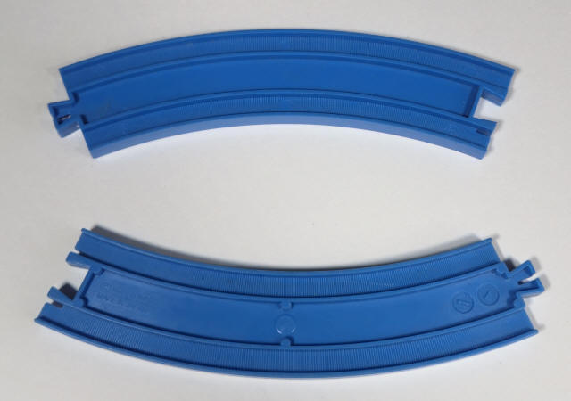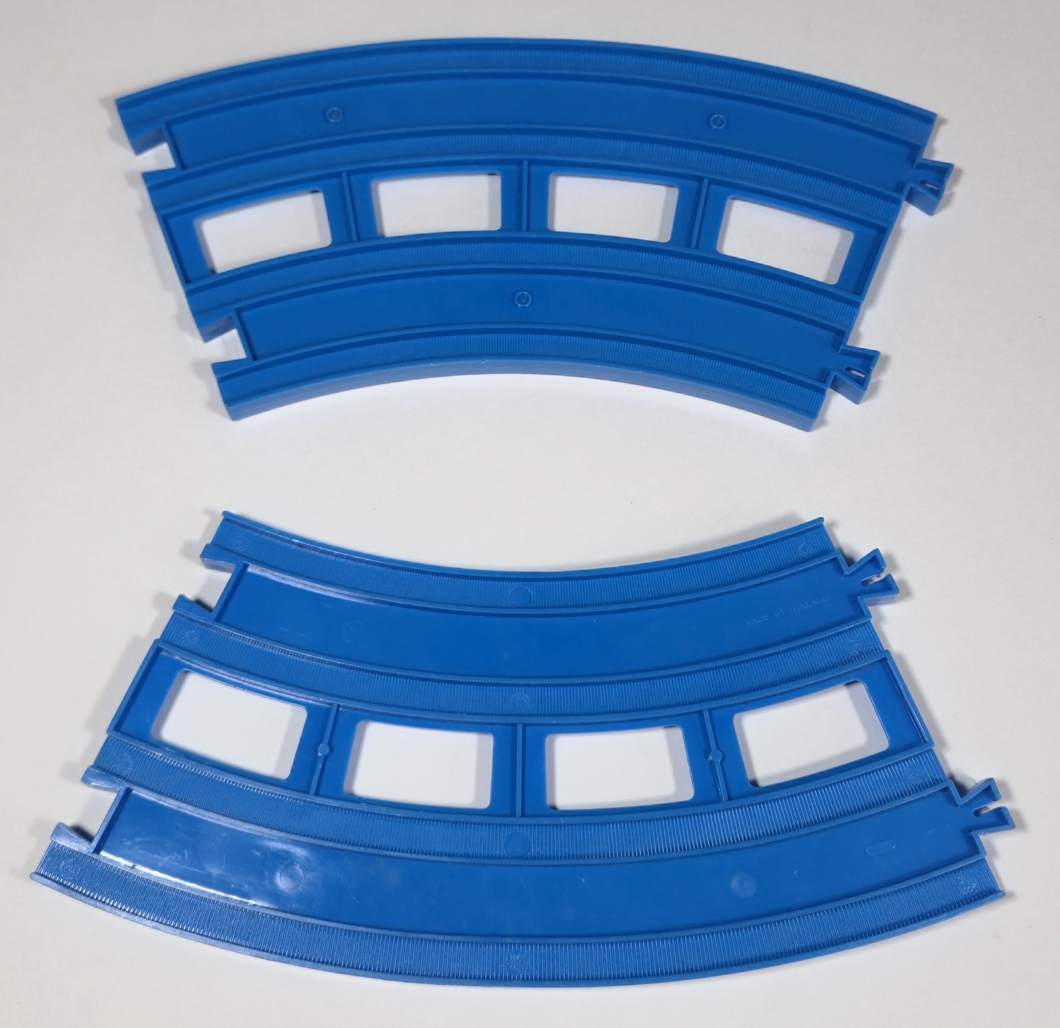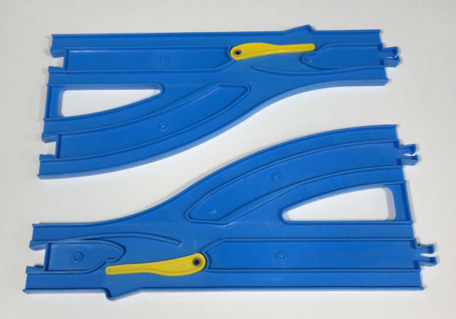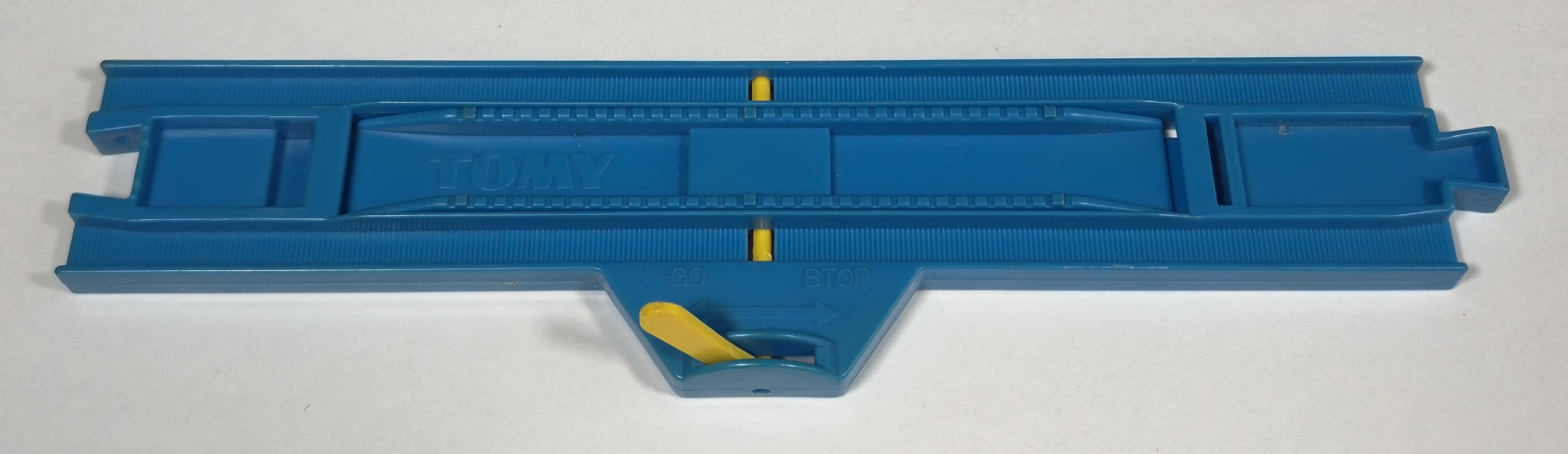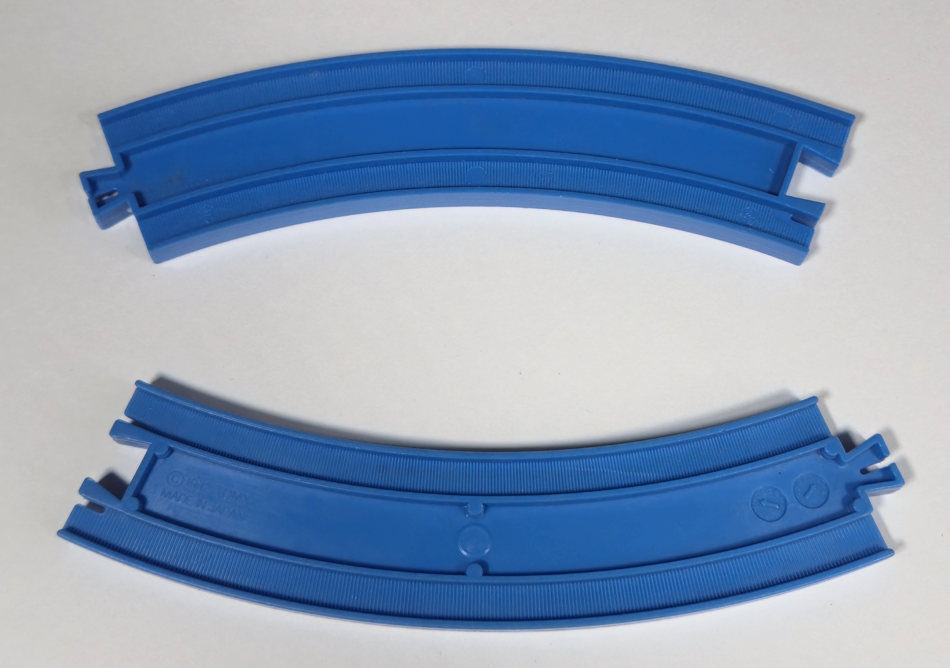 The track selection is actually pretty nice for a "small" set, with a double-track section and single/double point rails as well as a stop rail to stop the train. The curves are the old Japanese toolings that had been updated for Thailand production and the switches are also old toolings with some text modifications over time. These predate the practice of putting the squared-off Tomy logo in many track toolings - I don't think it was introduced until later in 2000.