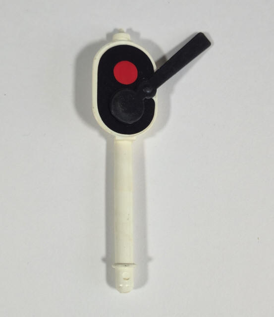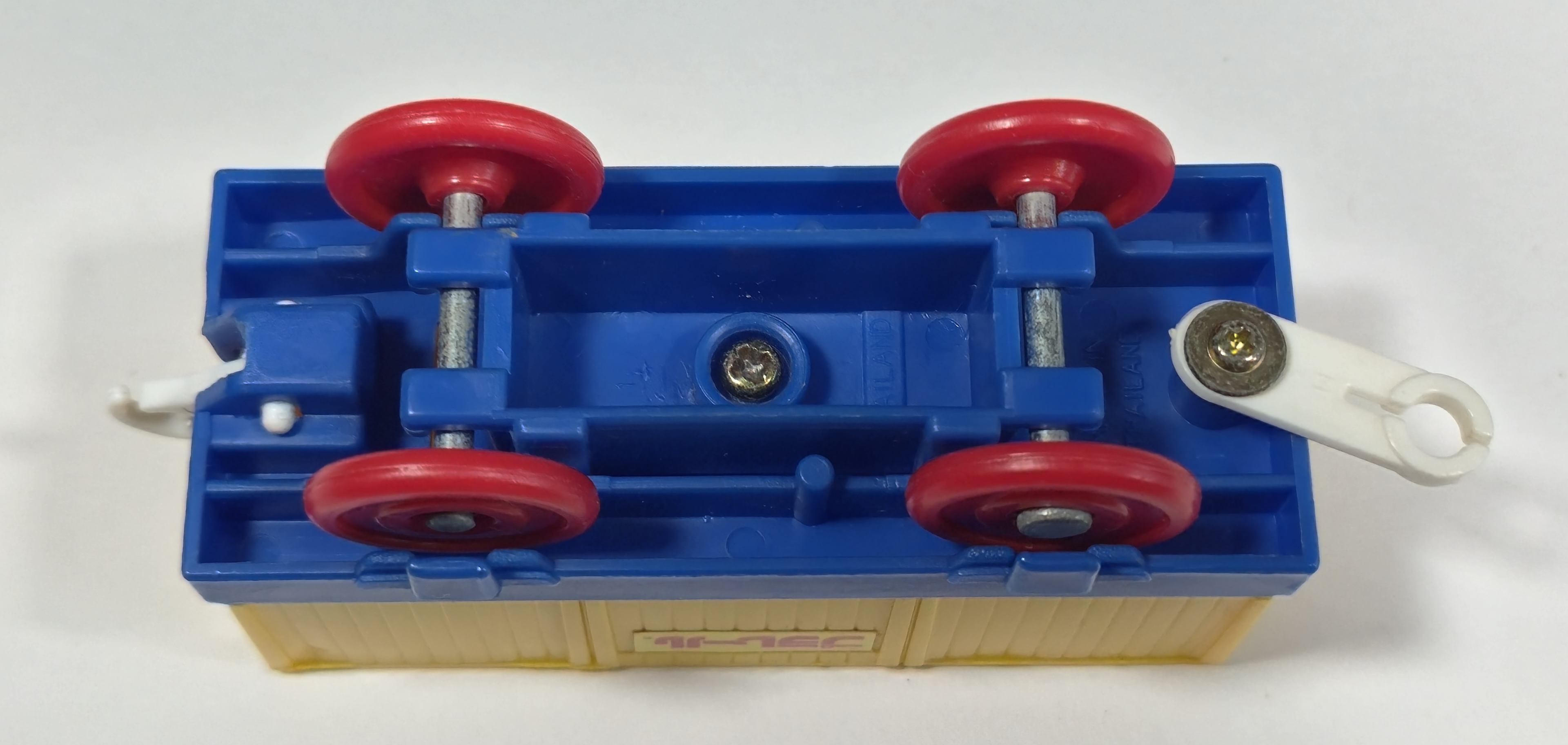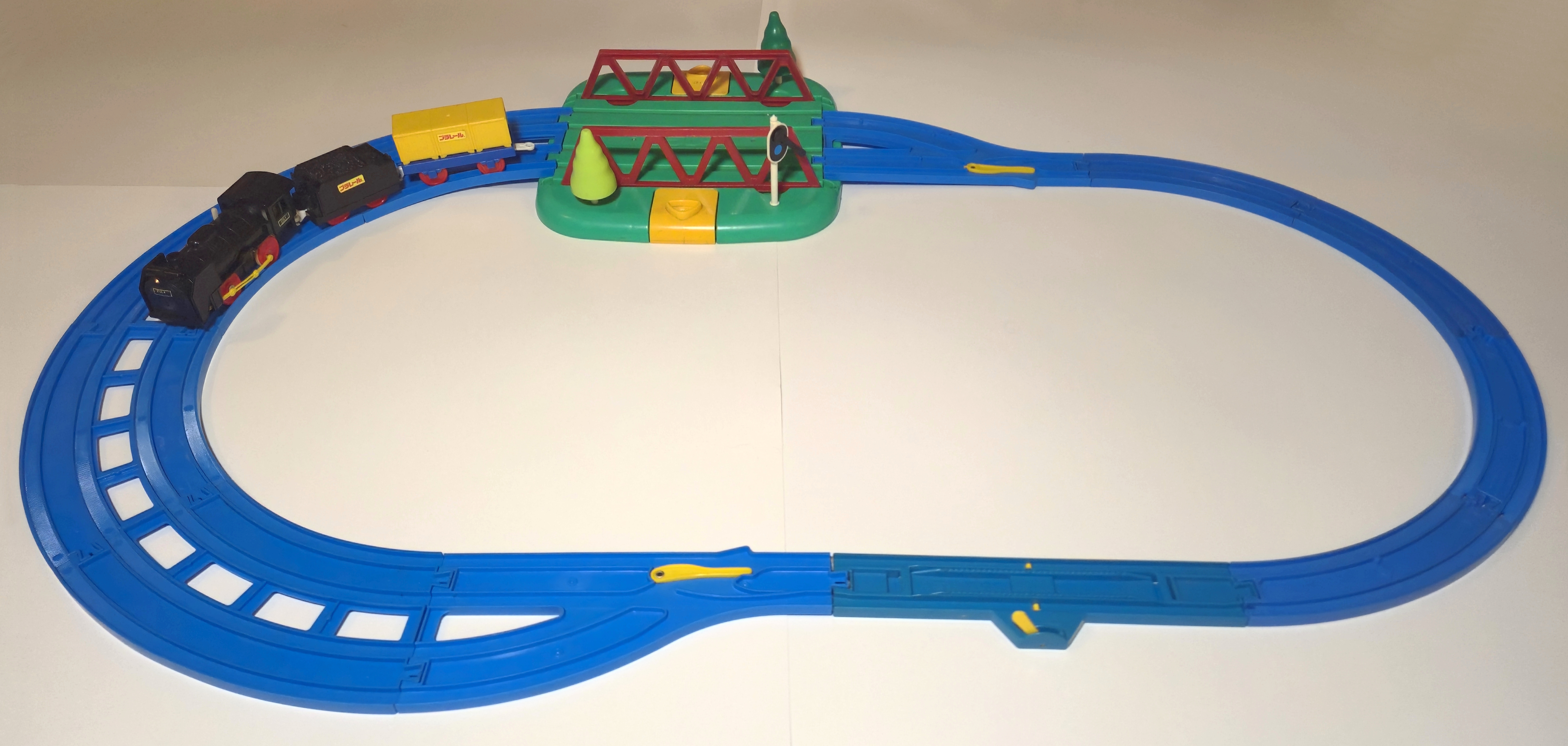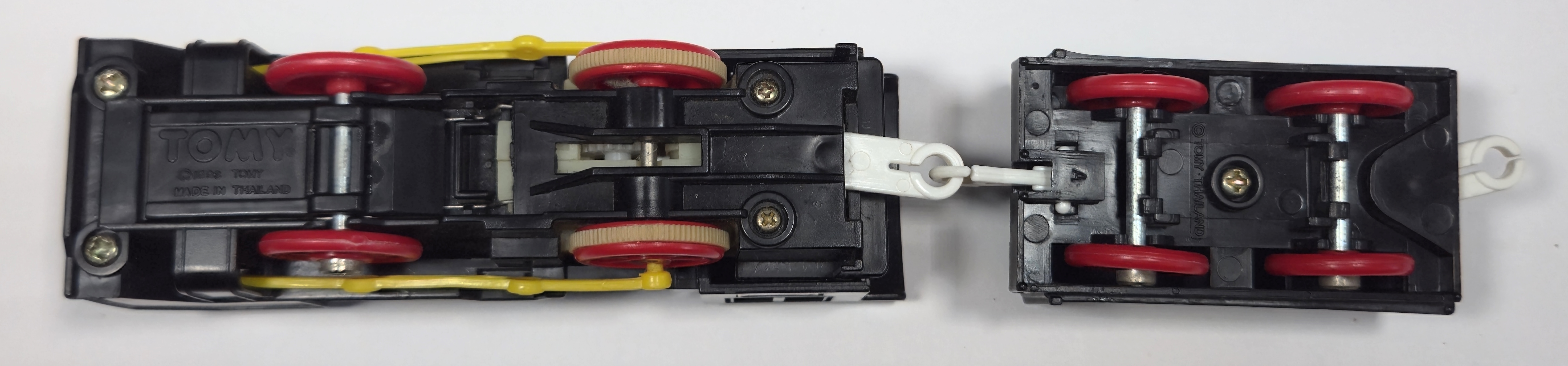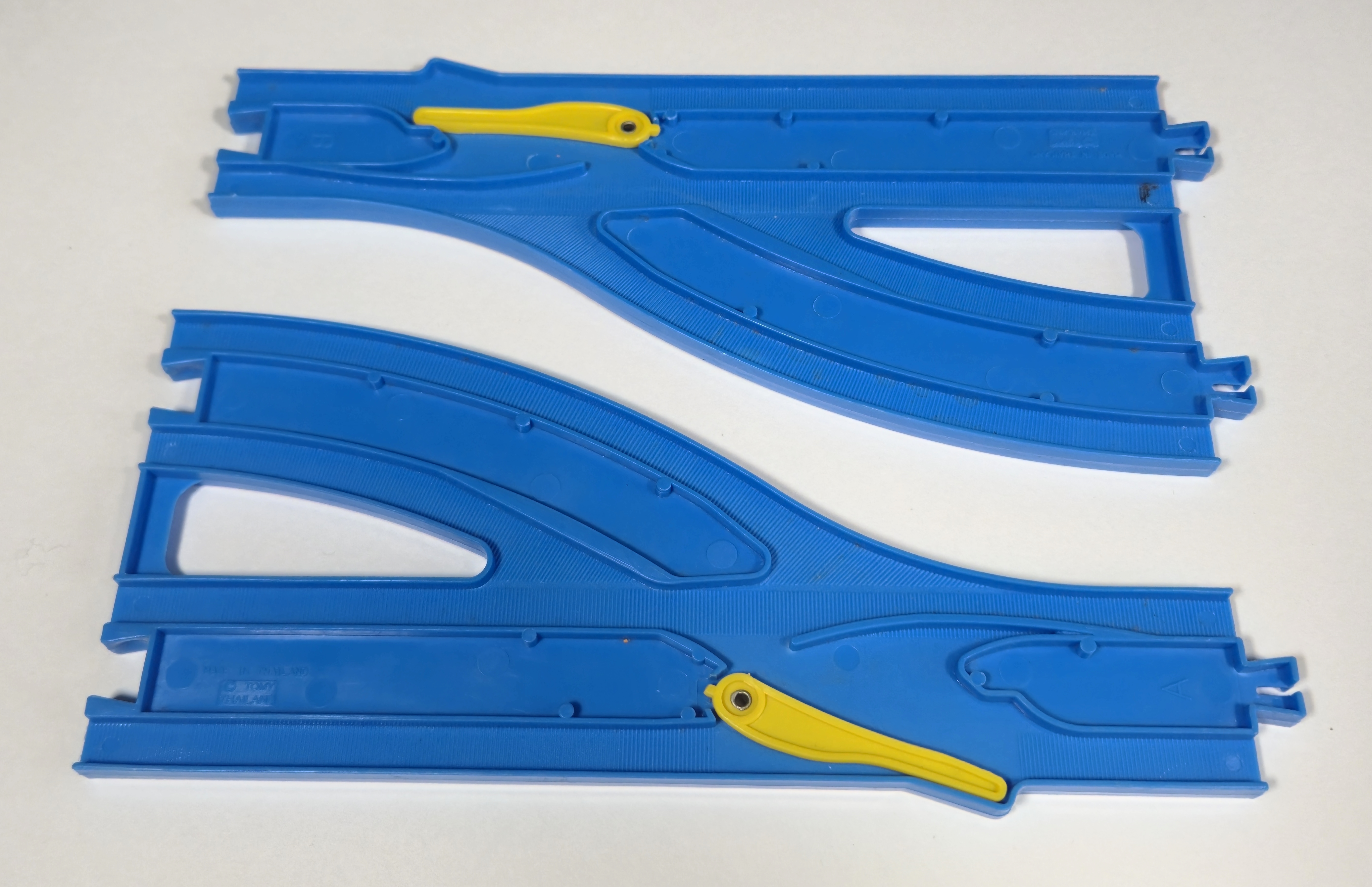 The track selection is actually pretty nice for a "small" set, with a double-track section and single/double point rails as well as a stop rail to stop the train. The curves are the old Japanese toolings that had been updated for Thailand production and the switches are also old toolings with some text modifications over time. These predate the practice of putting the squared-off Tomy logo in many track toolings - I don't think it was introduced until later in 2000.
