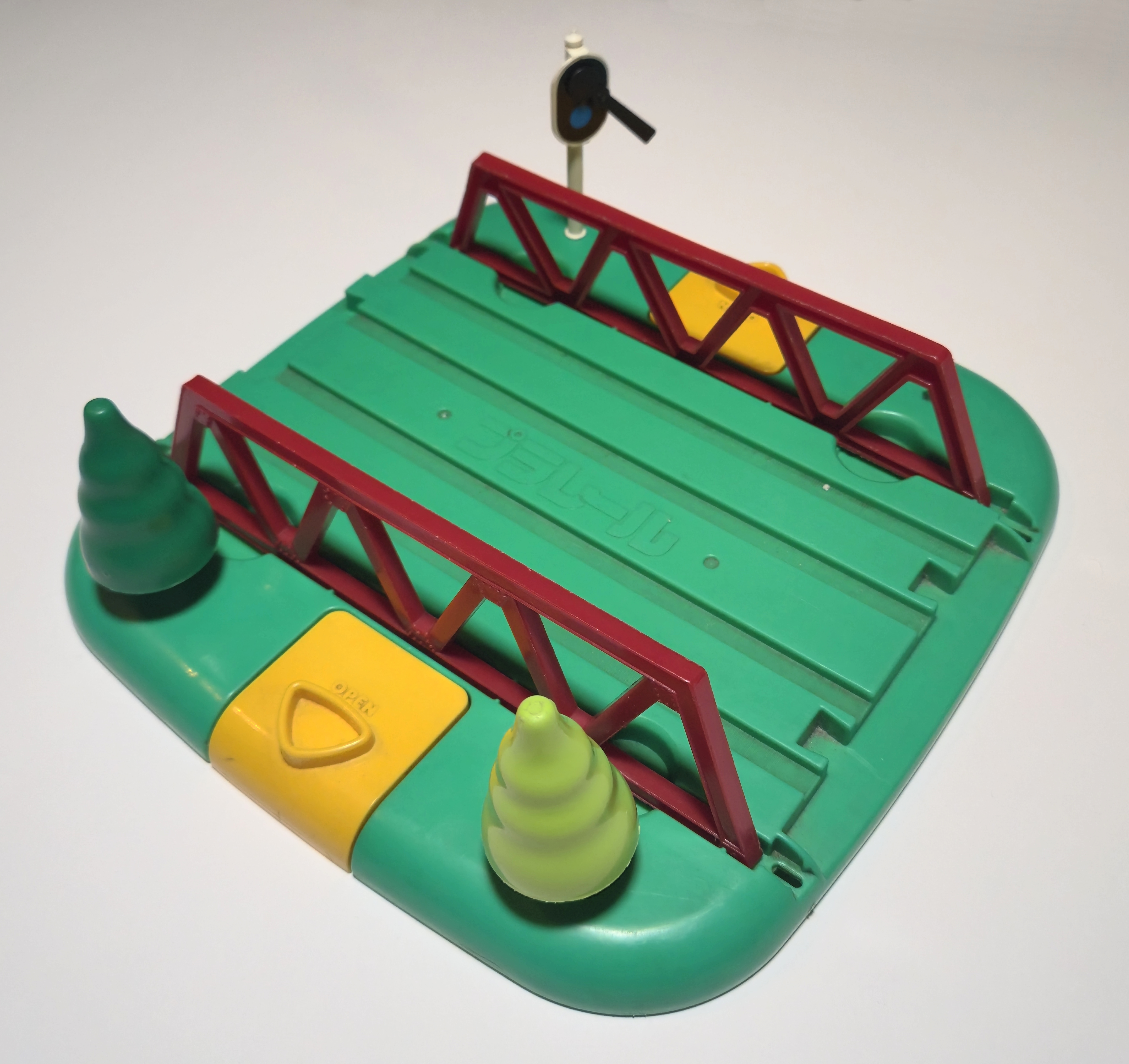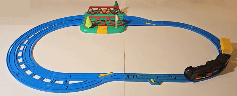 The lid of the box has a double-track pattern on it equivalent to a Double Track Straight Rail, and it can hold the included iron bridge sides and baseless signals and trees. Off the bucket regular track can be connected to it and when on top of the bucket it is the height of four Block Bridge Girders, so it can actually be reached and incorporated into a regular layout. Actually, all of the Tomy "cleaning boxes" have pretty neat features like this and will work with many other components as well as following the height and accessory standards.