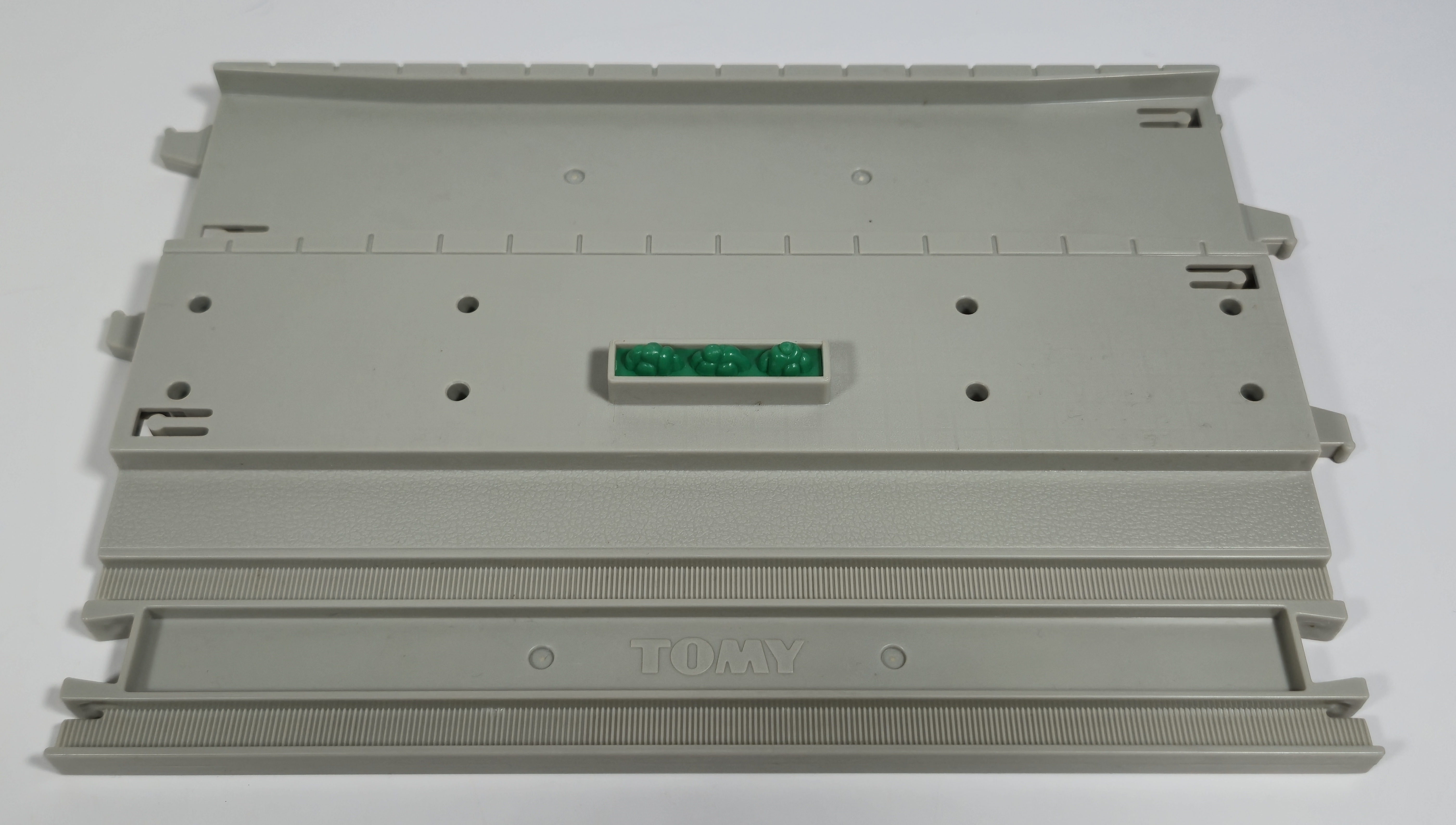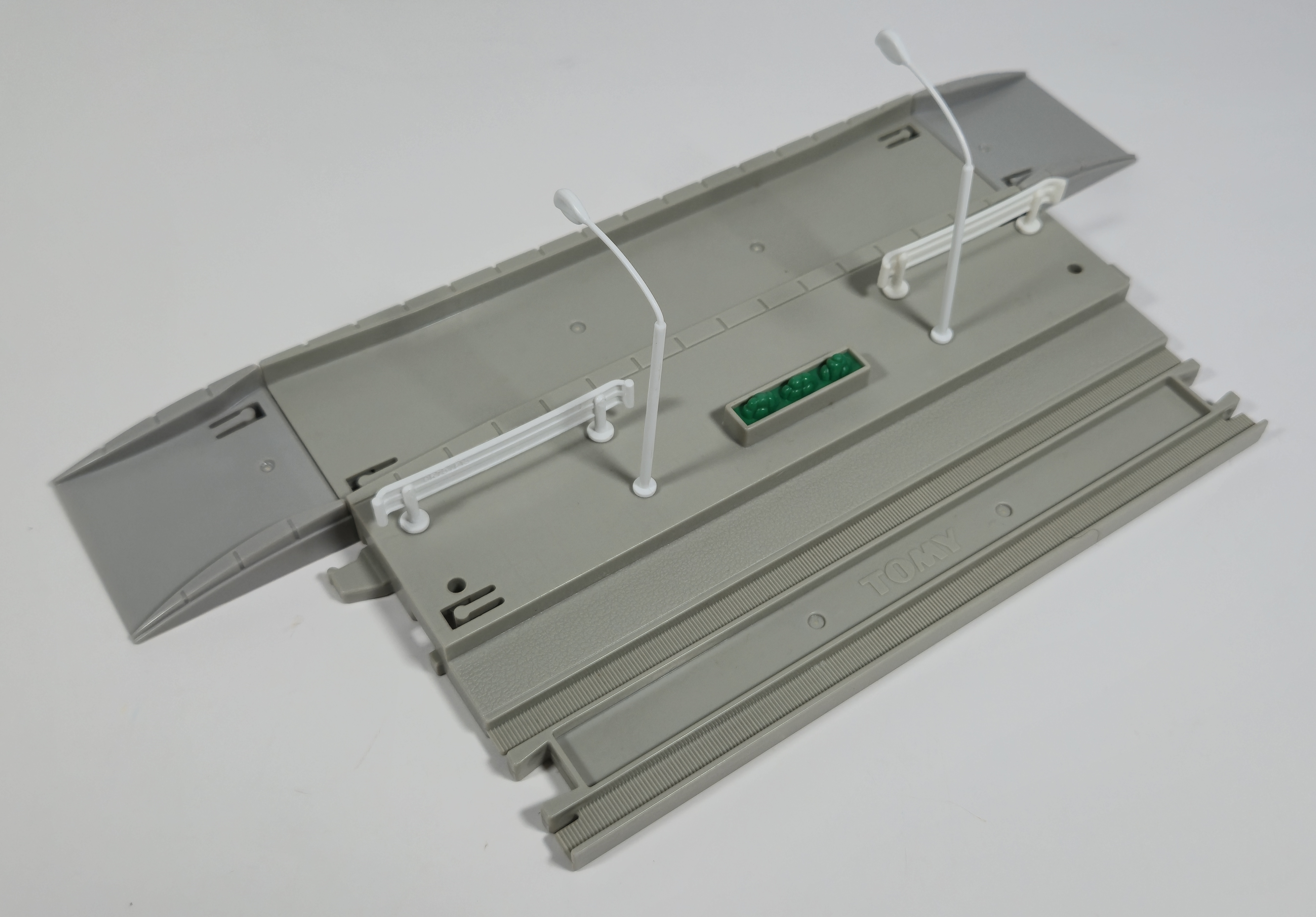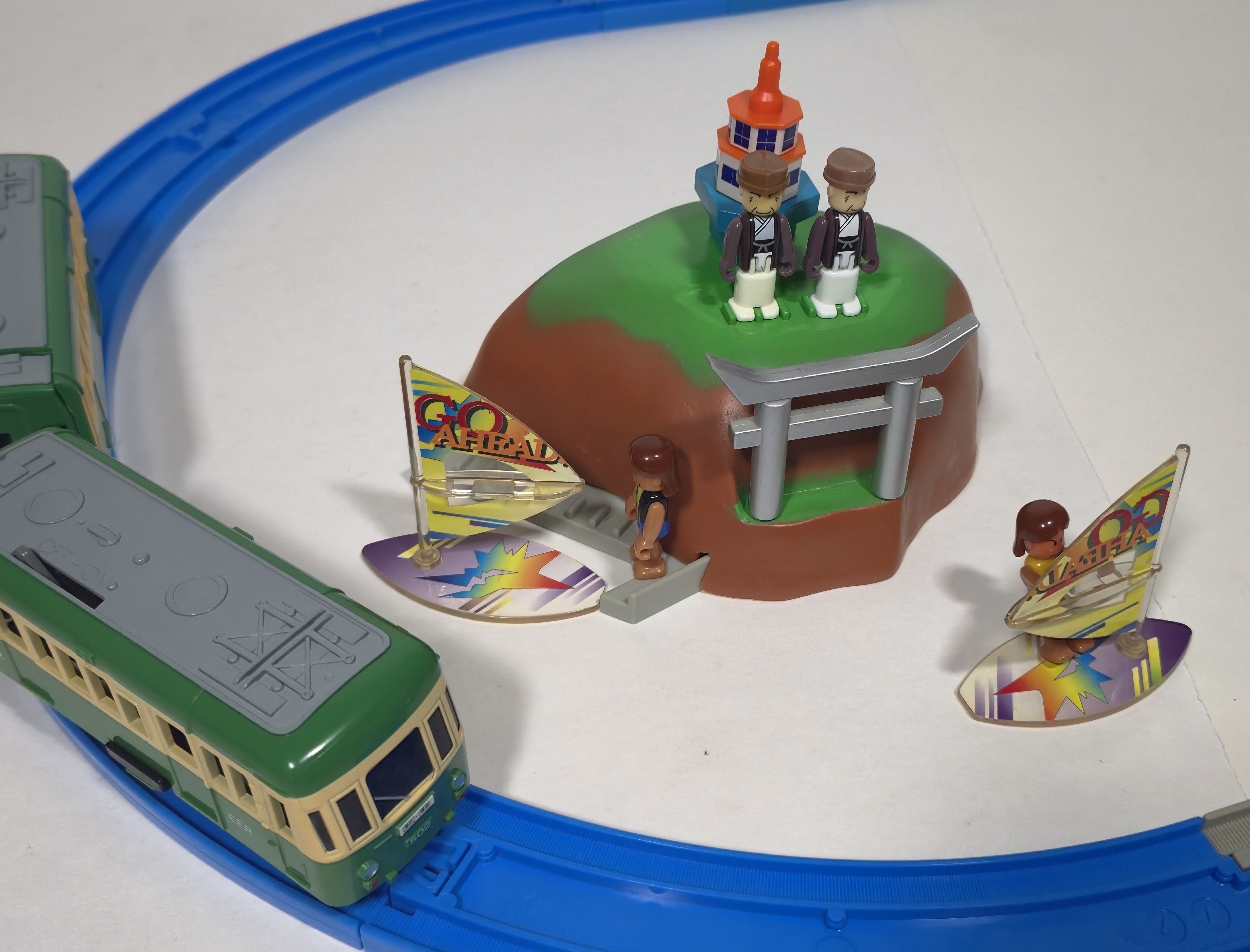The track is standard for the era but the very cool Straight Rail & Road section with barriers and lampposts, representing the road that goes along the coast. There aren't any included road vehicles in this set, although the followup Enoden set from 2005 included a Plaroad bus and loop of road.