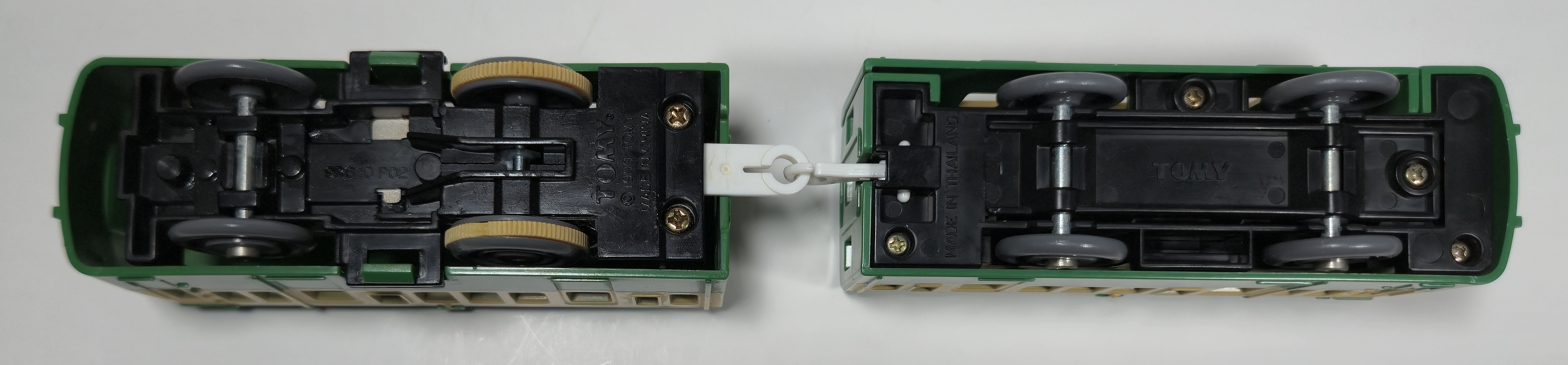The tram uses the Thomas-style gearbox. I suspect they made this 2008 run of sets after the 2005 Enoden Plaroad crossover set was discontinued.