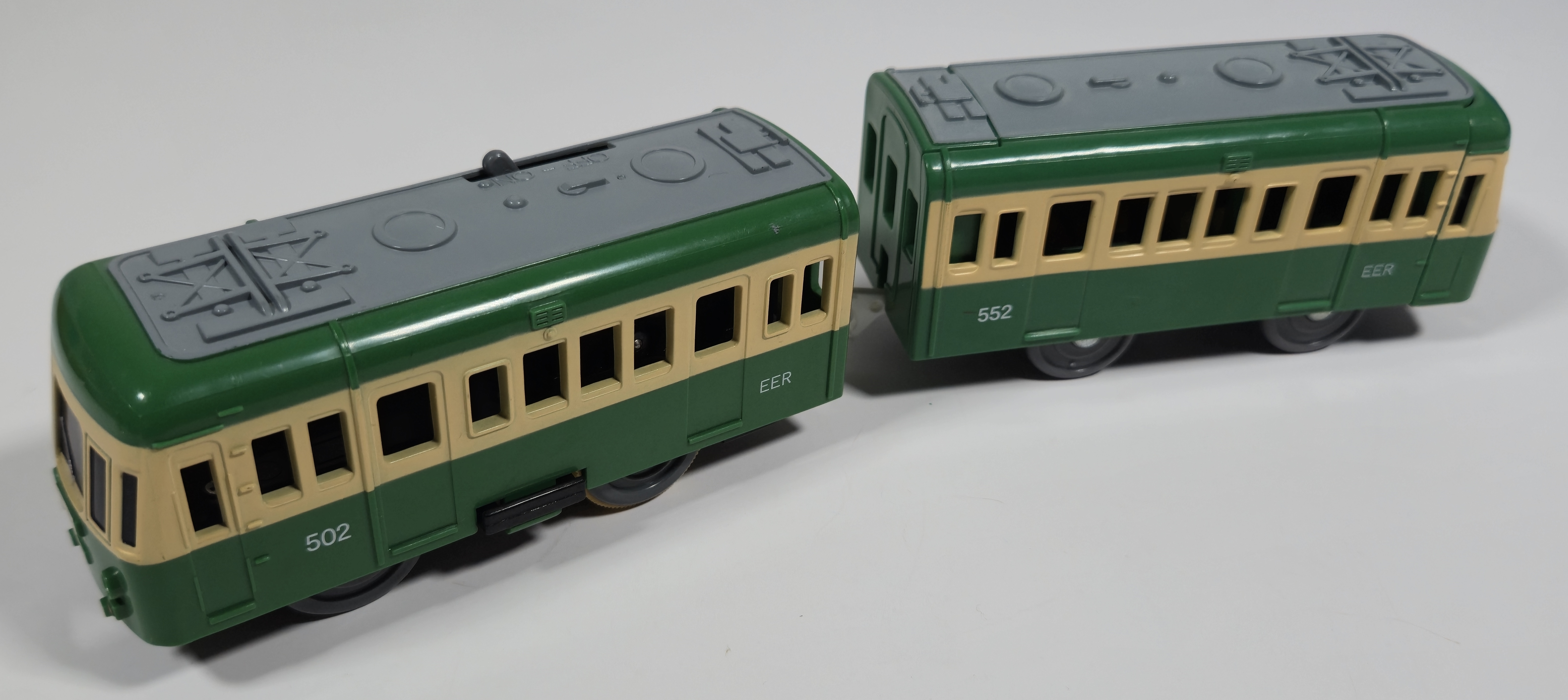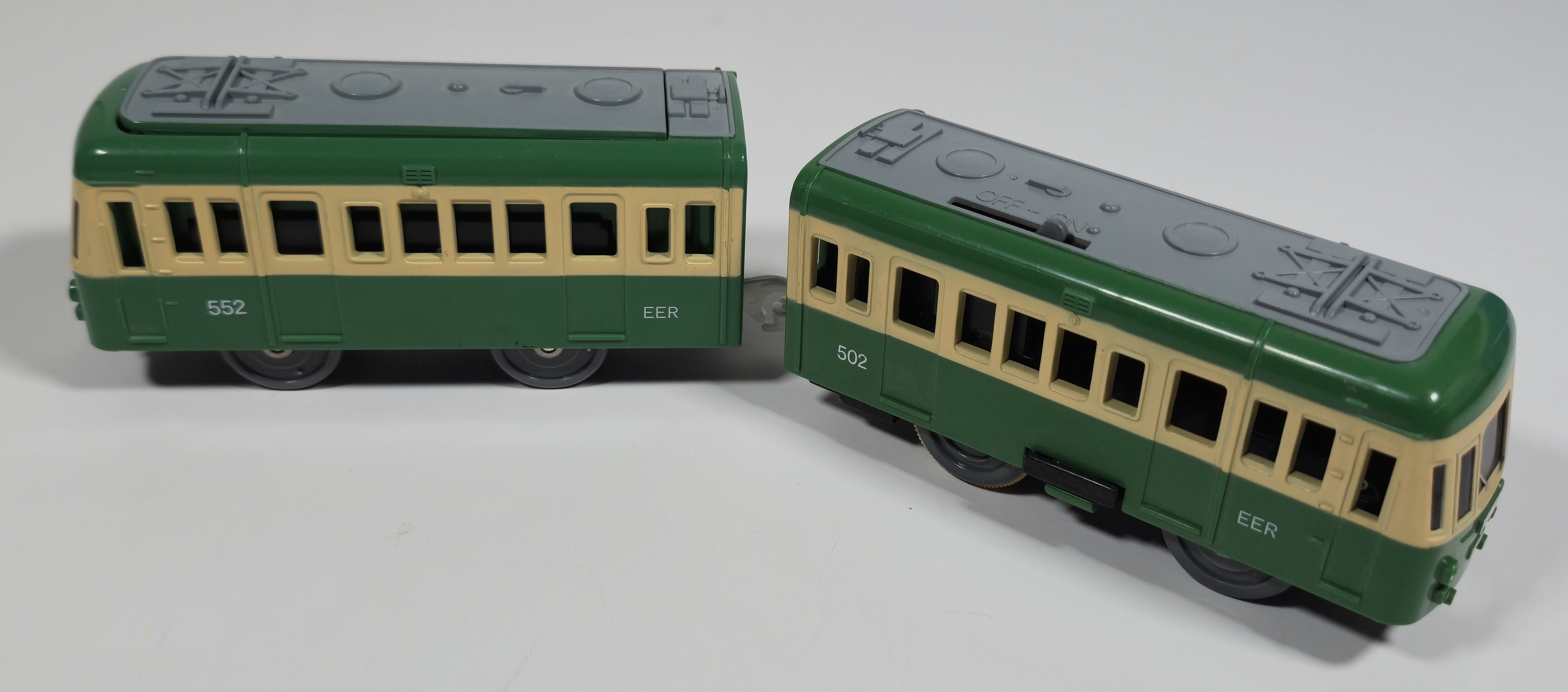 The Enoshima Electric Railway old 500 Series trams were a pair of two-car sets, numbers 501 and 502, built in the later 1950s and used into the early 2000s. The 502 set is depicted in this set, and was still in operation when the set was first released - 501 was retired in January 2002 and 502 ceased commercial operations a year later. Actually, it seems both trains were being used for advertisements in their last months of operation - the 501 train was painted pink and advertised PostPet, an email client, which also had a tie-in Plarail set, and the 502 was used to advertise this Plarail set!