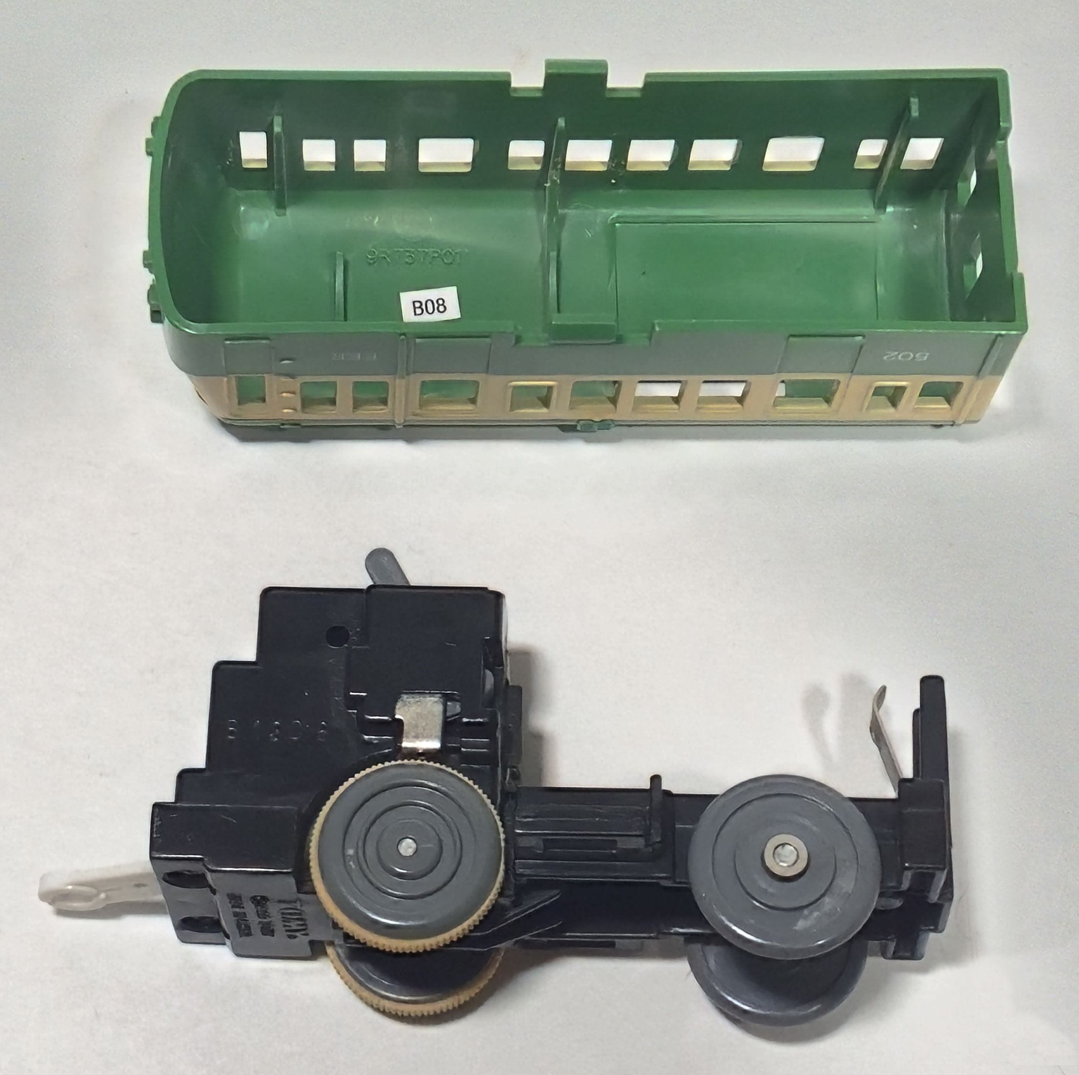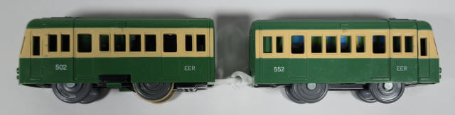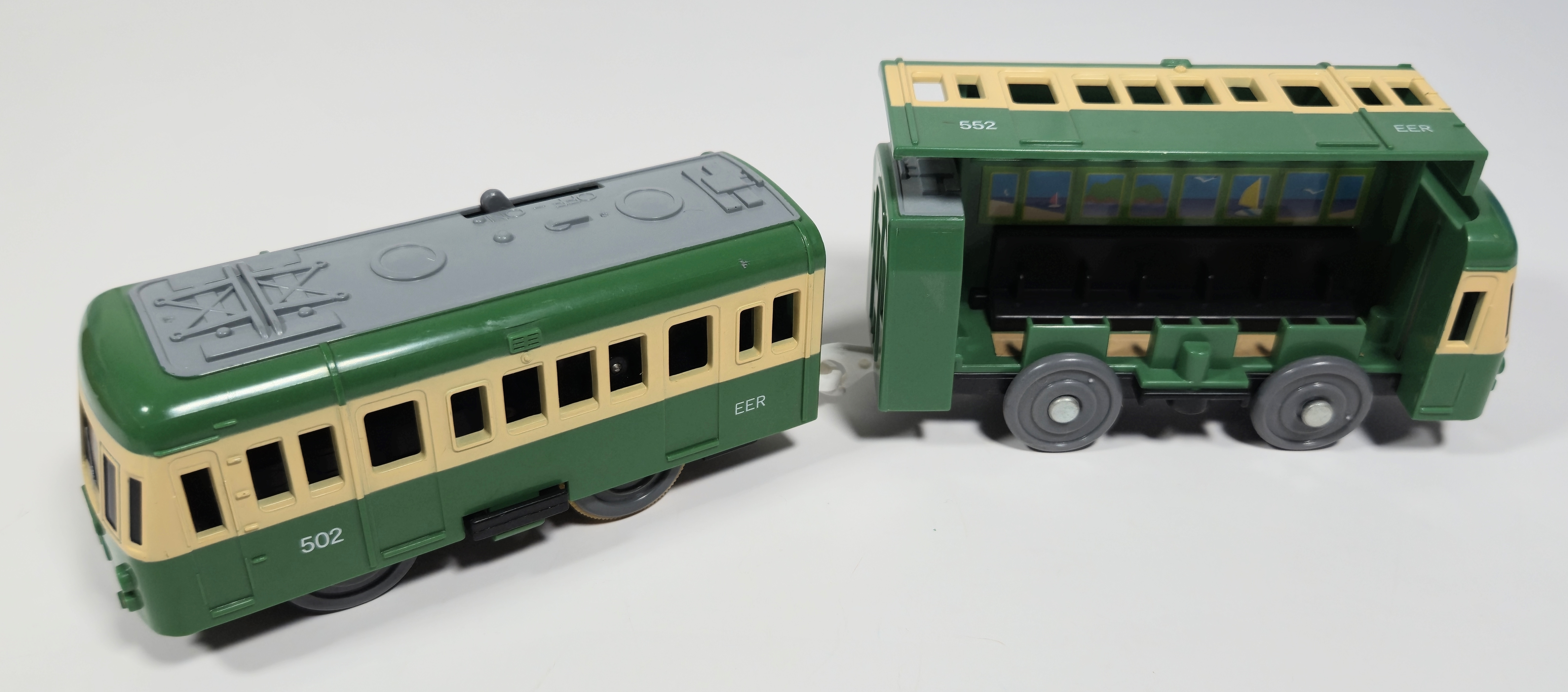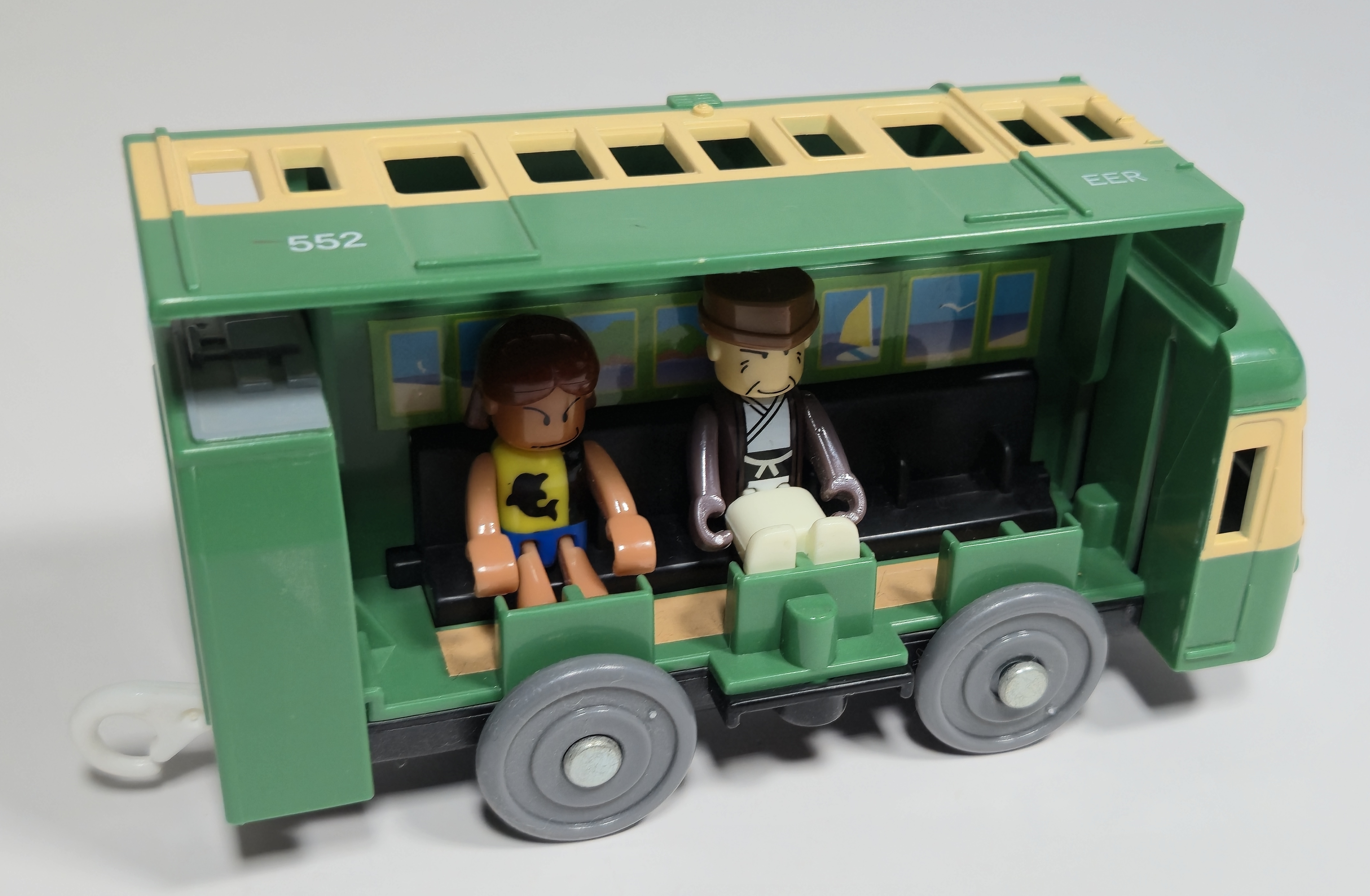 The rear car opens up to allow PlaKids to sit inside. Although the 300 series trams had already been reproduced as Enoden limited products a few years before, and several other classes of their trains would be commercialized in the future, I believe this (and the PostPet set) were the only times the "old" 500 series were represented in Plarail.