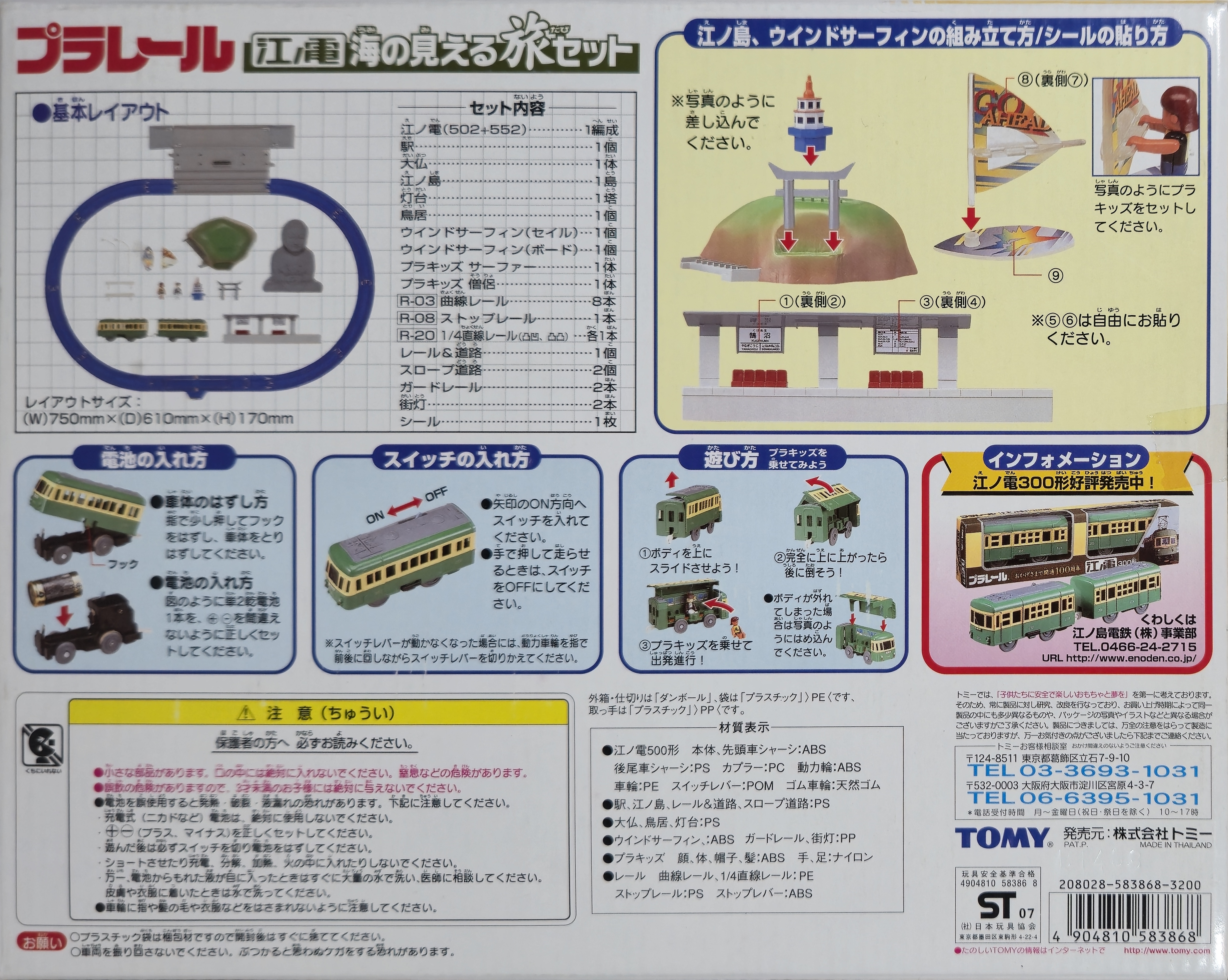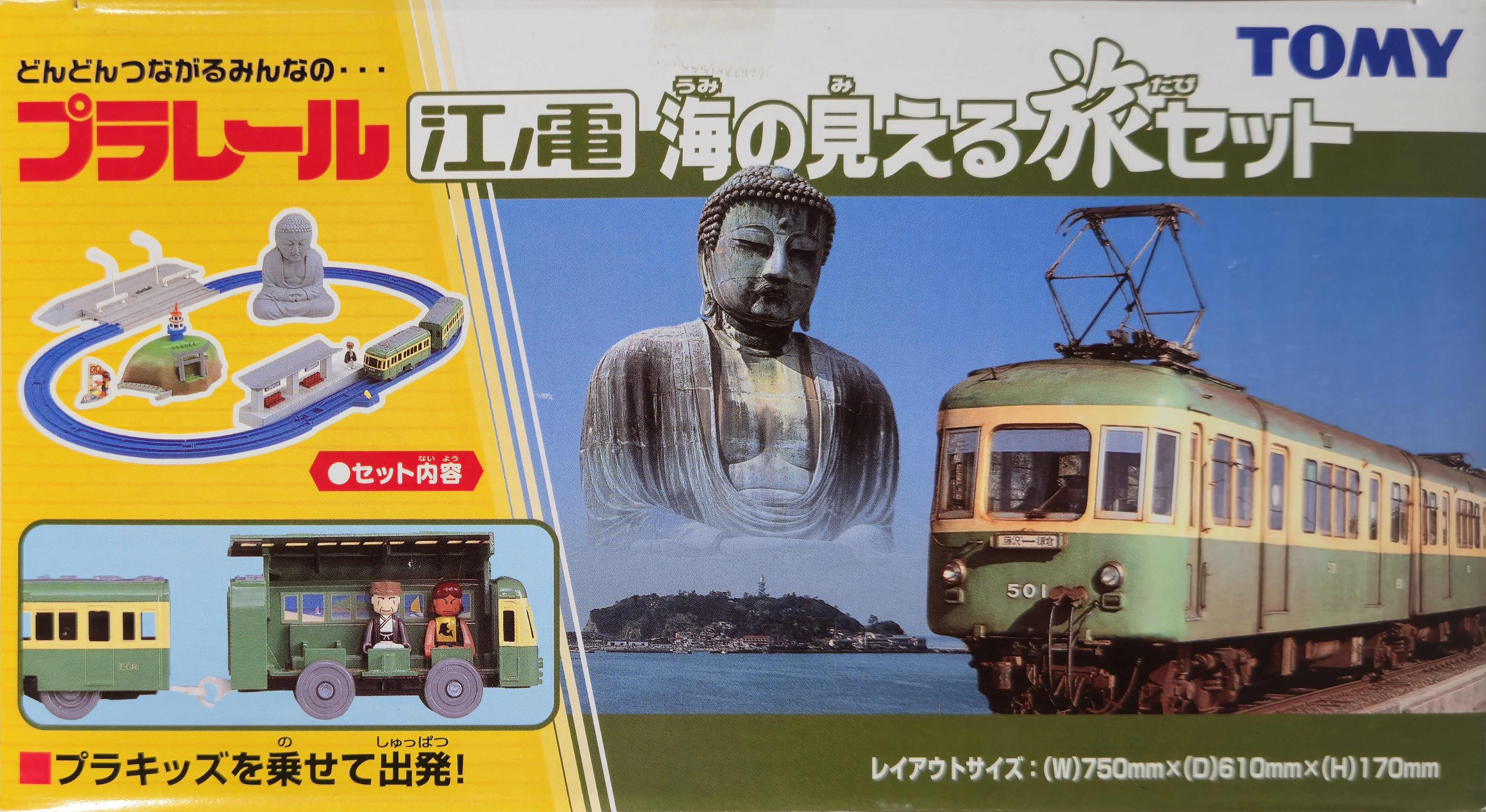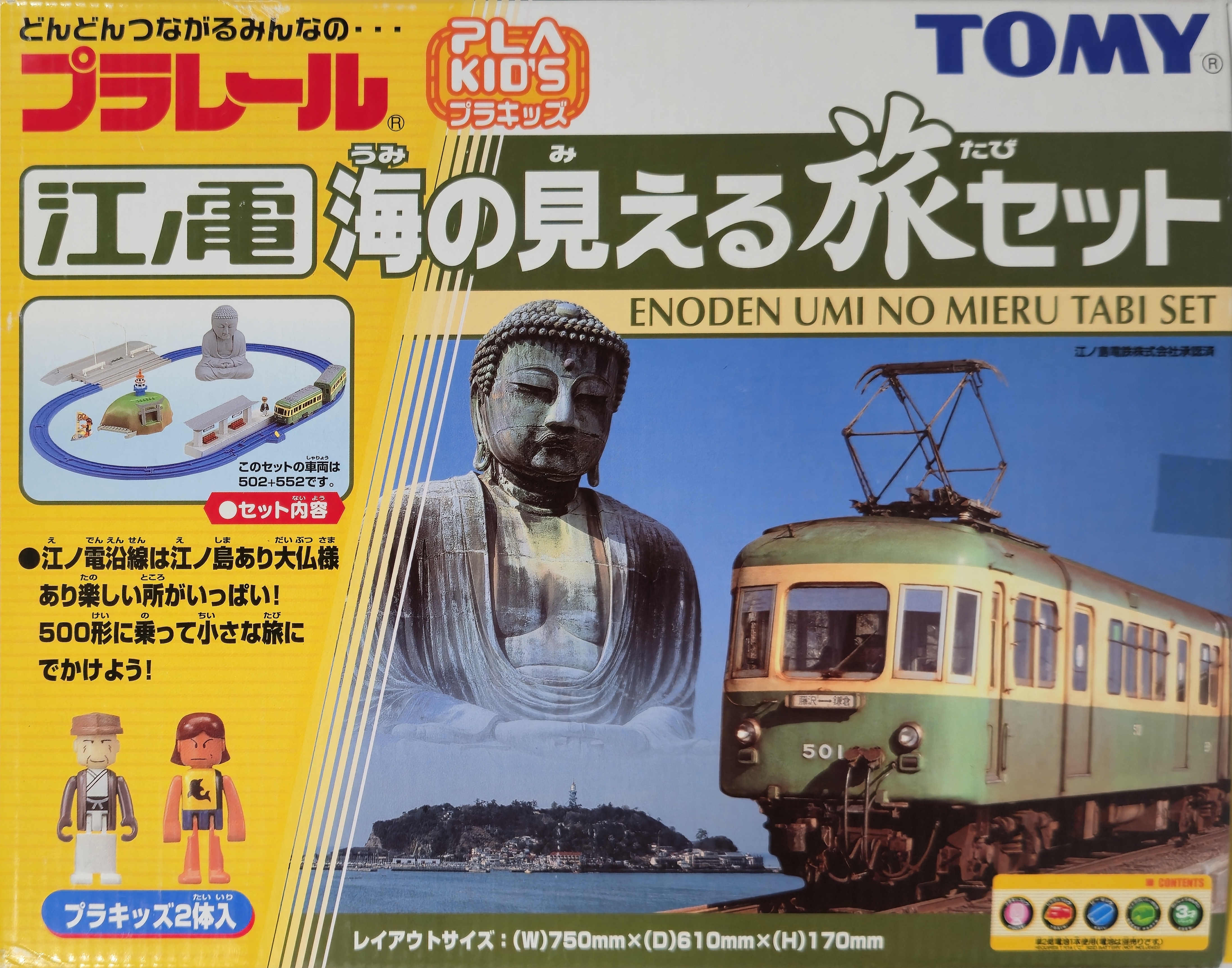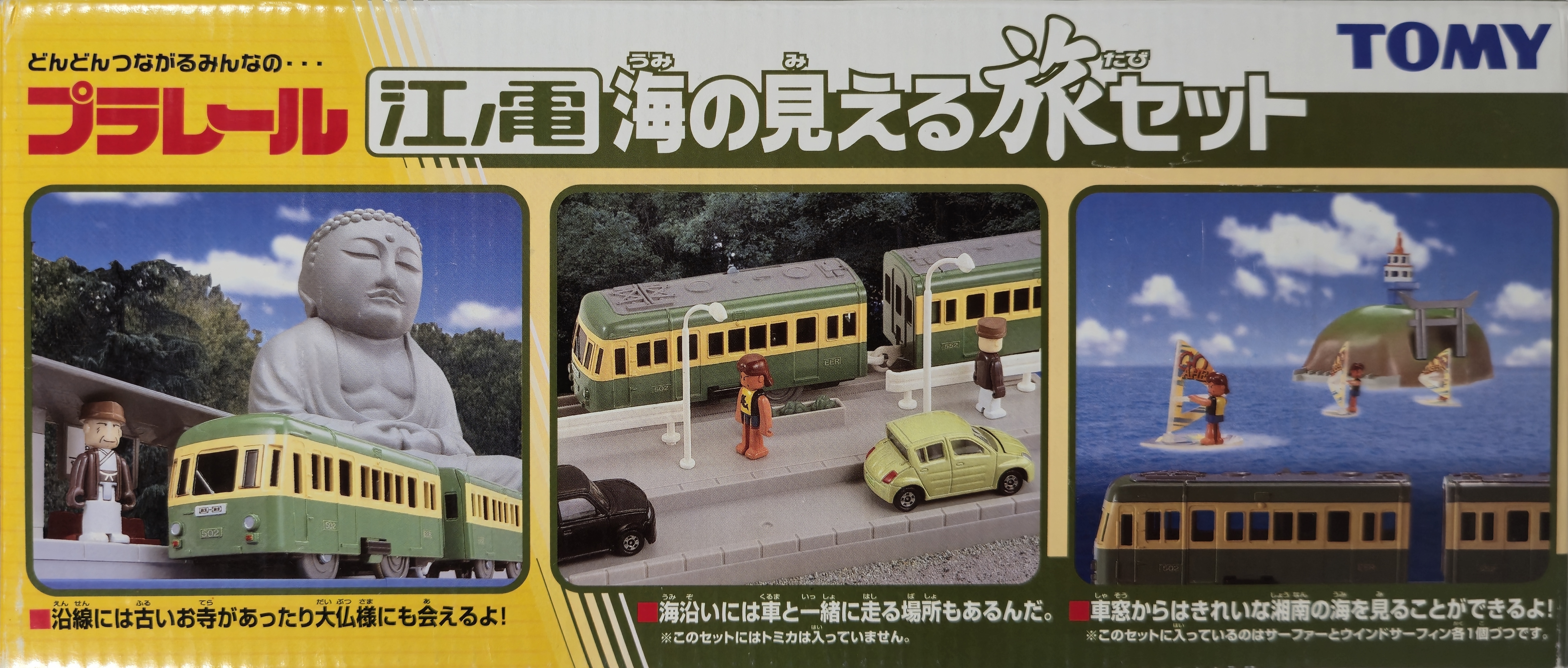 Released first in the relatively short-lived 2000-2002 style of boxes, the Enoshima Electric Railway Sea View Travel Set (江ノ電 海の見える旅セット) was one of the first smaller sets to heavily focus on the train and accessories included. It also appeared at the start of the PlaKids system and included two PlaKids, and it was followed up by several similar Enoshina Railway or Enoden-based sets.