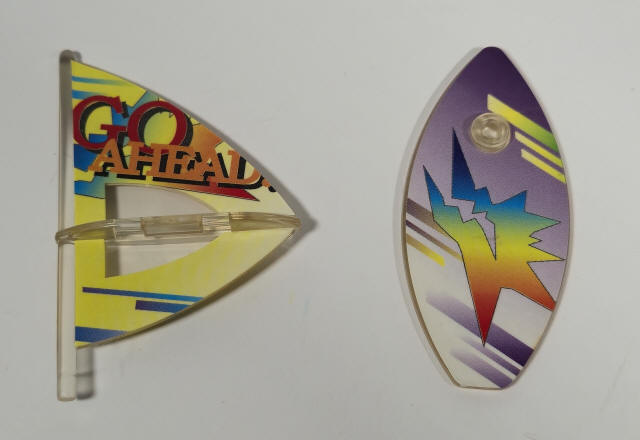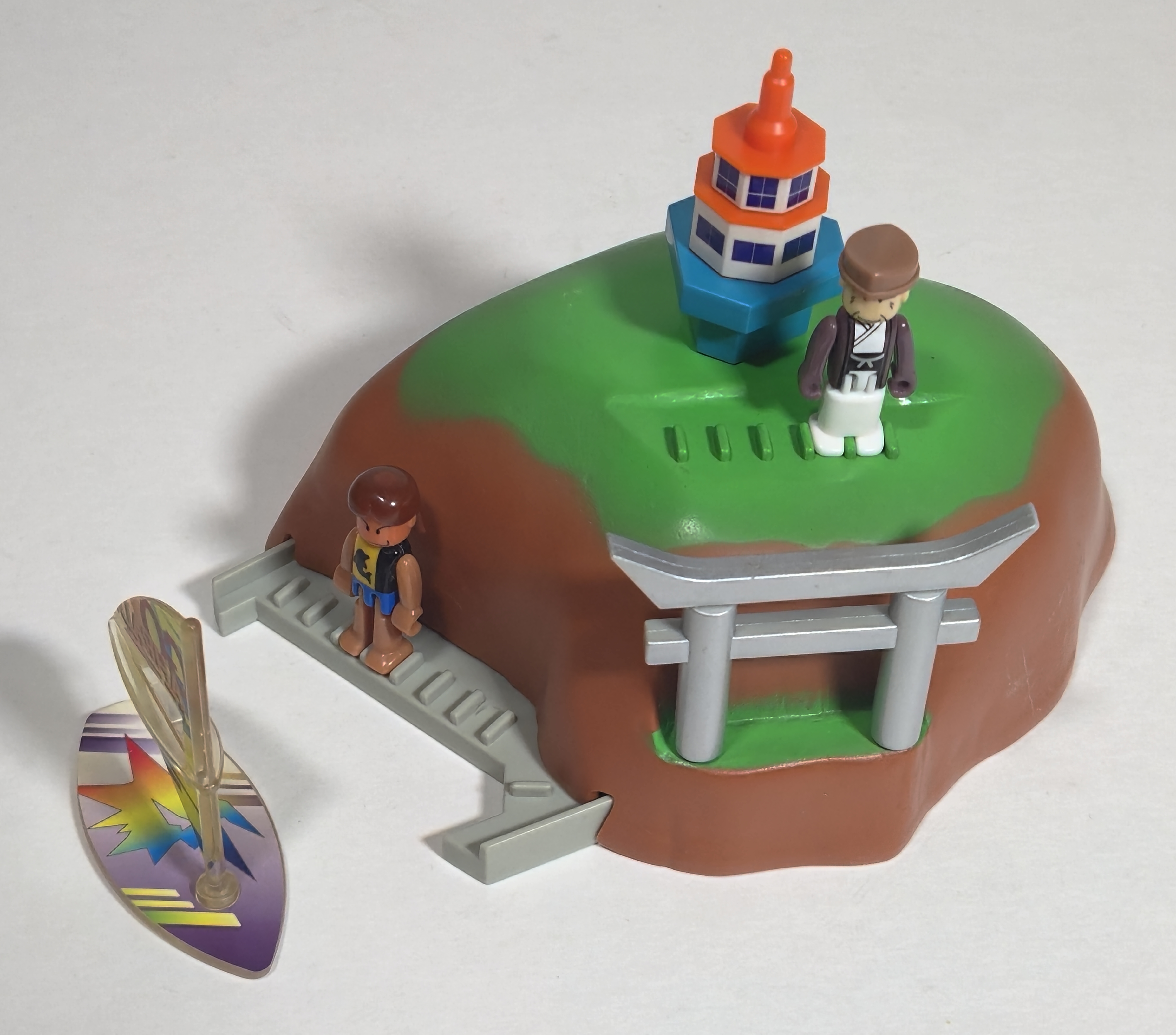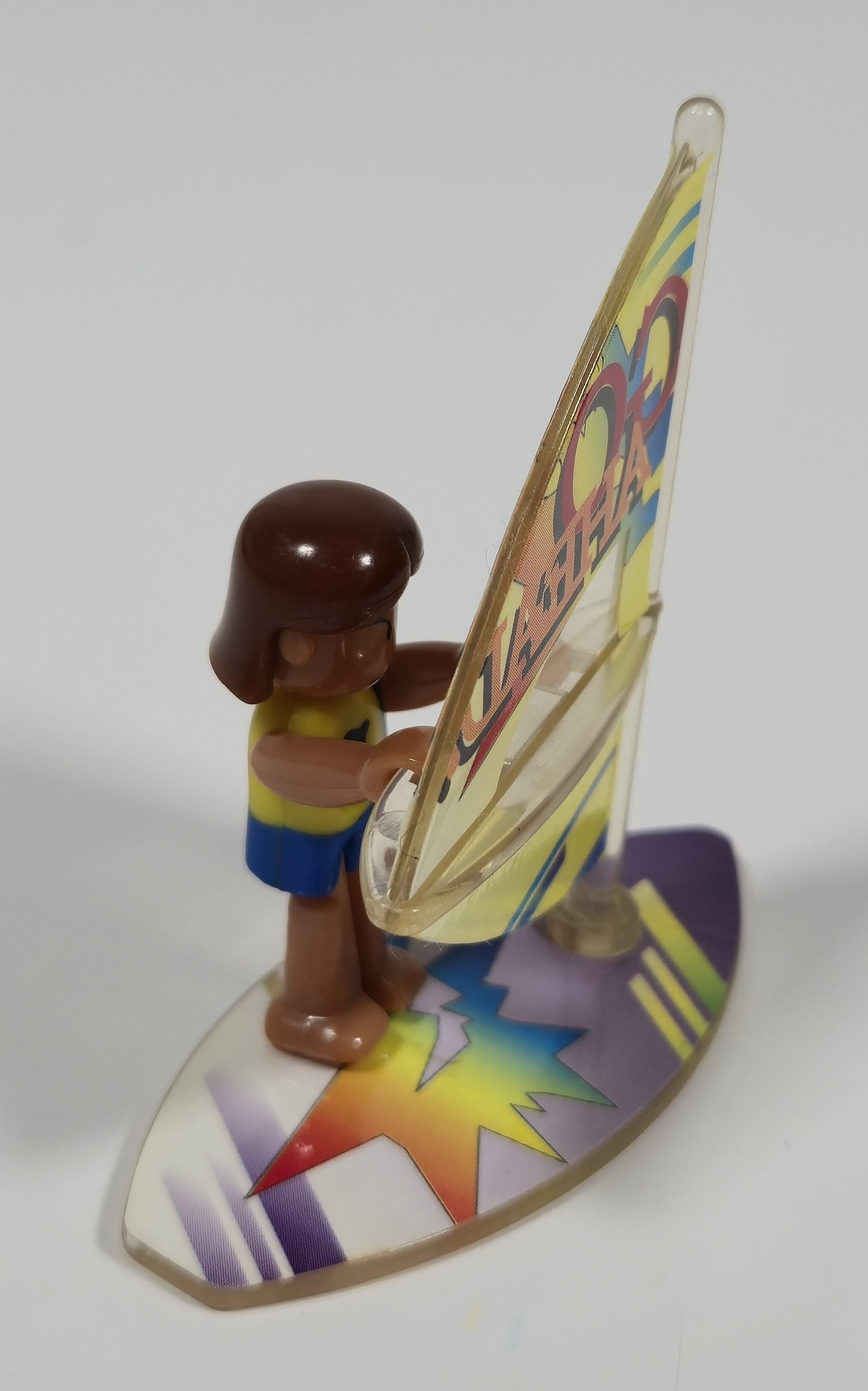 The two included PlaKids are of a windsurfer, who had curled-down hangs to hang onto the windsurfing board, and a monk. A May 2002 presale of 600 units included two more PlaKids packaged together as a bonus item, a purple monk and a different windsurfer with green and blue shirt and orange pants. Actually, the second windsurfer doesn't have the curved-down hands, instead using the inwards curved style of other figures...
