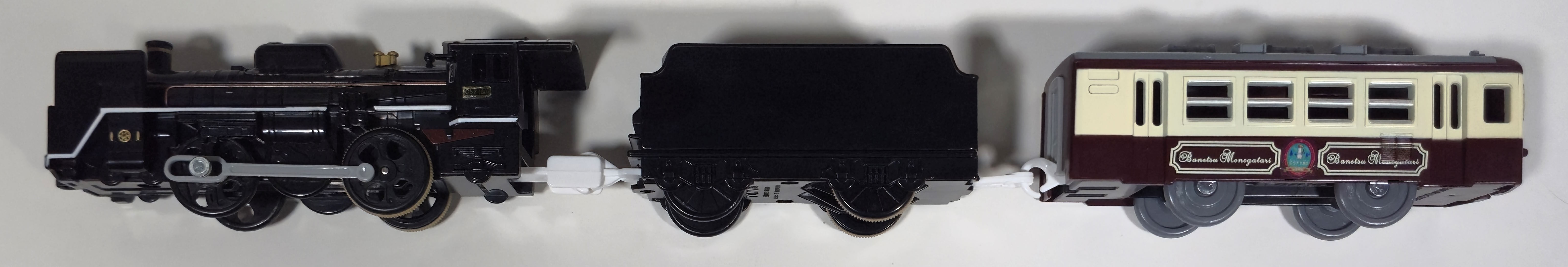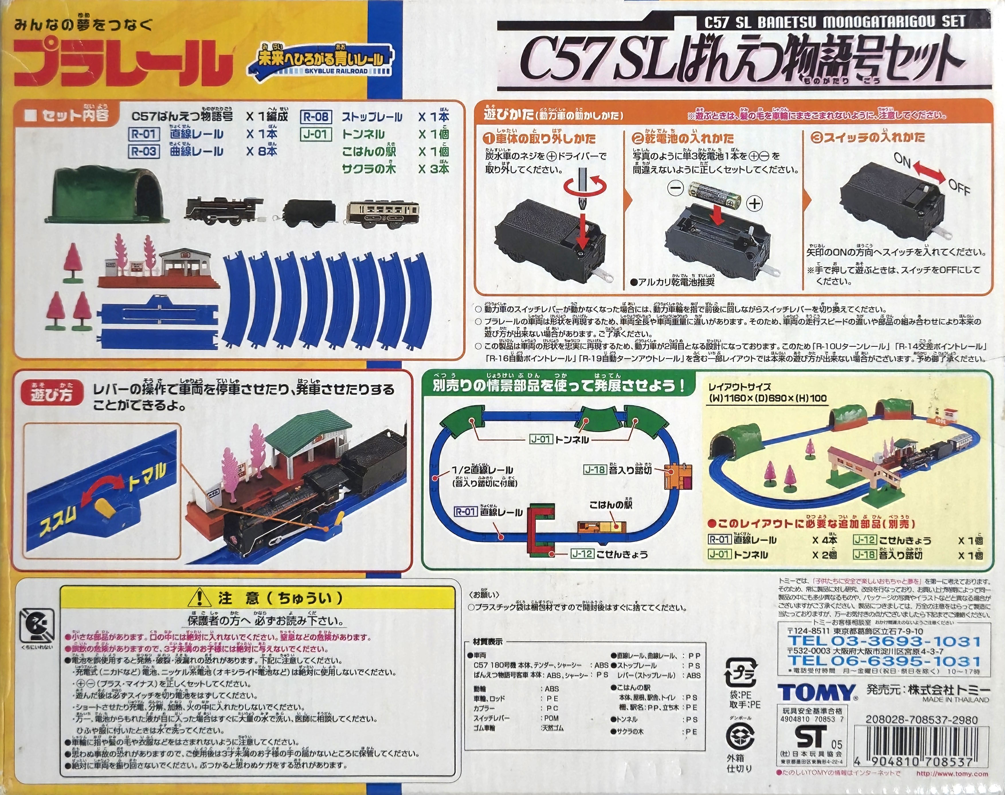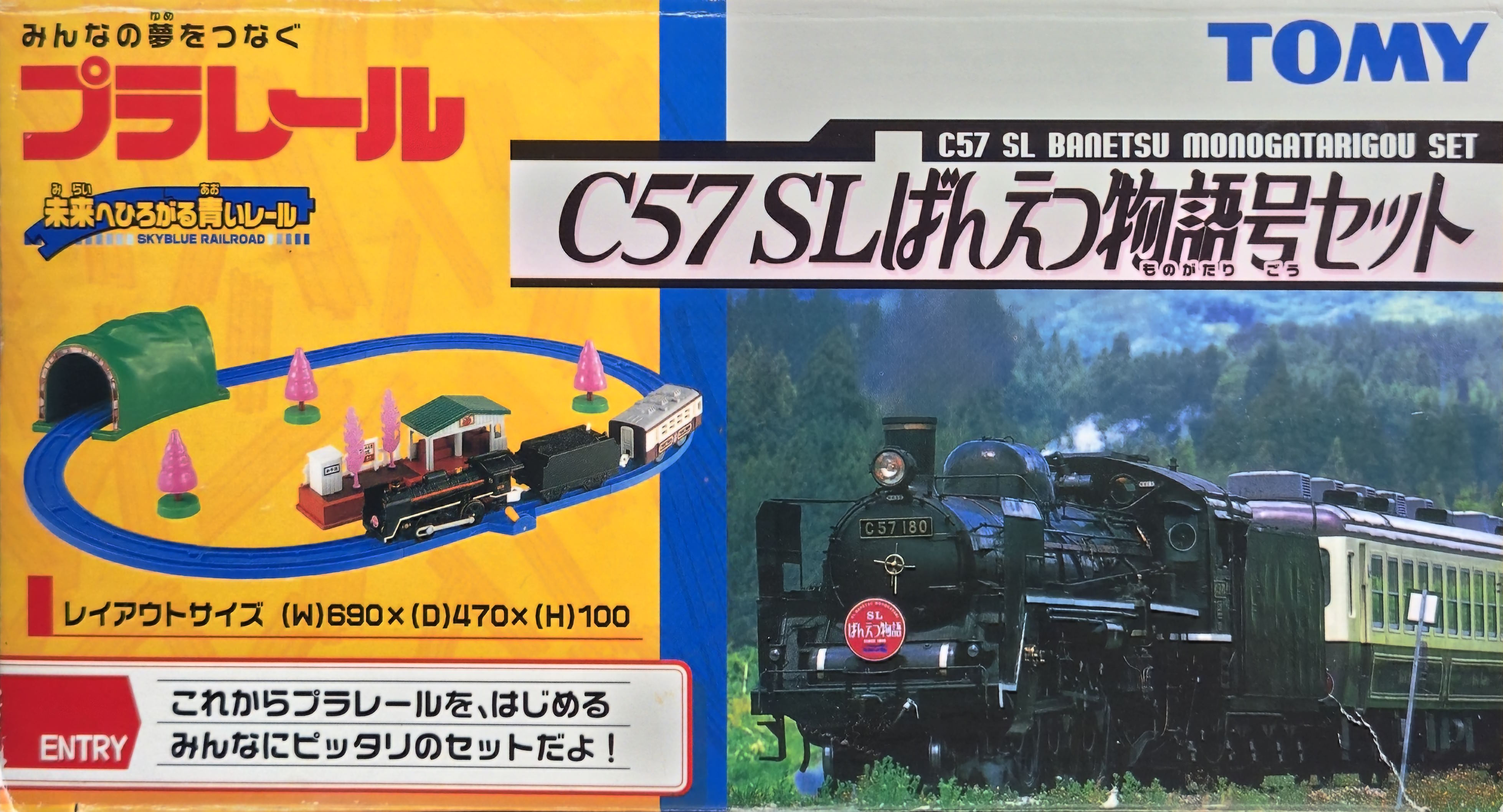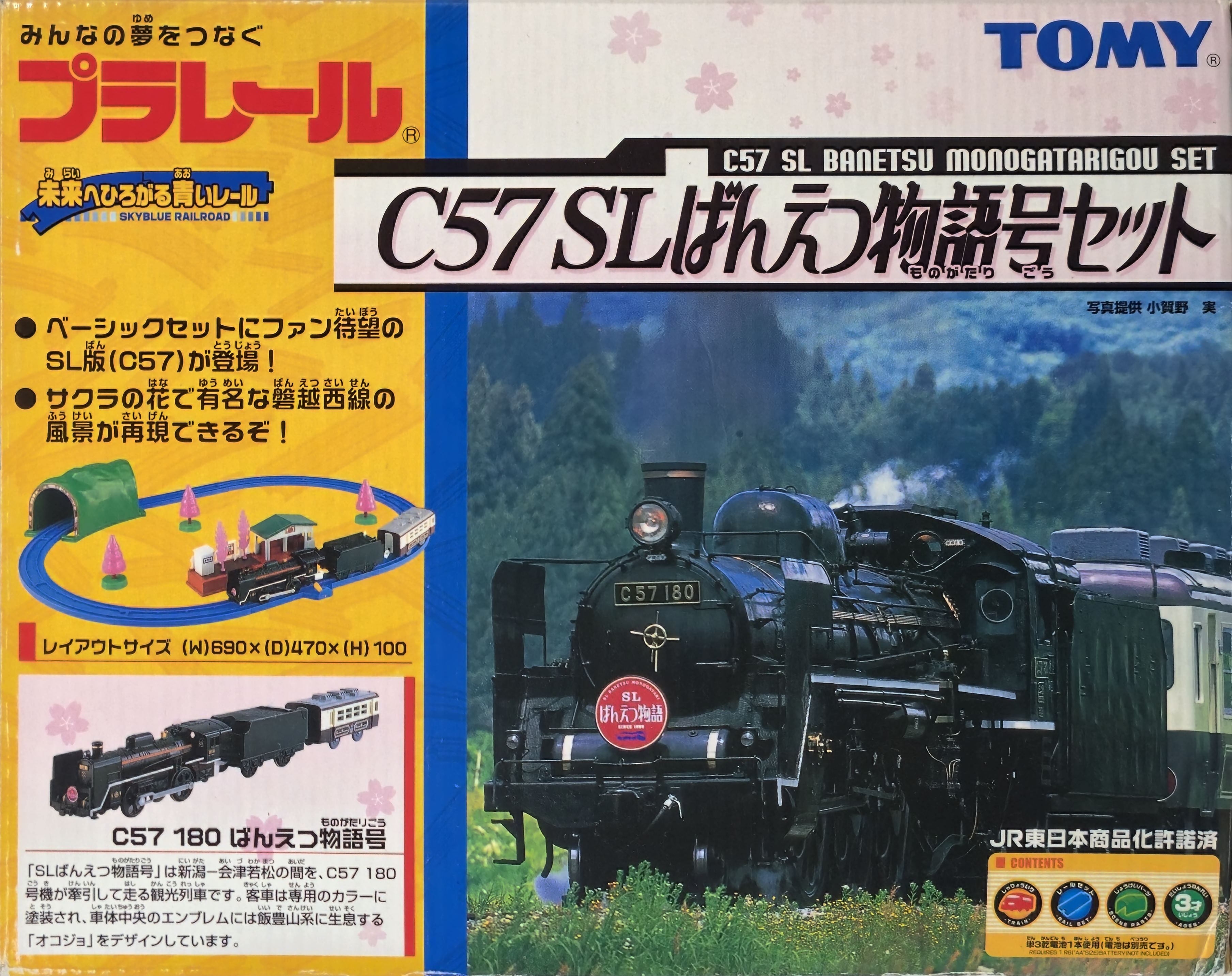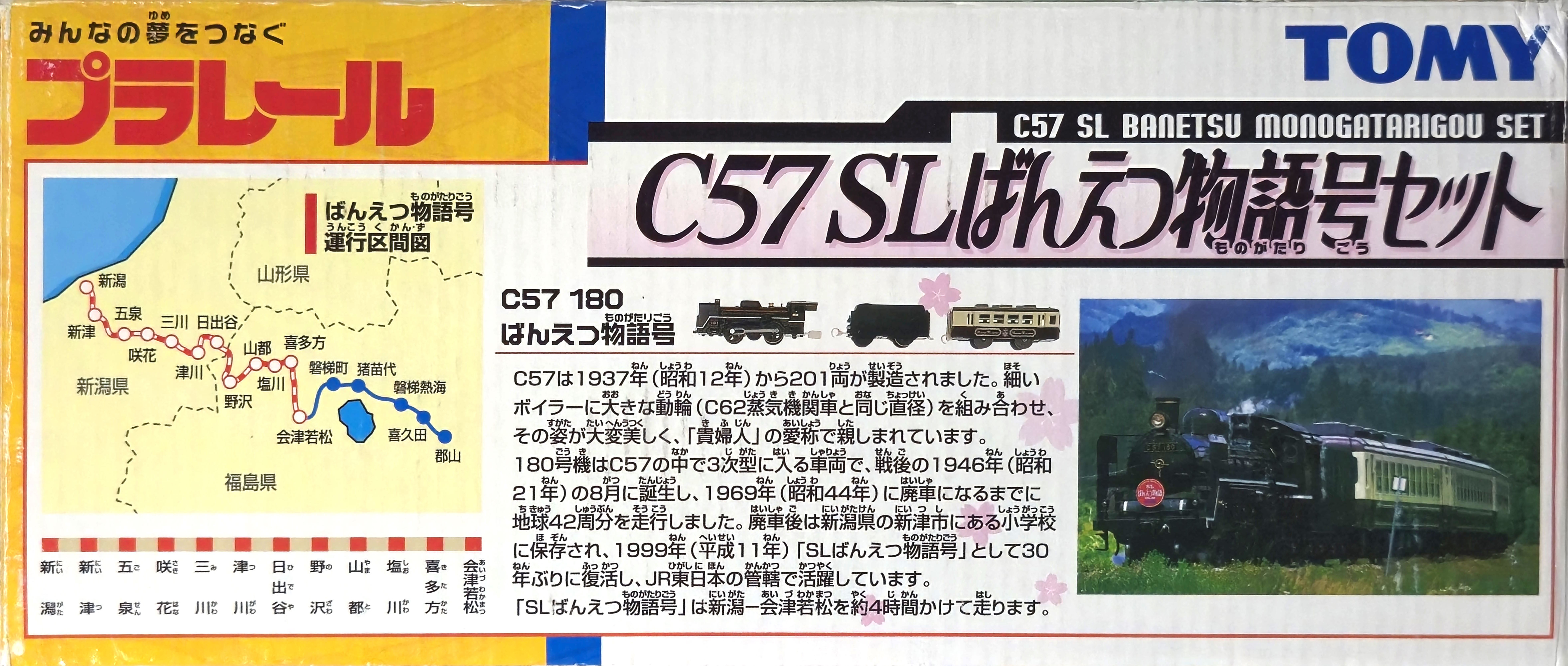 Continuing the 2000s trends of basic sets with neat trains and set variant accessories, Tomy released the C57 SL Banetsu Monogatari Set (C57 SLばんえつ物語号セット) in 2005. The bottom of the box says of the C57 and Banetsu Monogatari: 201 C57 steam locomotives were manufactured starting in 1937 (Showa 12). Combining a slim boiler with large wheels (the same diameter as the C62 steam locomotive). The C57 was affectionately known as the "Lady" for its beautiful, tough appearance. No. 180 is a Gunoka, third-generation C57, which was born in August 1946 (Showa 21) after the war and ran the equivalent of circling the Earth 42 times before being scrapped in 1969 (Showa 44) After being scrapped, it was preserved at the Pu School in Niitstu City, Niigata Prefecture and in 1999 (Heisei 11) it was revived for the first time in 30 years as the "SL Banetsu Monogatari" and is currently in service under the jurisdiction of JR East. The SL Banetsu Monogatari train travels from Niigata to Aizu-Wakamatsu in approximately four hours.