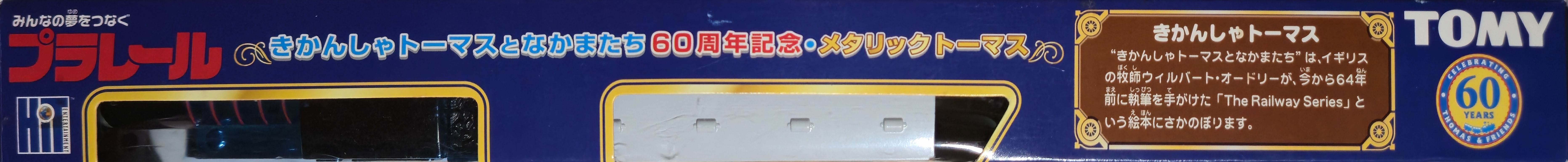 In January 2005 to celebrate the 60th anniversary of the Railway Series books and the Thomas the Tank Engine and Friends television show based on then Tomy released a special shiny blue Thomas with matching gold Annie and Clarabel.