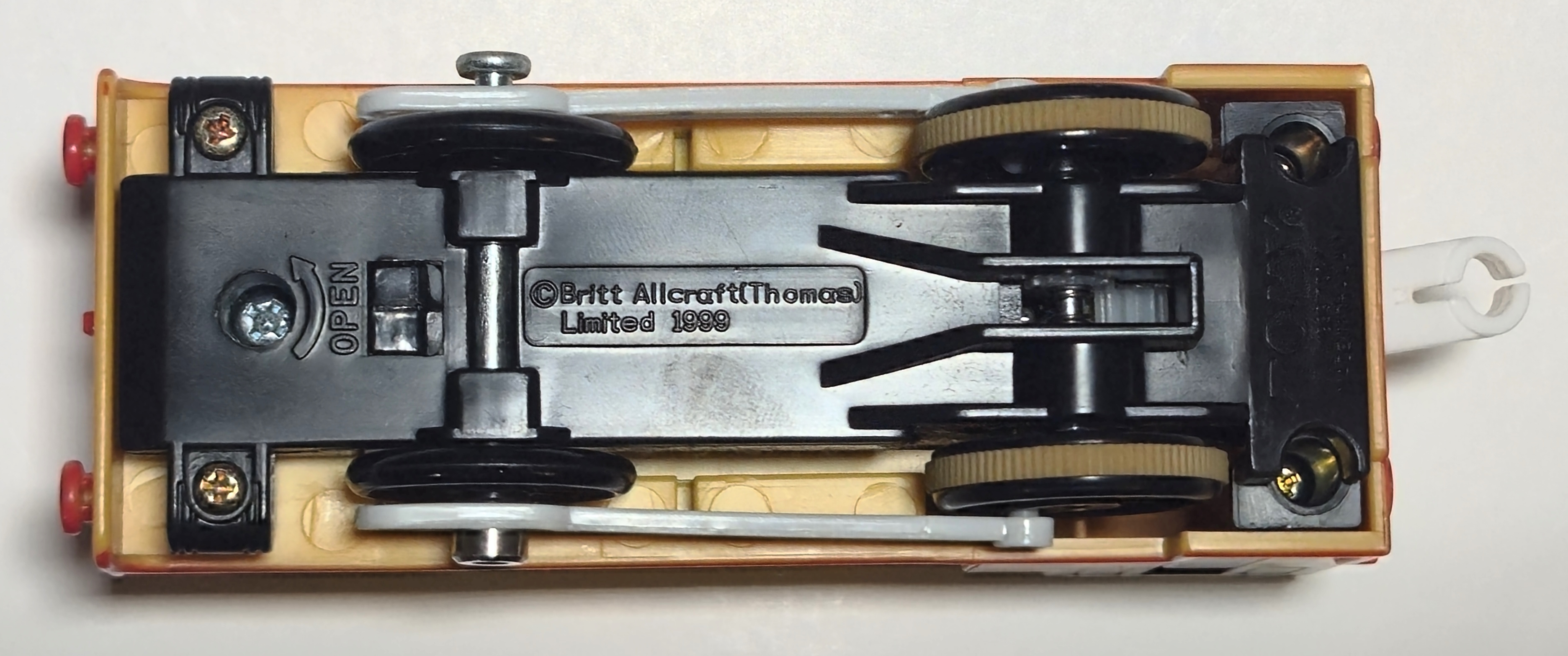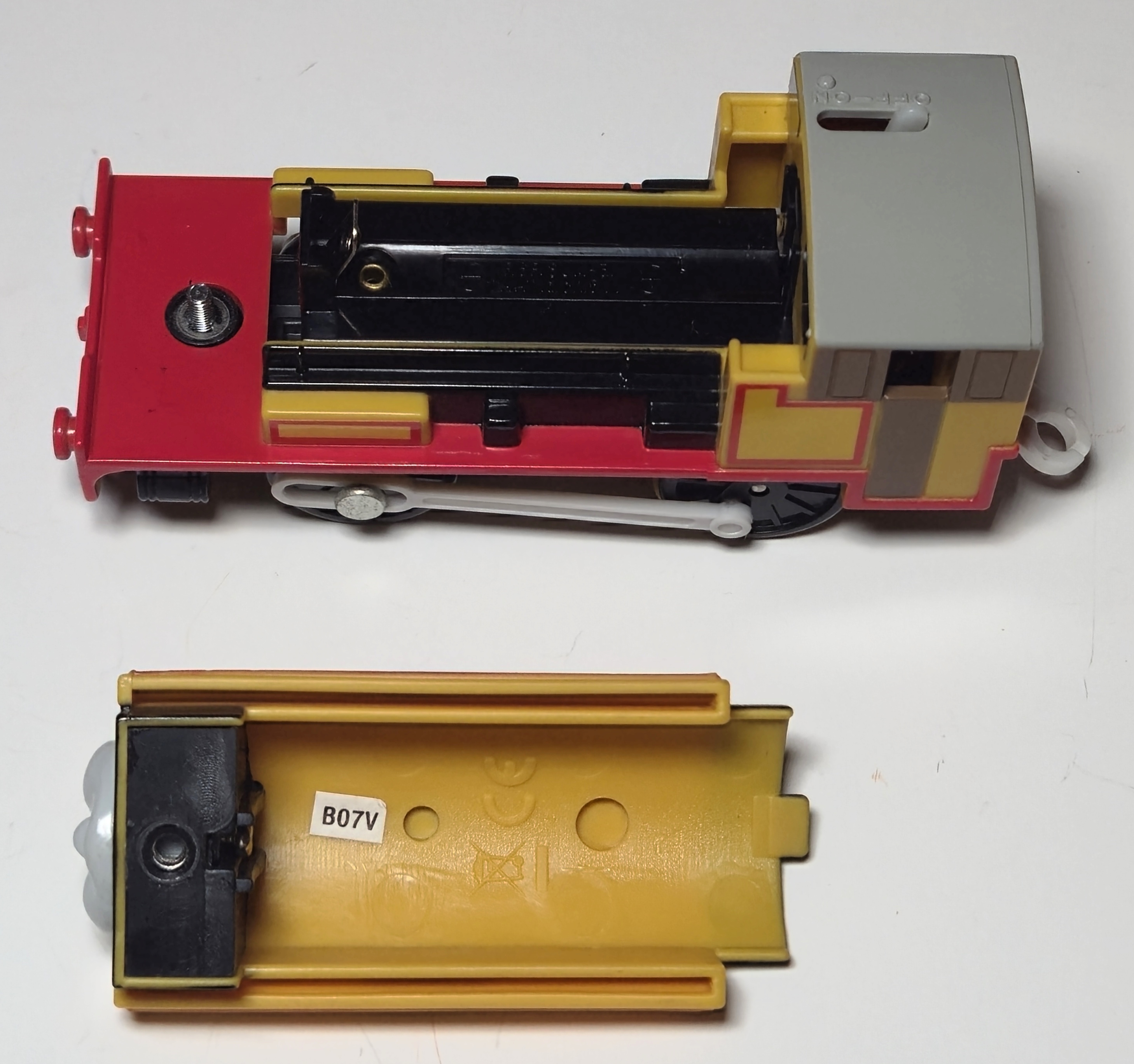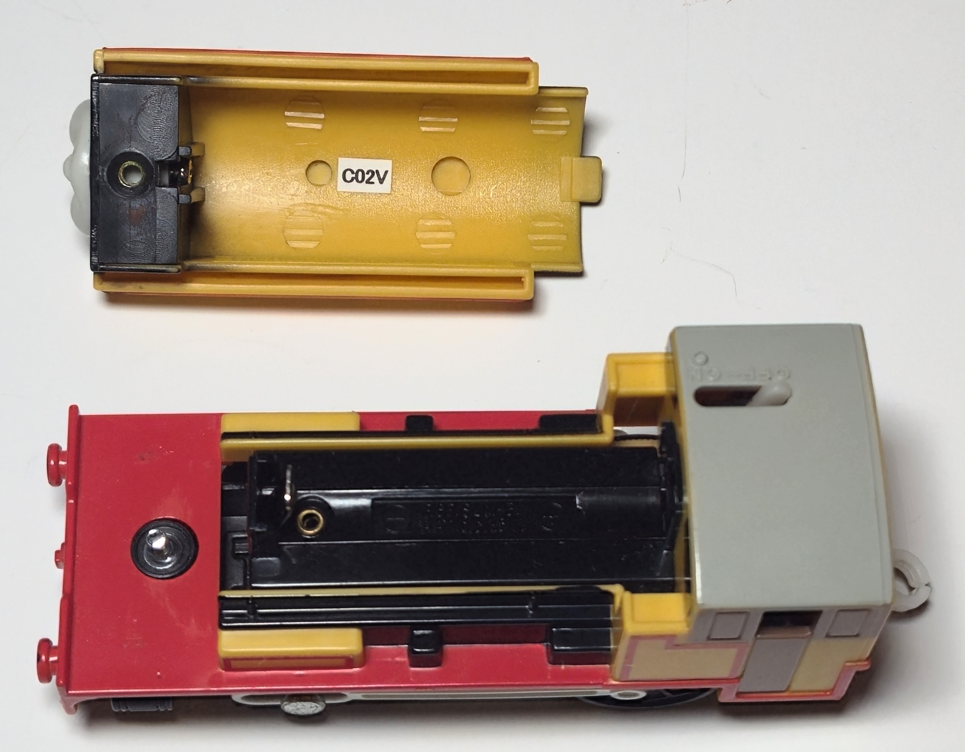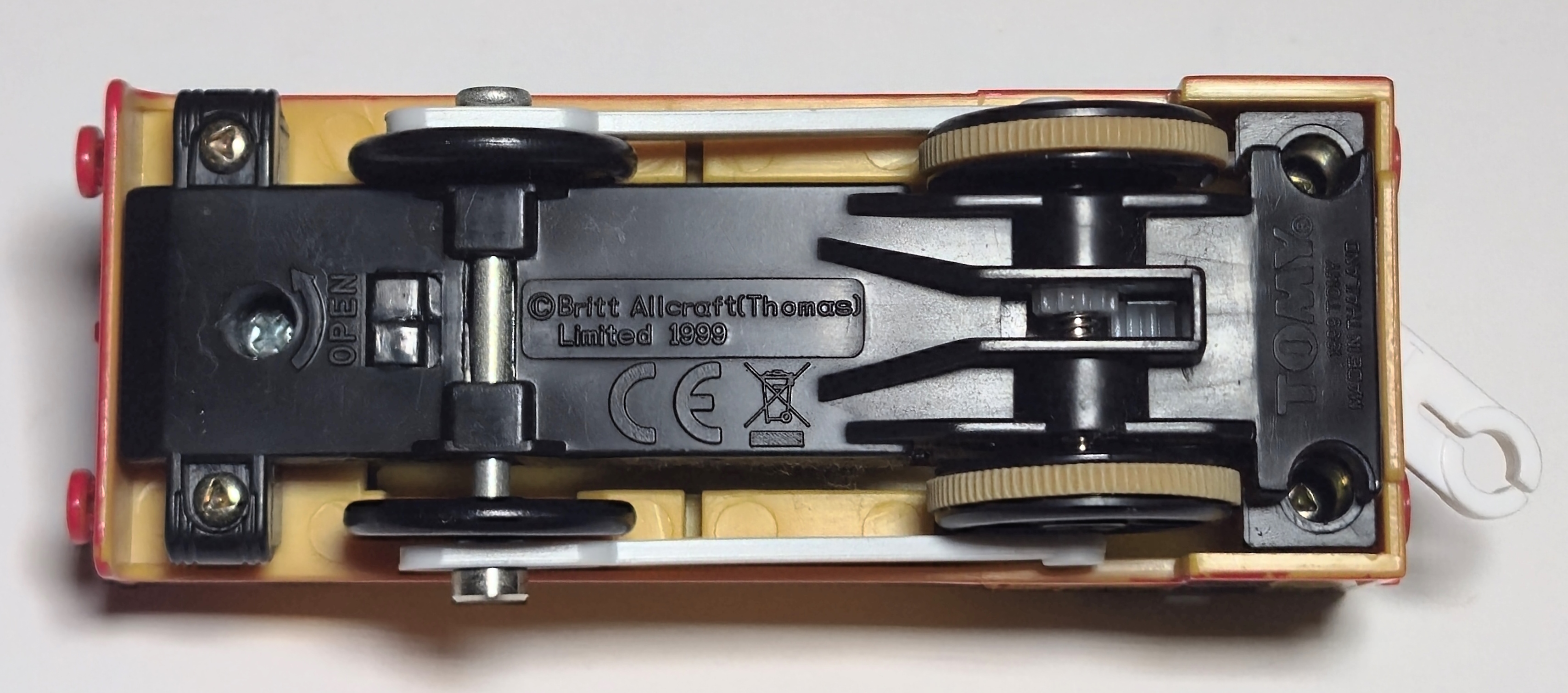 The Tomy logo had been updated to the new squared-off type on the chassis but the CE and do-not-dispose marks were not added until the mid 2000s.
