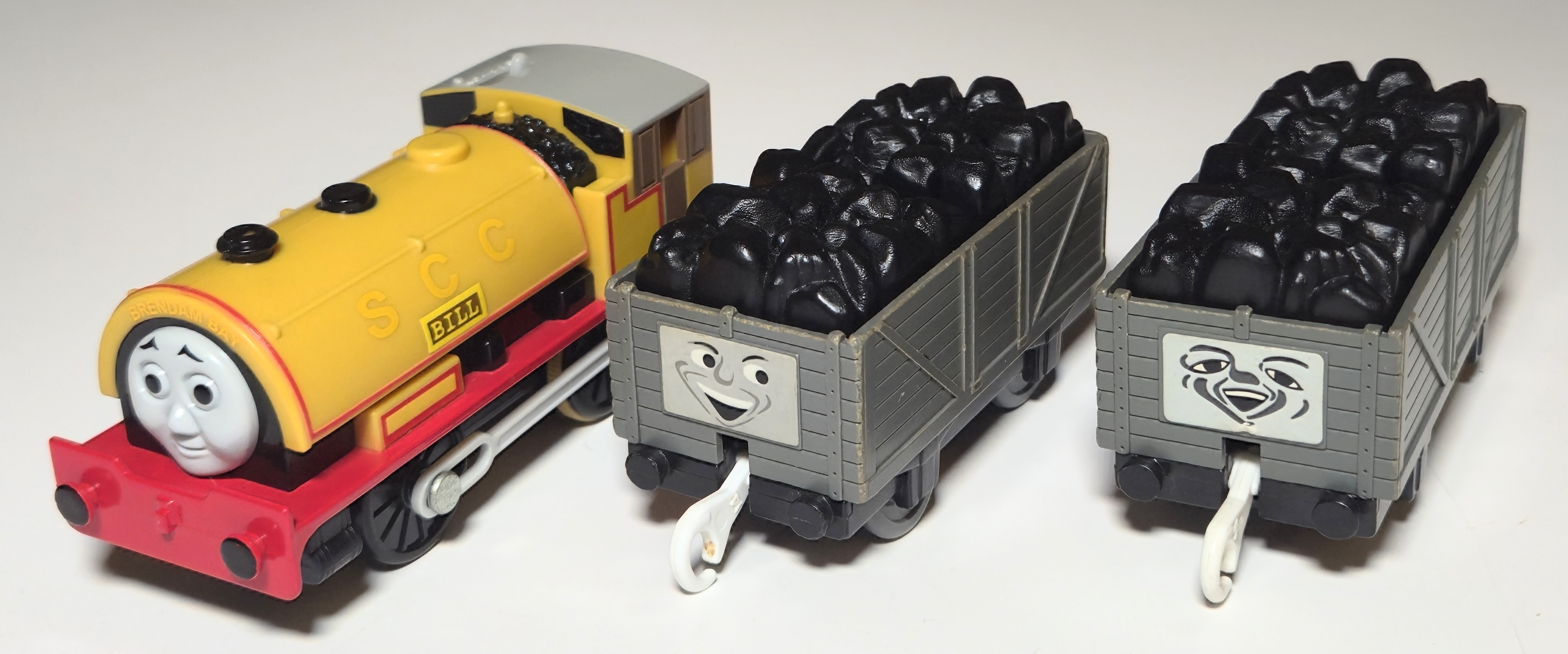 In 2006 Bill was released with two coal trucks in blue Motor Road & Rail packaging for the European market. These export Bills all use the later CE and do-not-dispose mark chassis.