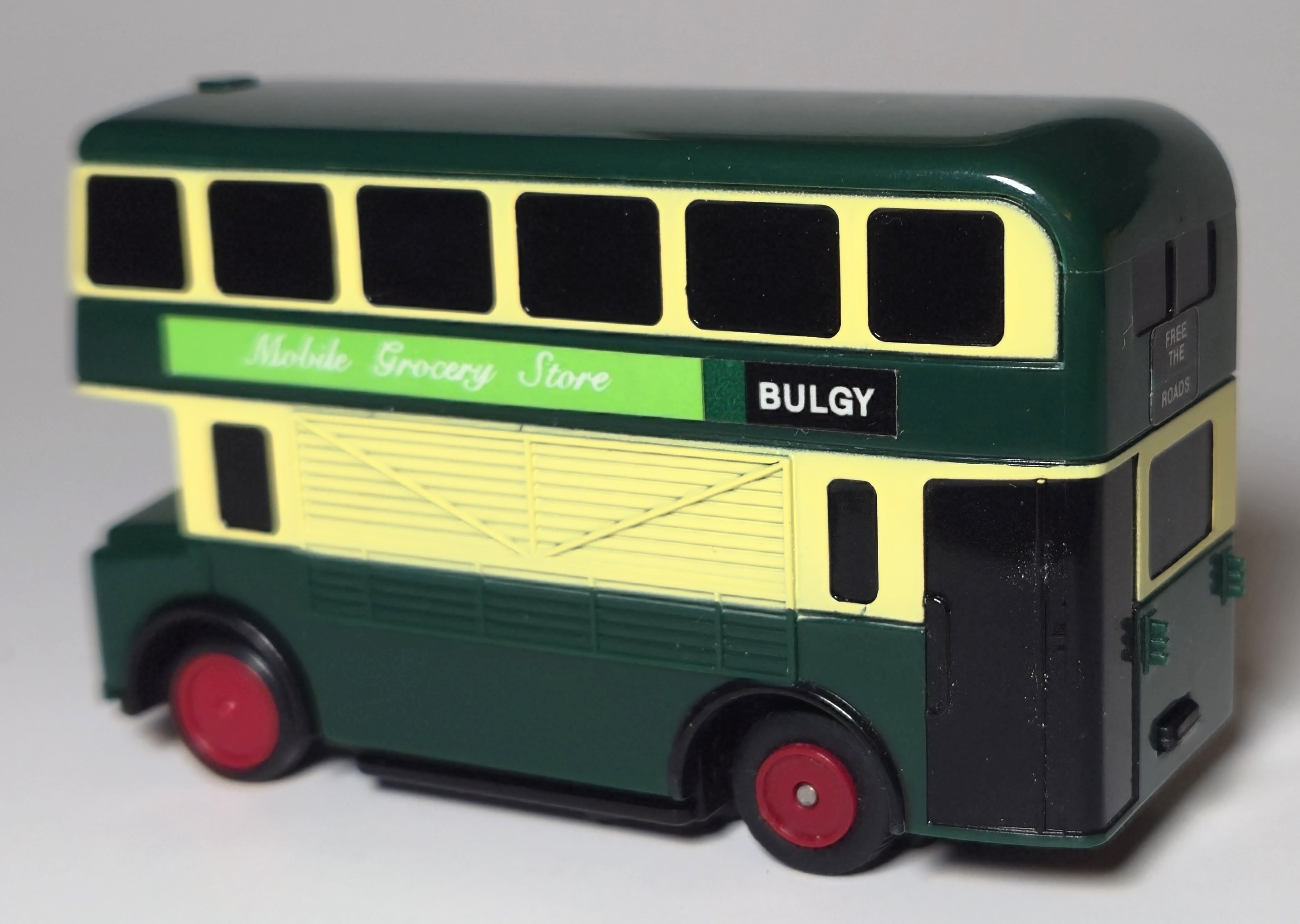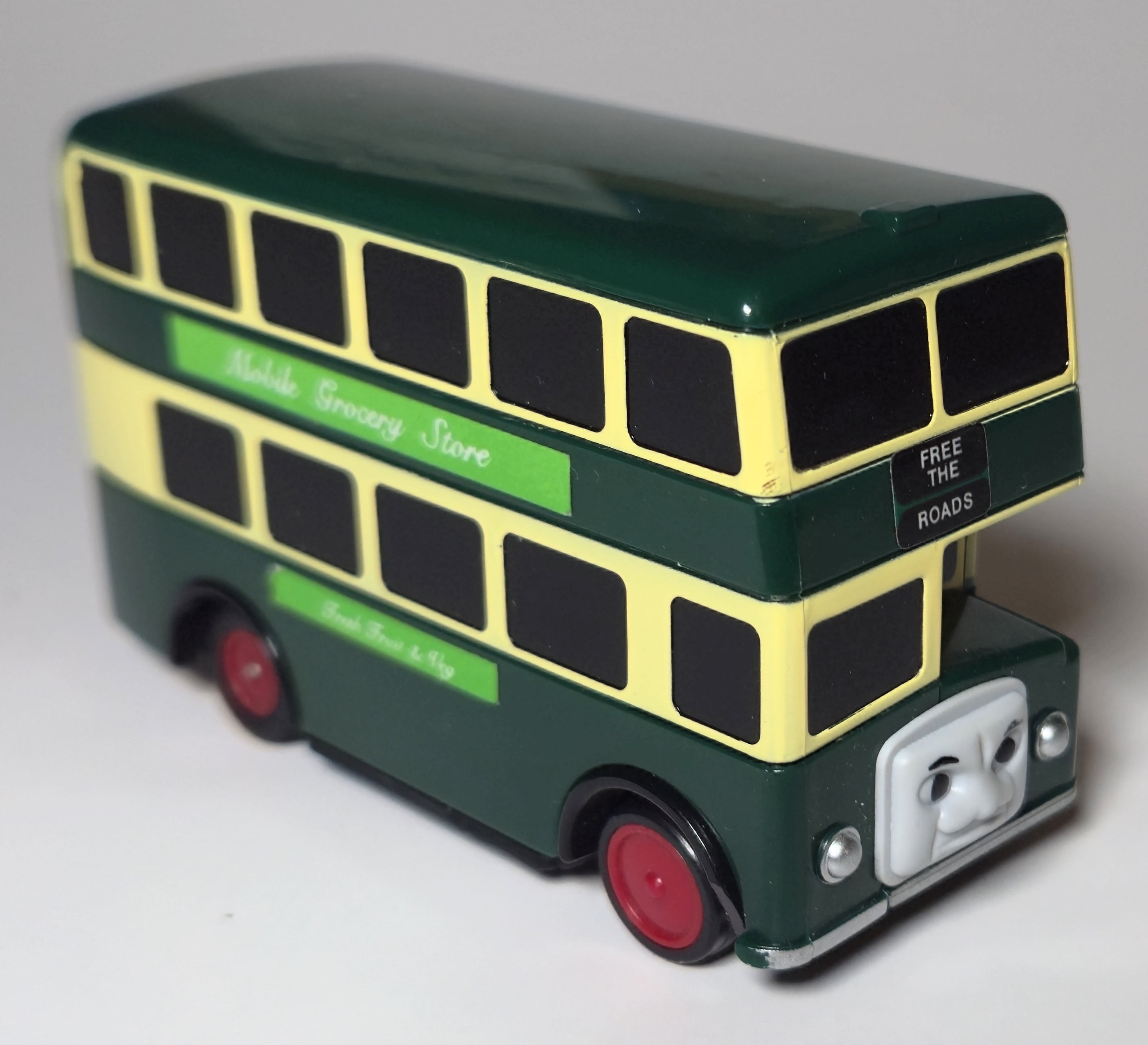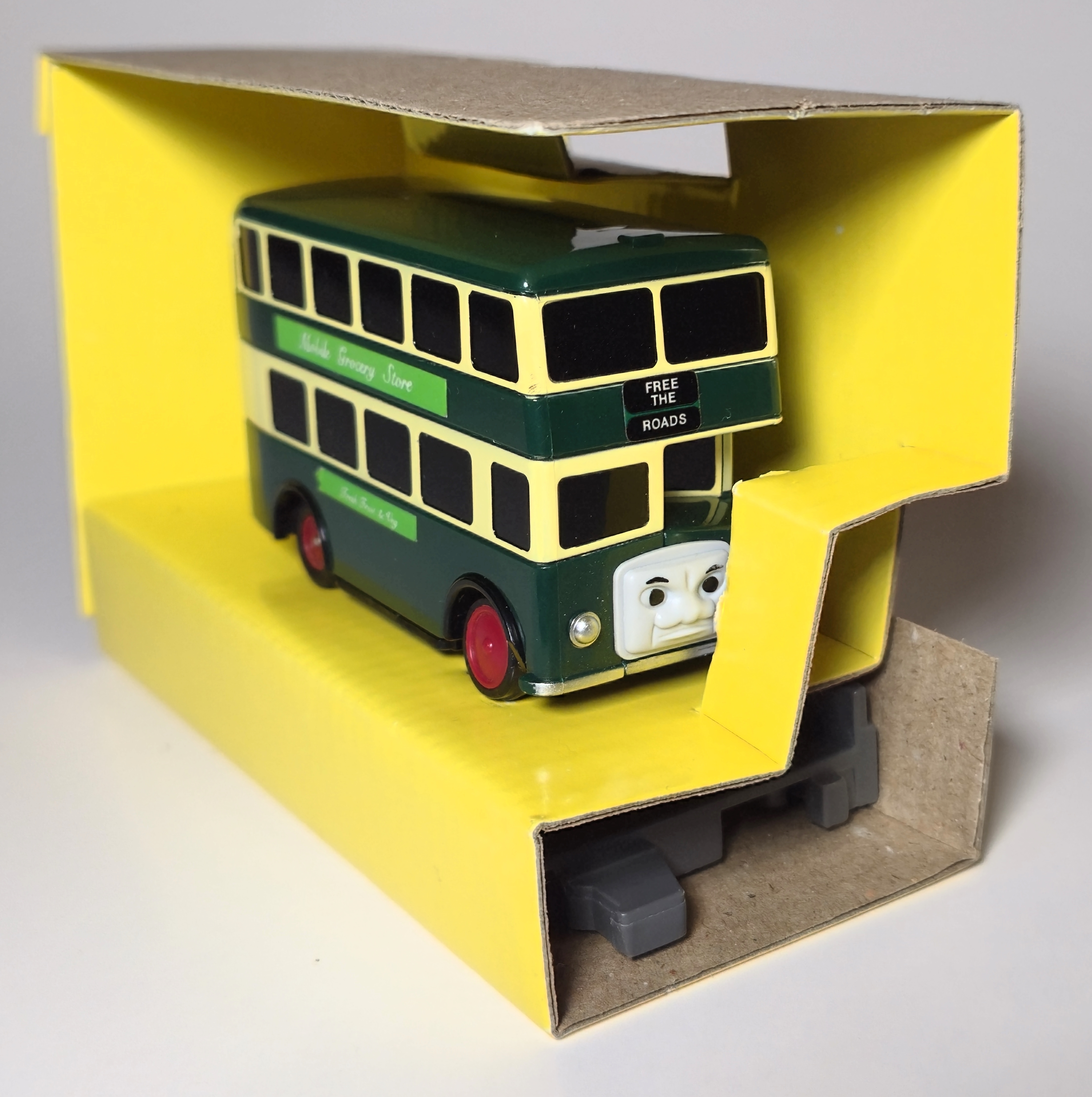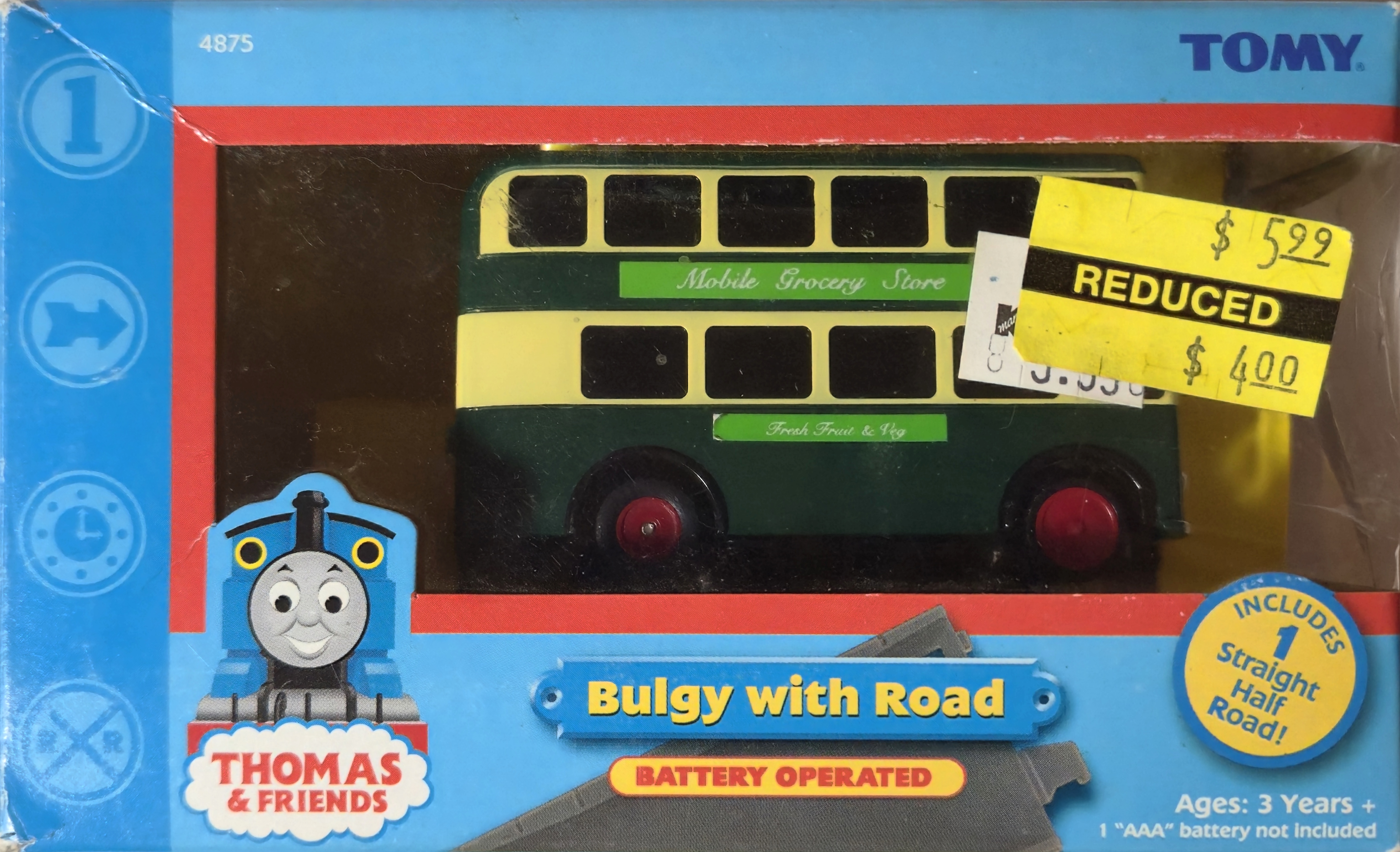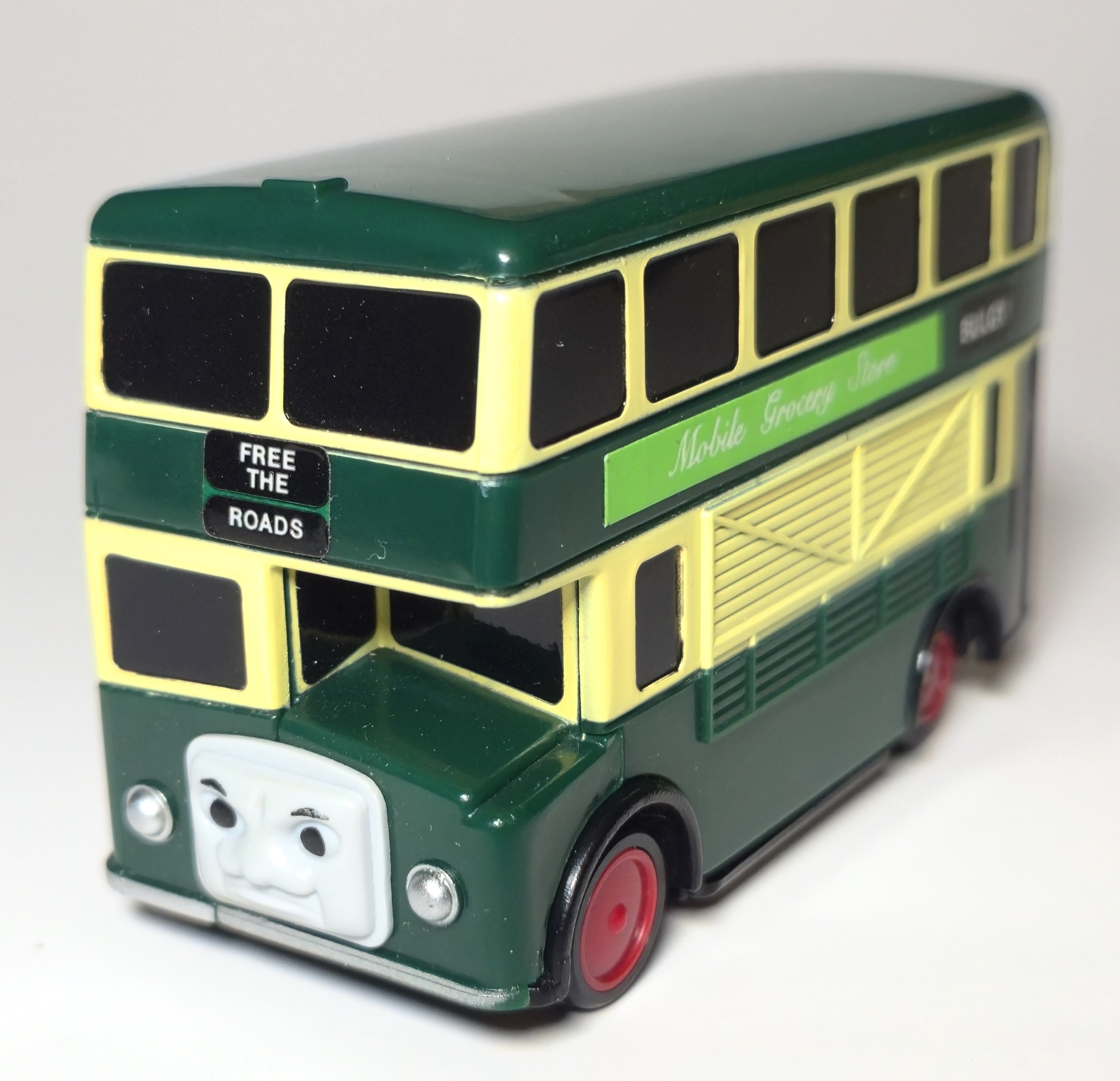 In 2004 Motor Tomica was relaunched as Plaroad and several Thomas characters were released in Plaroad packaging including Bulgy in a new green appearance. The tooling was changed to include a grocery delivery door, reflecting his appearance in later series of the Thomas television show.