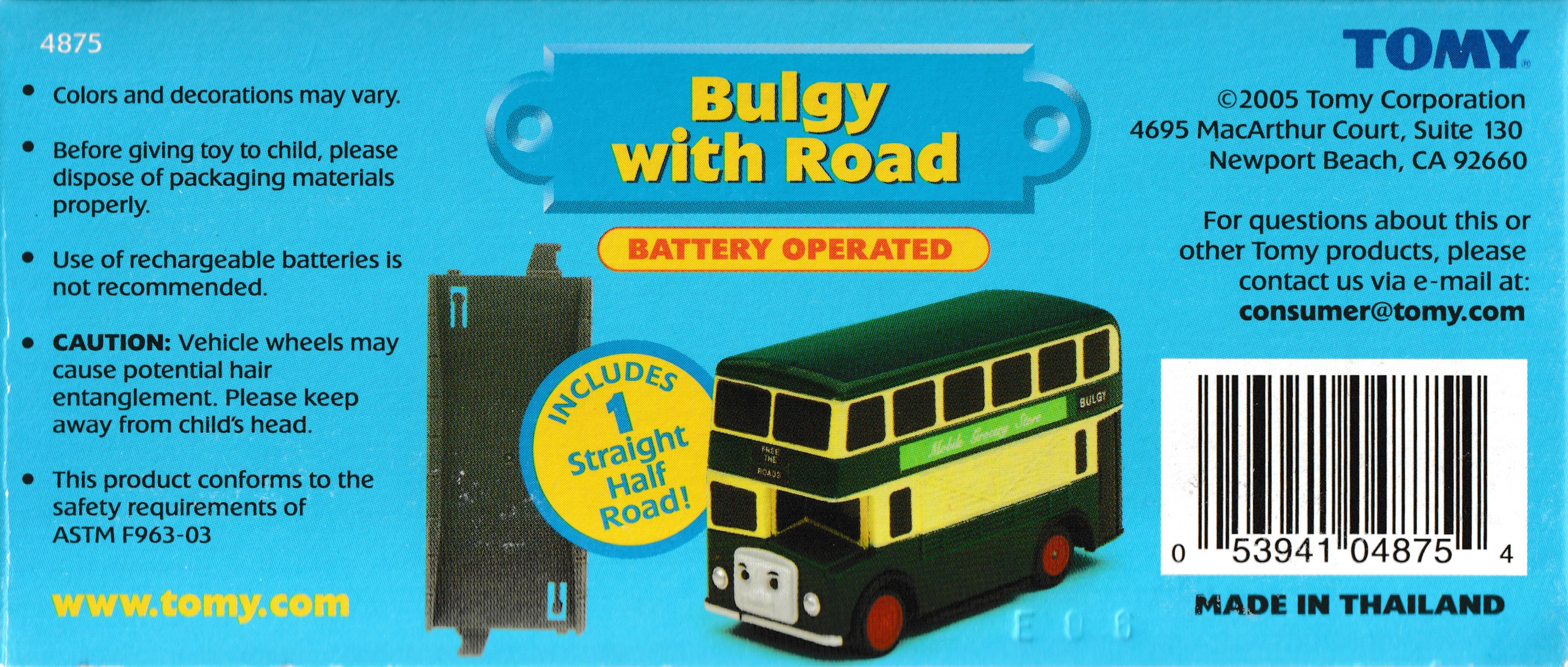 Tomy first produced Bertie the Bus for the Motor Tomica system (then called B/O or Battery Operated Tomica) in 1995. In 1997 a Bulgy shell that used the same chassis was developed and first released in the Thomas the Tank Engine and Bulgy Set and then released individually in 1998. In the 2000s an updated green version matching Bulgy's later appearance in the television series was released in Japan and in the export Motor Road & Rail series. Unlike most Motor Tomica, Bulgy and most other Thomas characters use AAA batteries instead of N size batteries.