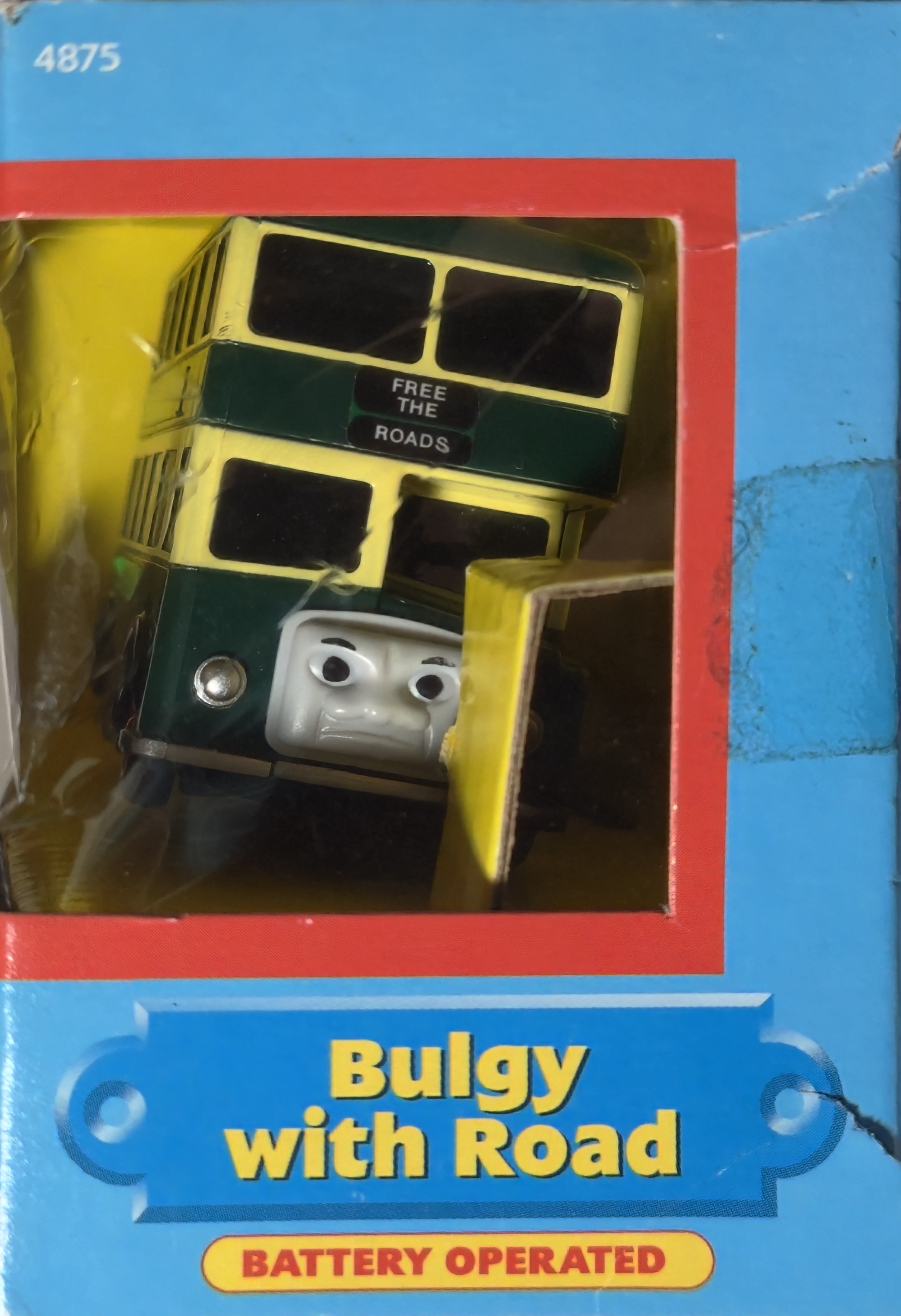 In 2006 Green Bulgys were released in the United States in the window-box packaging shown here with a half straight road piece. This particular example was sold at Kmart on a discount - $4.00 is not too bad of a price, and even 6 dollars to begin with is pretty good. It dates to May 2006, as noted by the impression on the bottom of the box and the sticker inside Bulgy himself.
