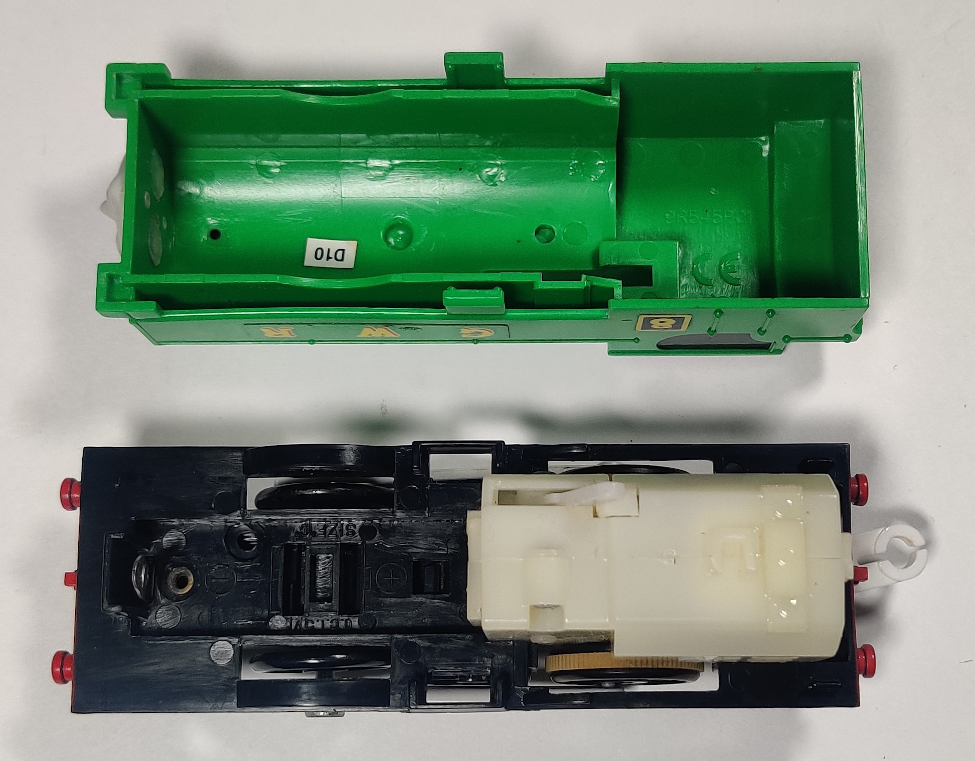This early Duck has the GWR and 8 stickers positioned closer to the front of the locomotive than later production examples. The inner wall on the right side of these 1997 production locomotives is flat but by 1998 the tooling had been updated with a slot to help the body shell be removed around the gearbox.