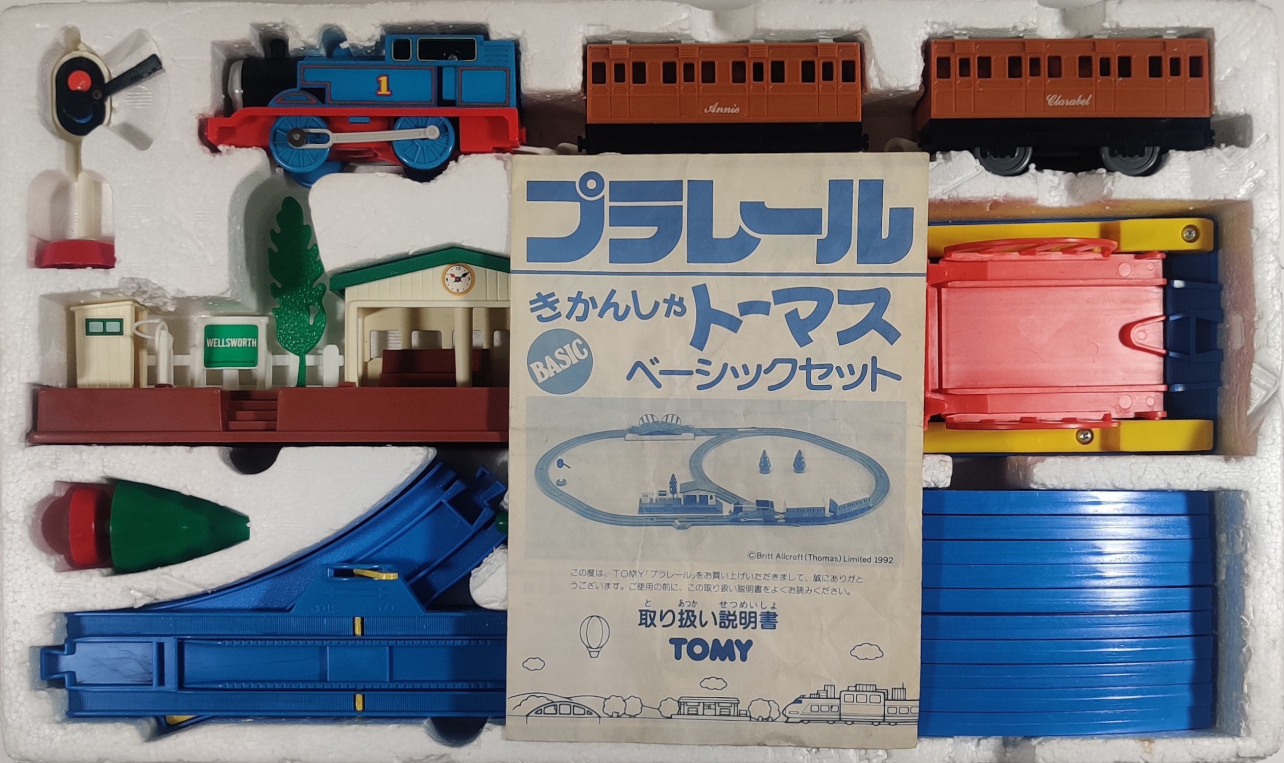 The original Thomas the Tank Engine Basic Set was released on April 17, 1992 and was the second set in the Thomas series of Plarail sets, trains, and accessories. It features Thomas and his two coaches Annie and Clarabel, and a layout similar to the classic Basic No.2 Set layout with Wellsworth Station, block tunnel, and drawbridge.