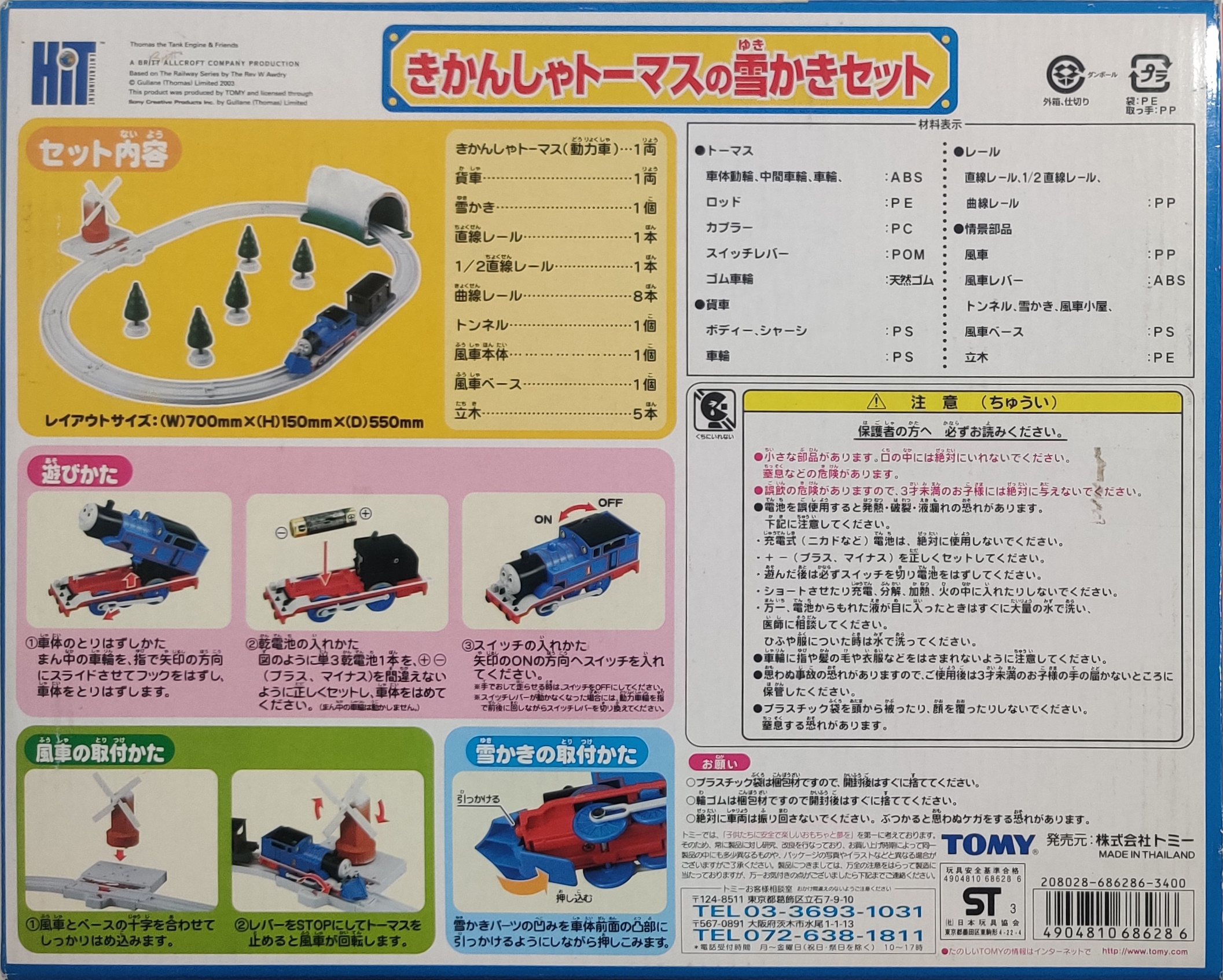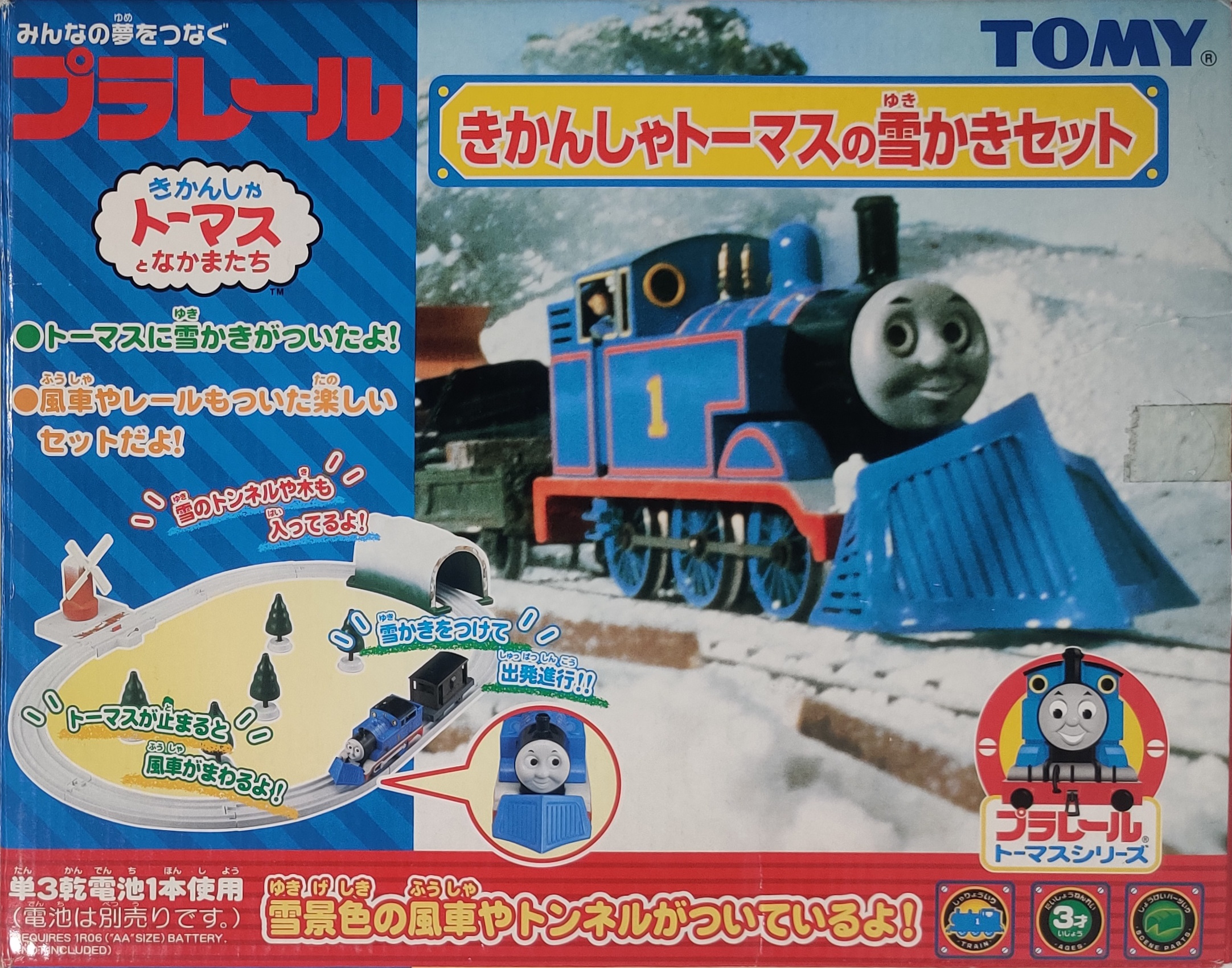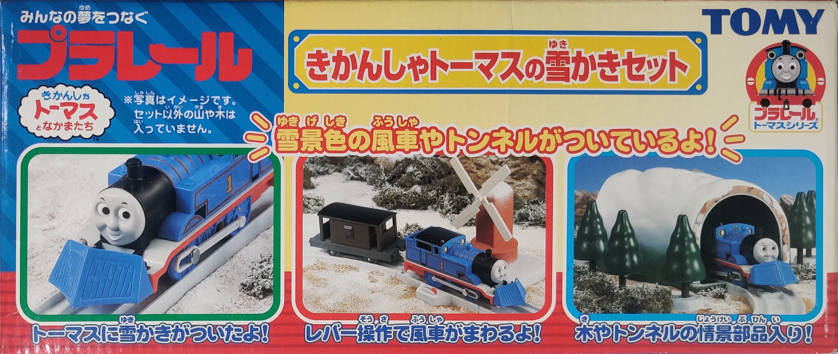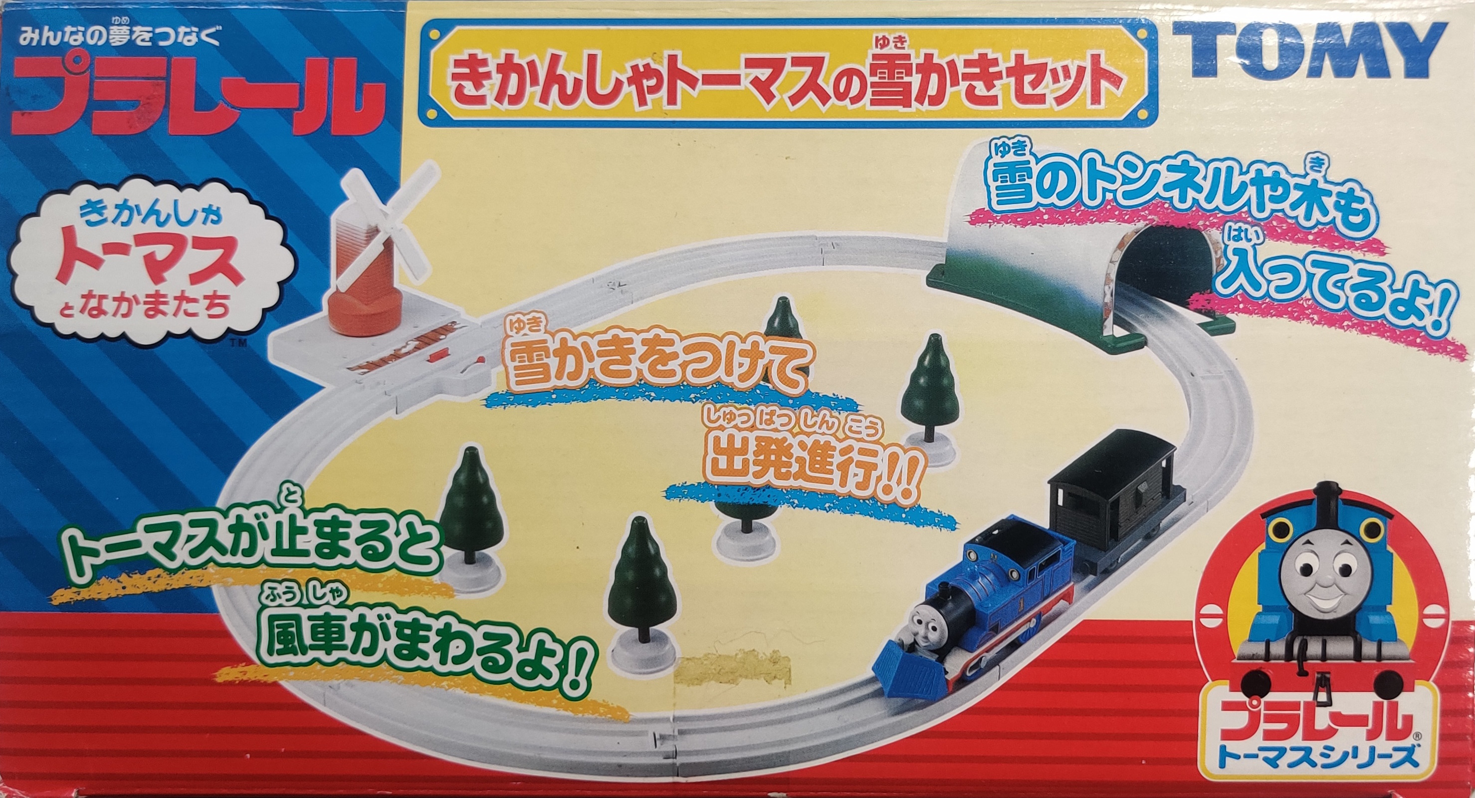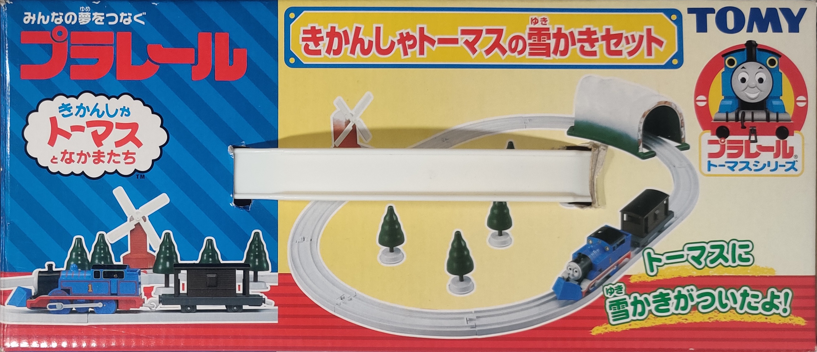 The Thomas the Tank Engine Snow Shoveling Set (きかんしゃトーマスの雪かきセット) was released for the Thomas Plarail series of toys in December 2003. This set includes Thomas with a clip-on snowplow, a brakevan, and an oval of track with accessories.