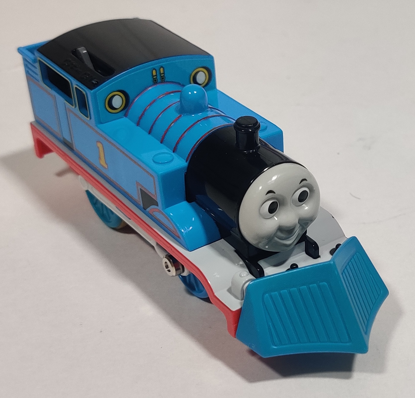 The snowplow is removable but with age the blue plastic used turns green and brittle - I think at this point pretty much all of them are more fragile than when new and may not survive repeated connection and disconnections. This is the same tooling as used with a white paint application for the Talk 'n' Action Thomas in the export Thomas Holiday Set.