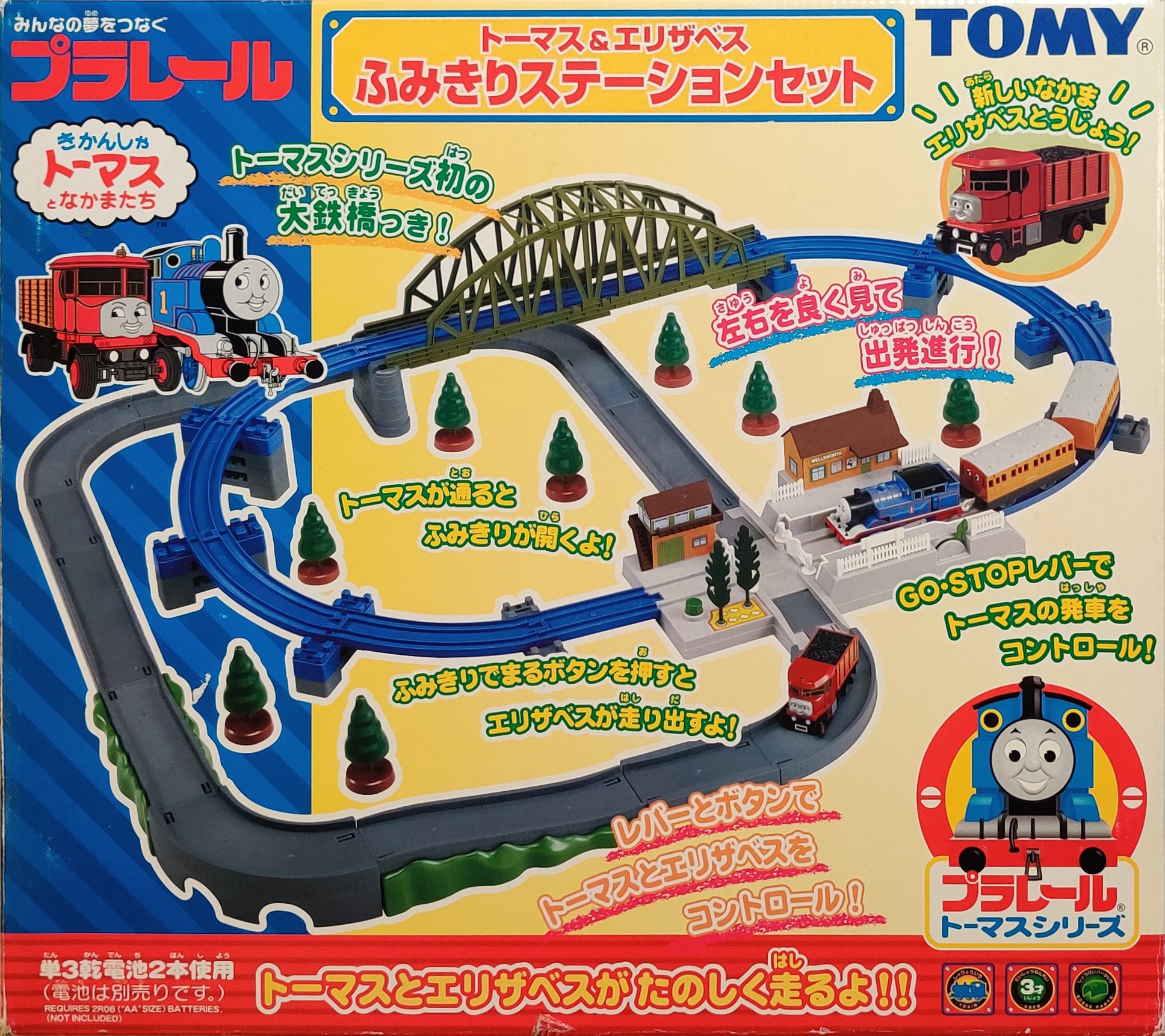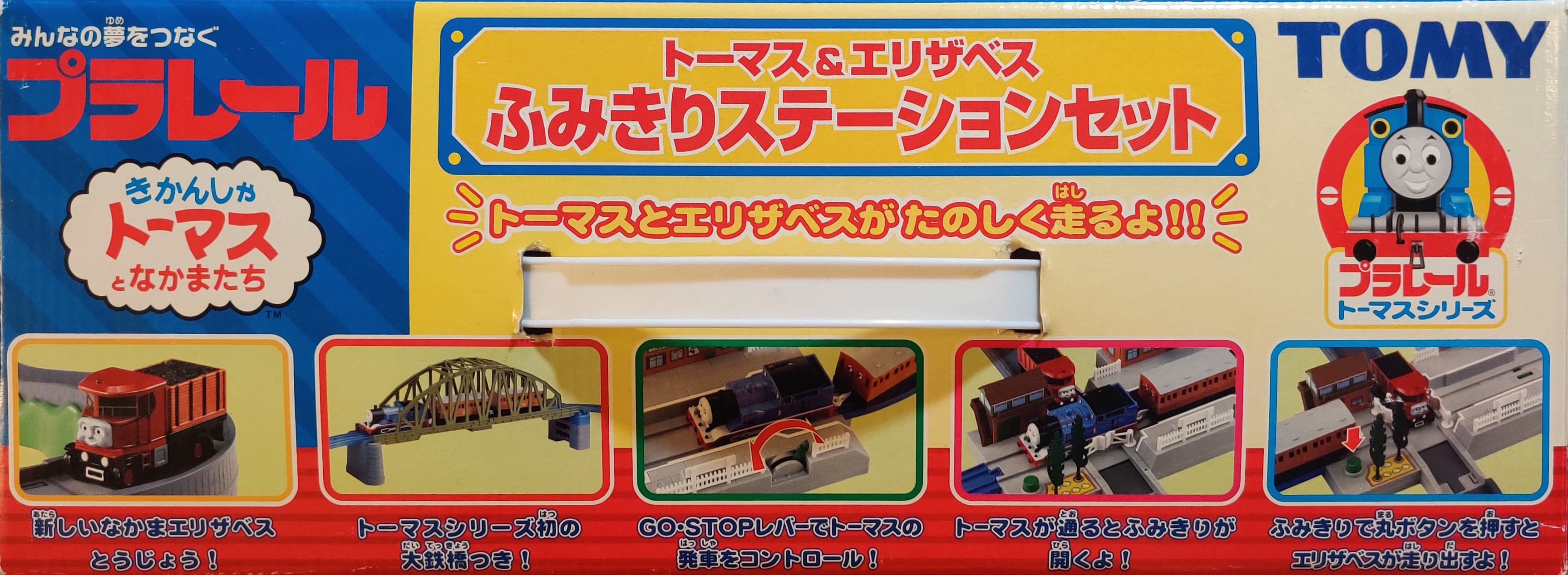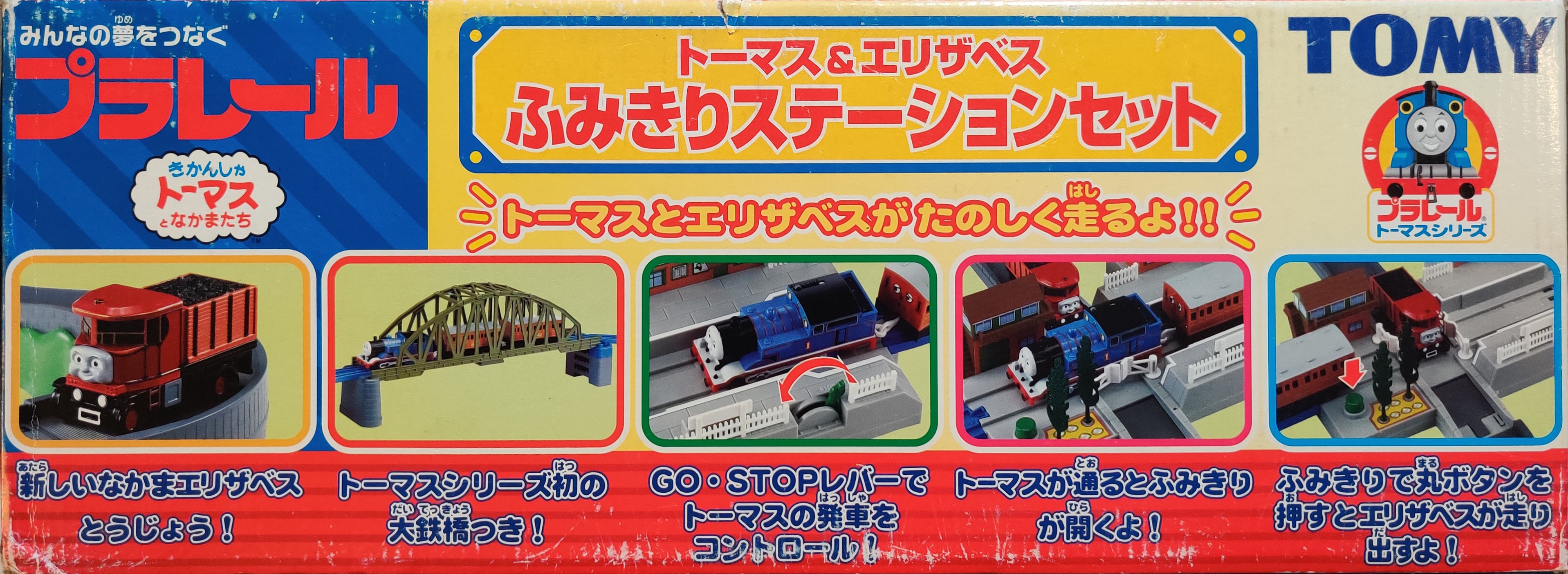 The Thomas and Elizabeth Railroad Crossing Station Set (トーマス&エリザベスフミキリ駅セット) was released for the Thomas Plarail series of toys on September 25th, 2003. This set includes the new-for-2003 updated Thomas with Annie and Clarabel as well as the first release of the motorized Elizabeth.