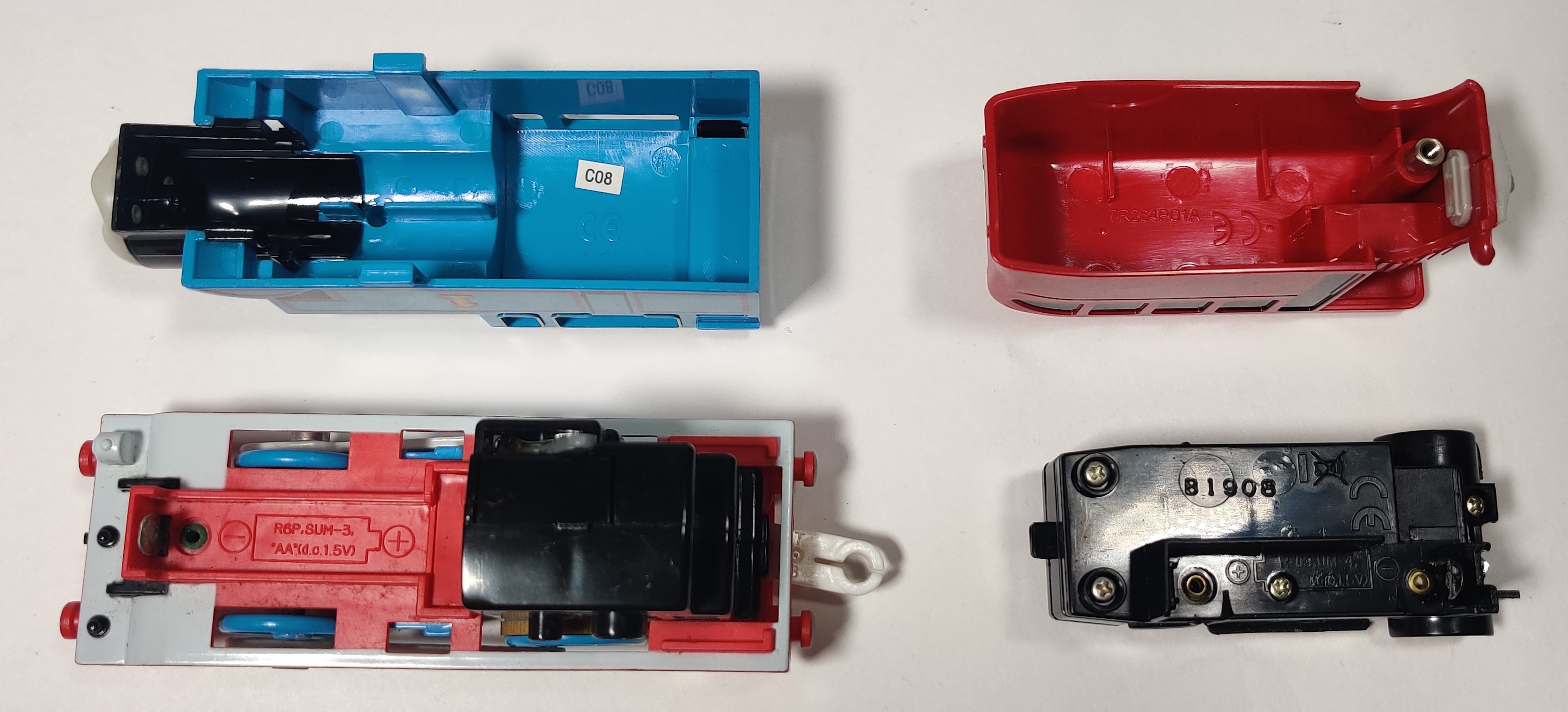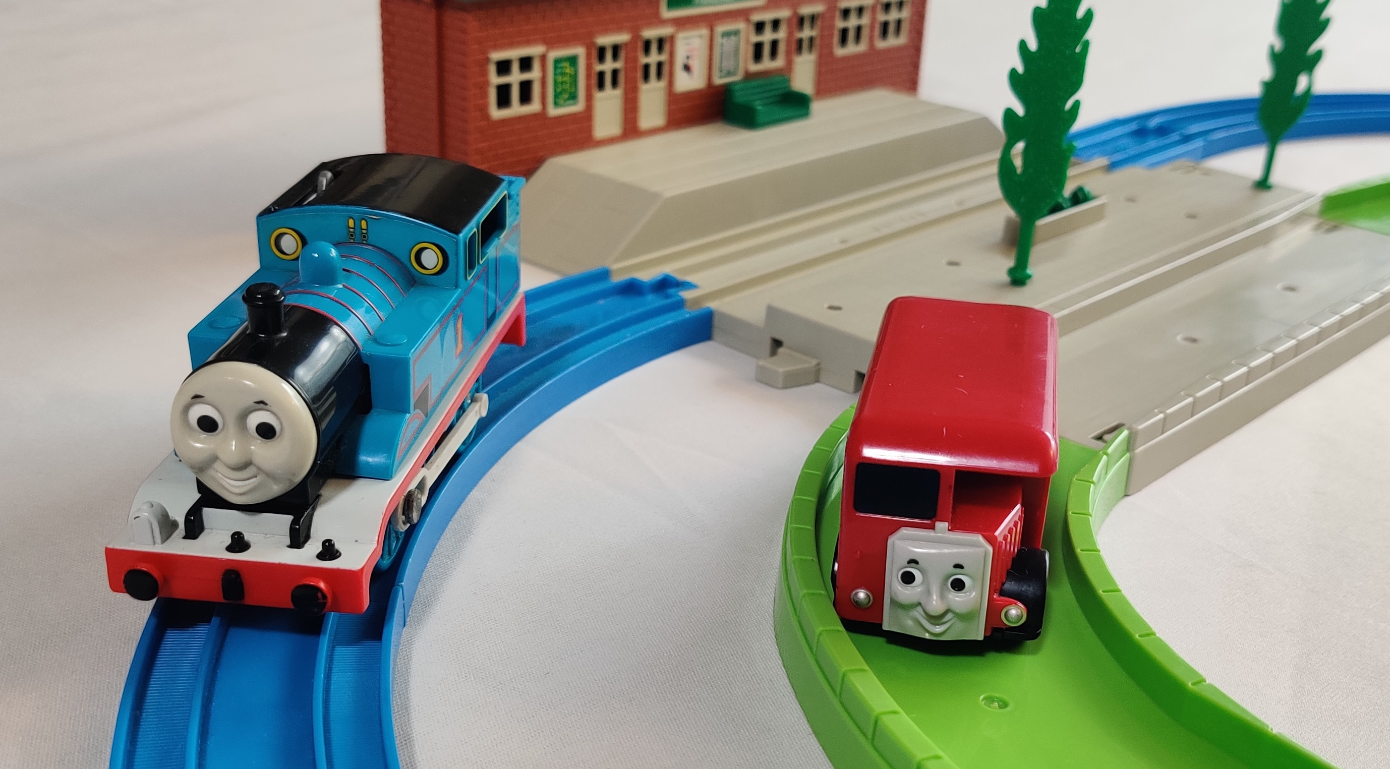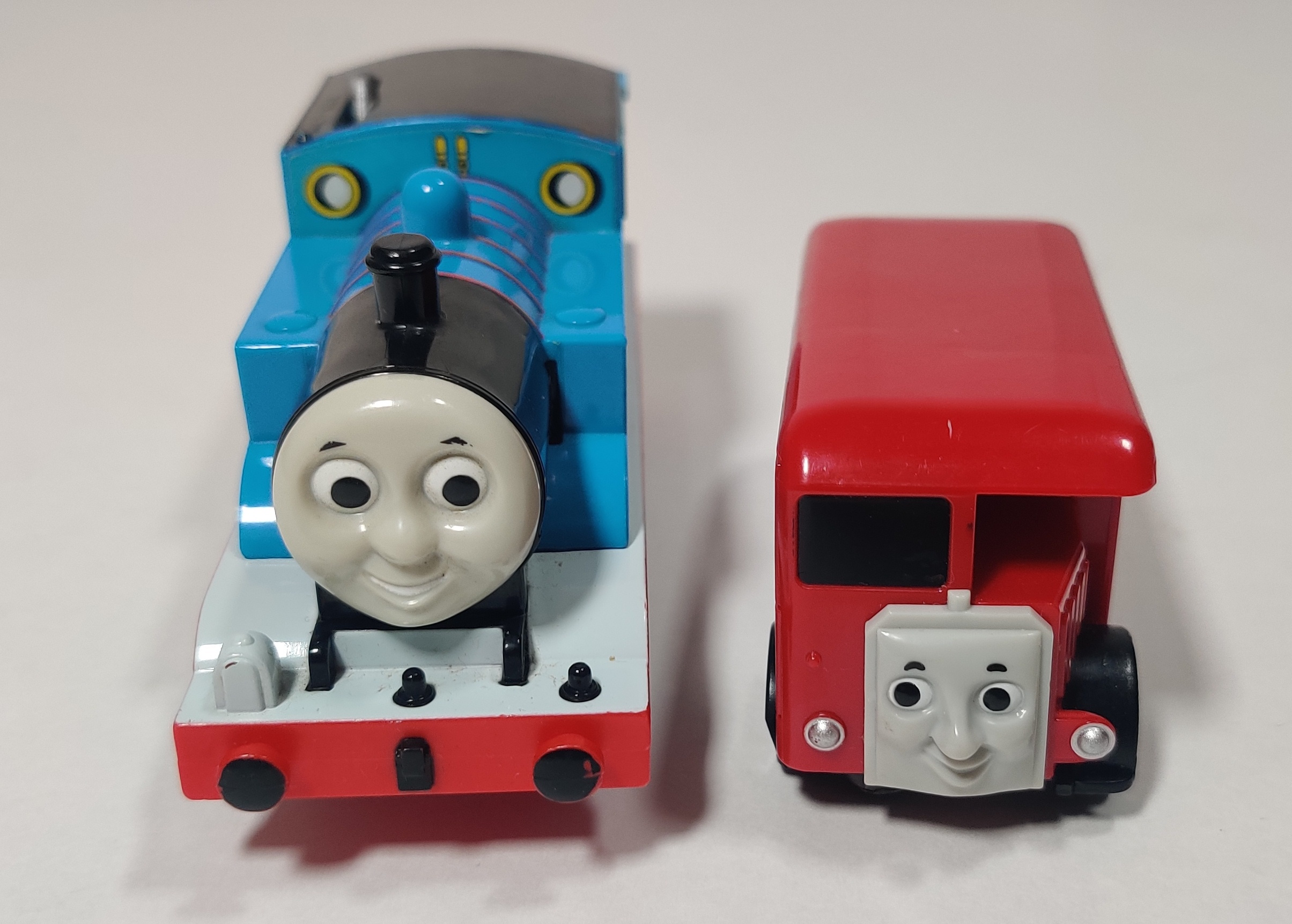 The Thomas and Bertie in this set are slight variants - the Thomas is looking to the left and the Bertie has painted eyes looking to the right. It is neat that the two friends are looking over at one another. Like other sets, this one relates to the story of Thomas and Bertie racing together along their passenger route.