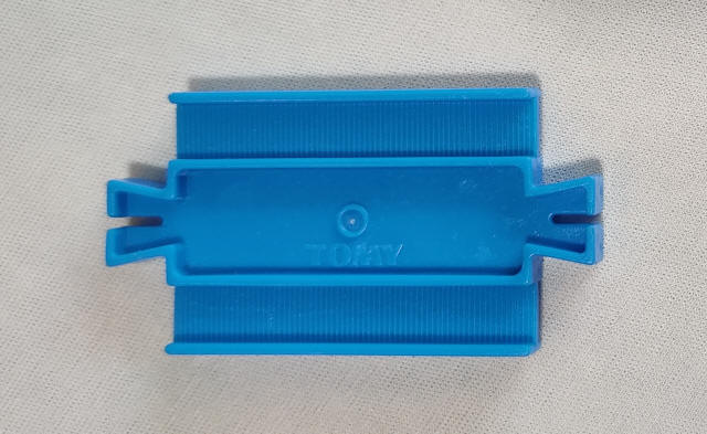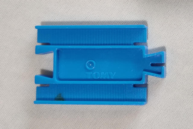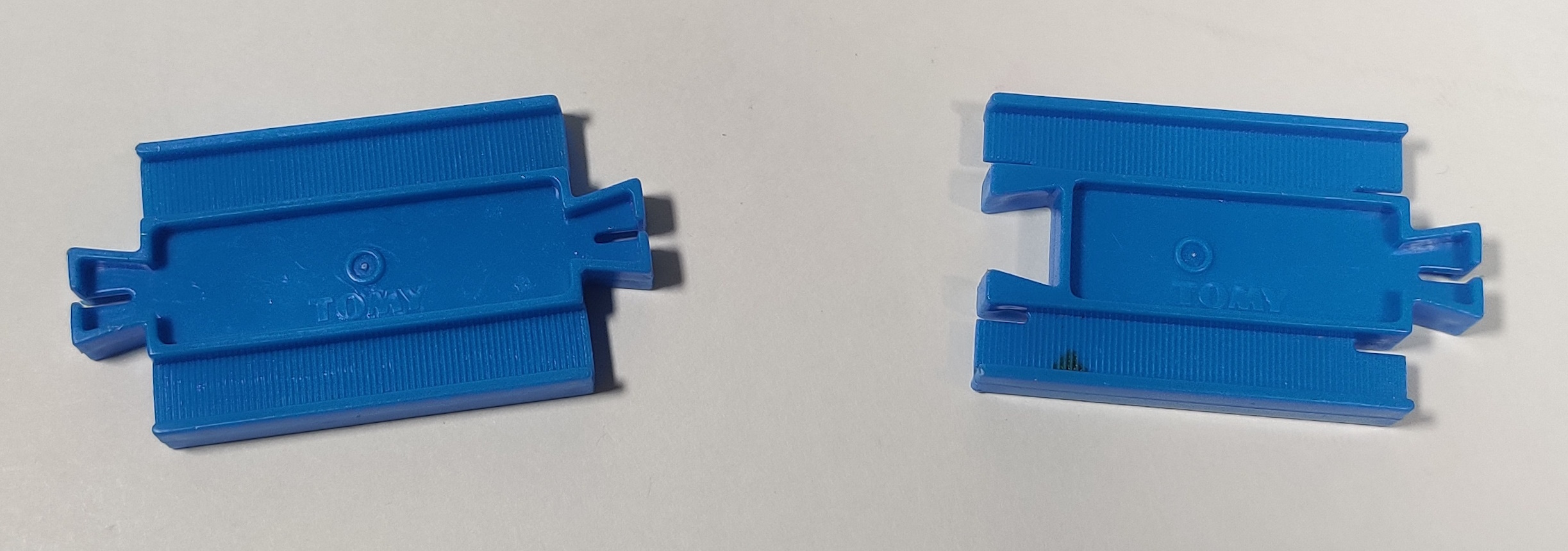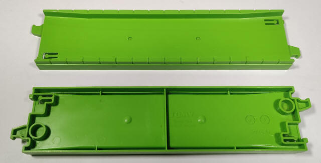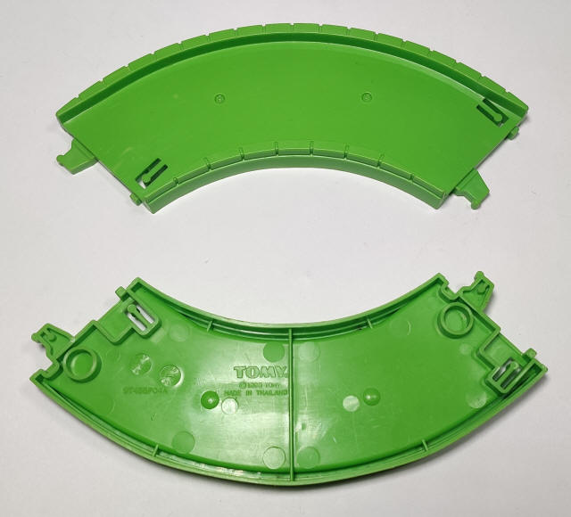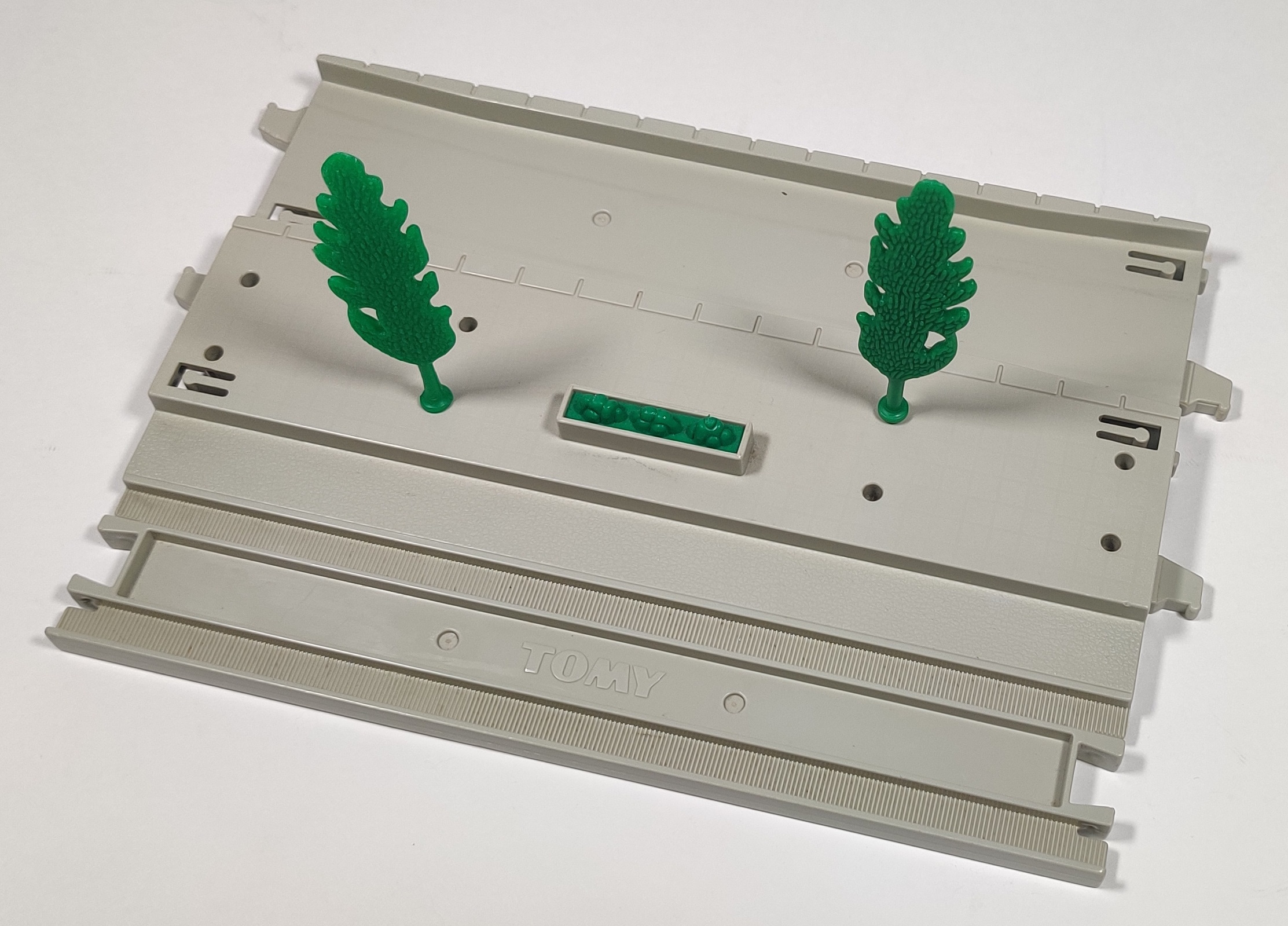 Because the parallel road and rail section has two concave rail connectors, a double convex quarter straight rail and a regular quarter straight rail were included to complete the loop of track. The rest of the road in this set is lightish green Plaroad, which was reaching the end of its life in 2008.