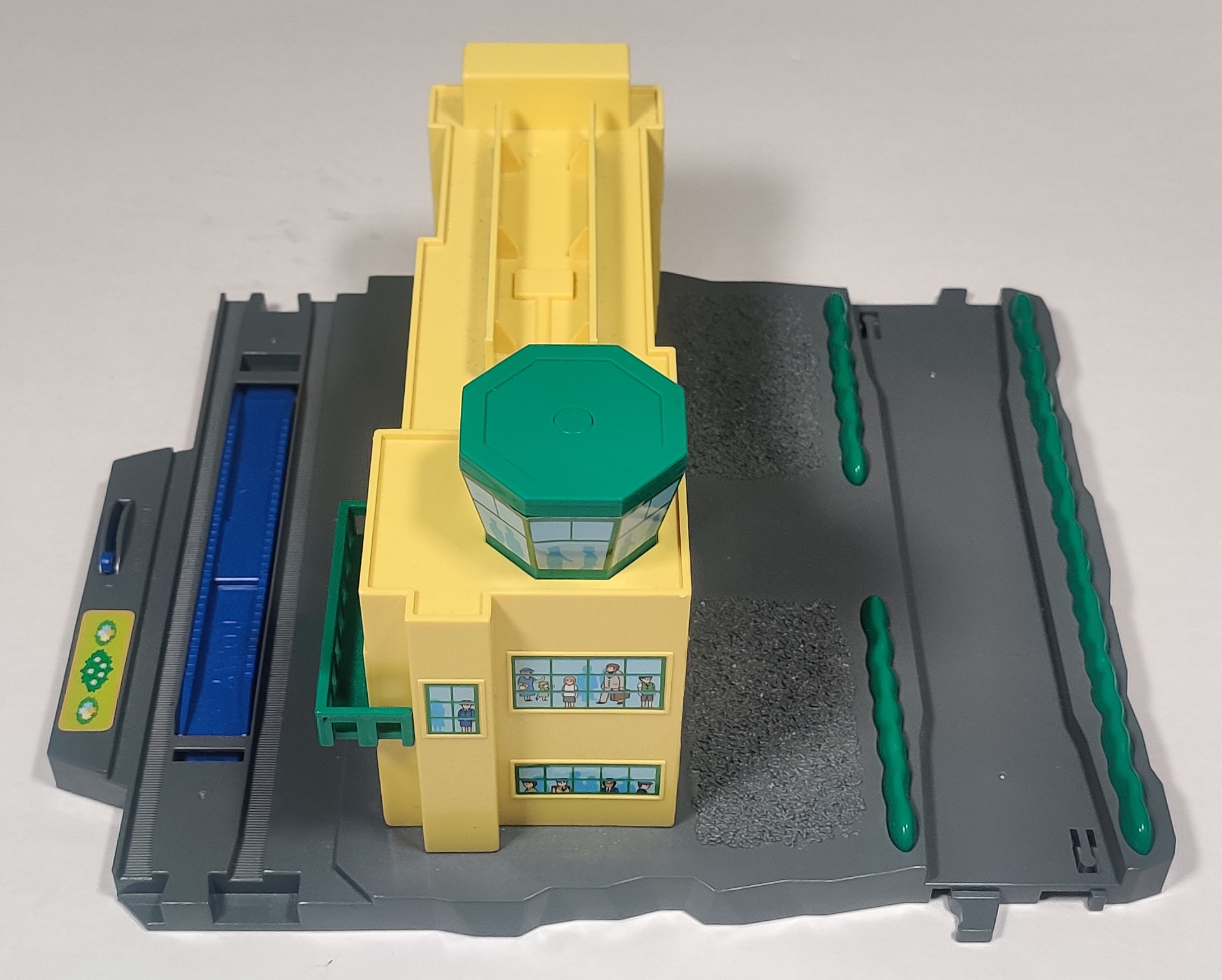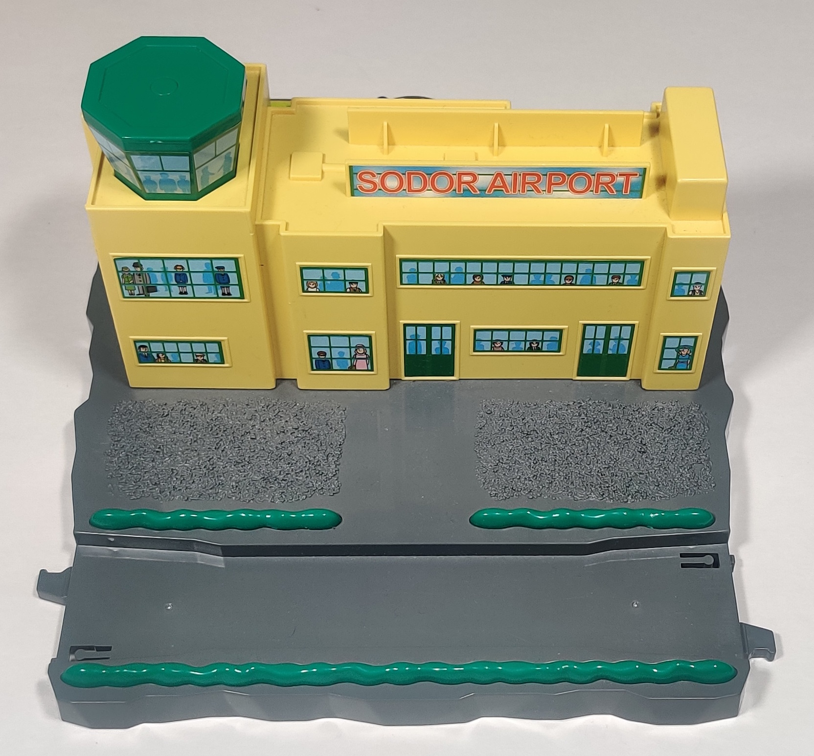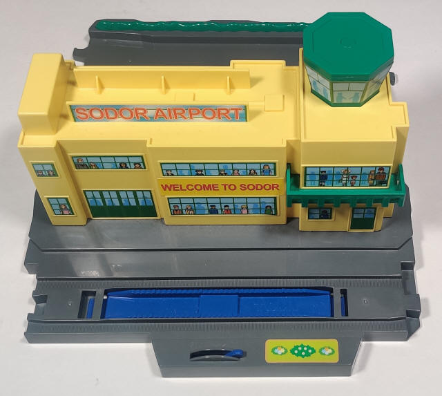 The airport has a rail section on one side and a Motor Tomica-style road runway/tarmac section on the other. Stickers show people inside unlike the export version, which appeared empty, but the sign sticker is a little worse on this one in my opinion. The European airport has a road stopper around the back but that was removed from this version. Both of these airports use the same main airport building as the export-only Calling All Engines - Thomas and the Airport Set from 2005 but on the new larger road and rail base.