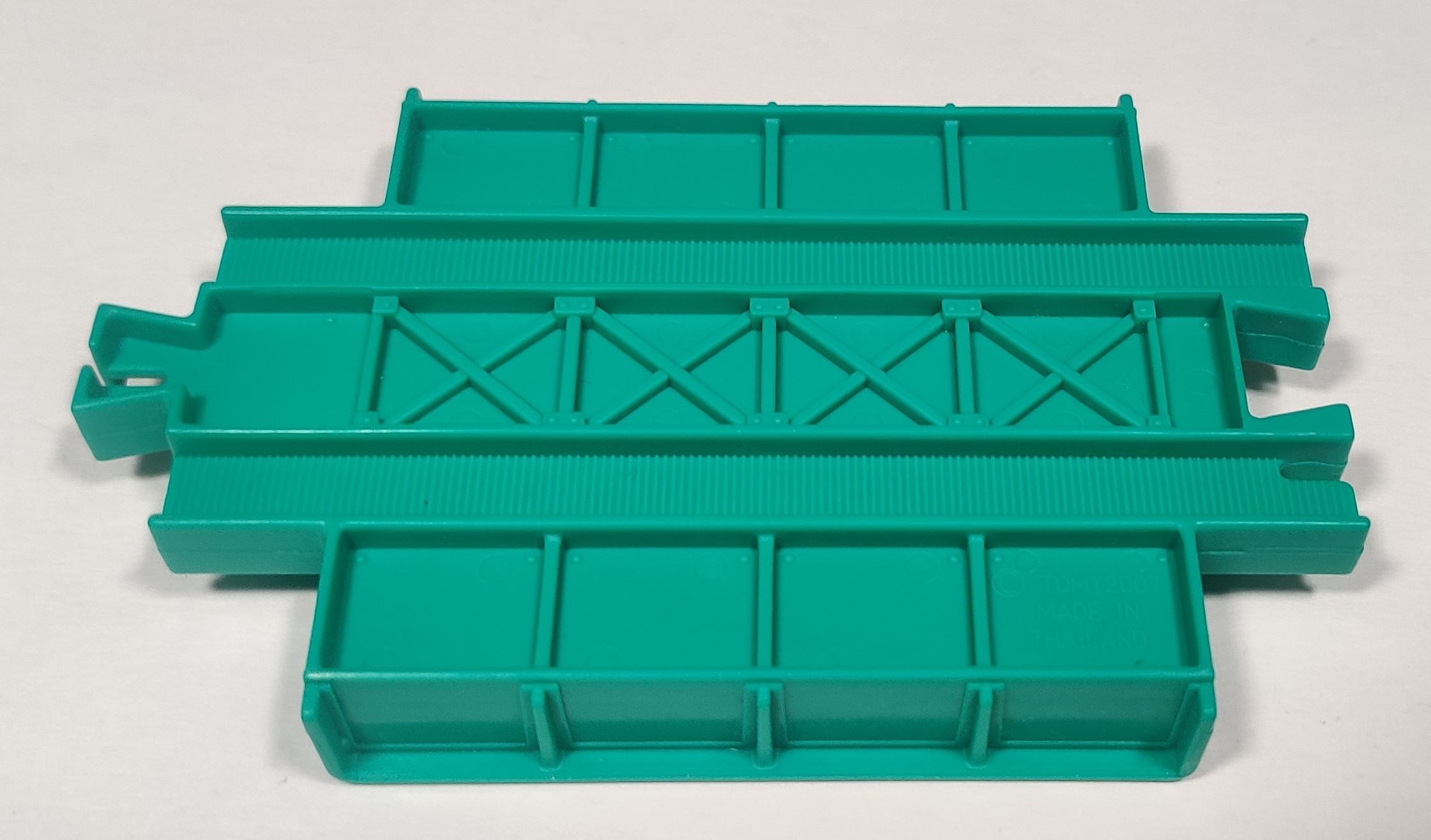 The set also has a few translucent blue road sections meant to represent sky or air where Jeremy takes off. The transparent blue road ramp was exclusive to this set. The block tunnel in this set is a darker green variant with what looks like large concrete bricks on the portal stickers, and a green girder bridge is also included and can be placed in multiple places around the layout. Two lighter green trees are also included.