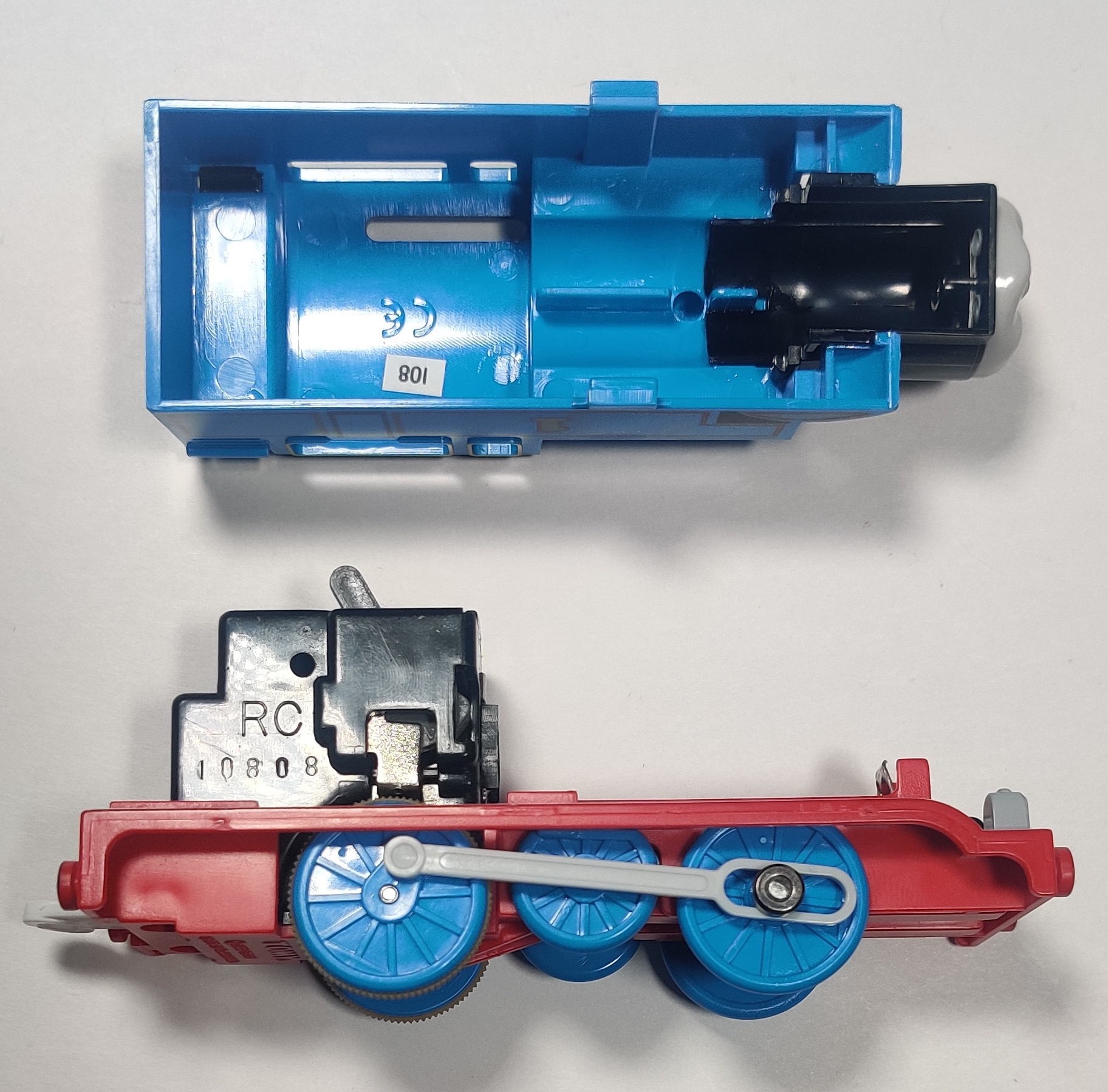 The Thomas in this set has his eyes looking up (and, I think, the eyebrows a little lower than usual) so that he can look up at Jeremy as he "flies." The Annie and Clarabel in this set are regular, and a bit of a downgrade from the slate wagons with cargo that was included in the European set. The Thomas in my set was produced in September 2008.