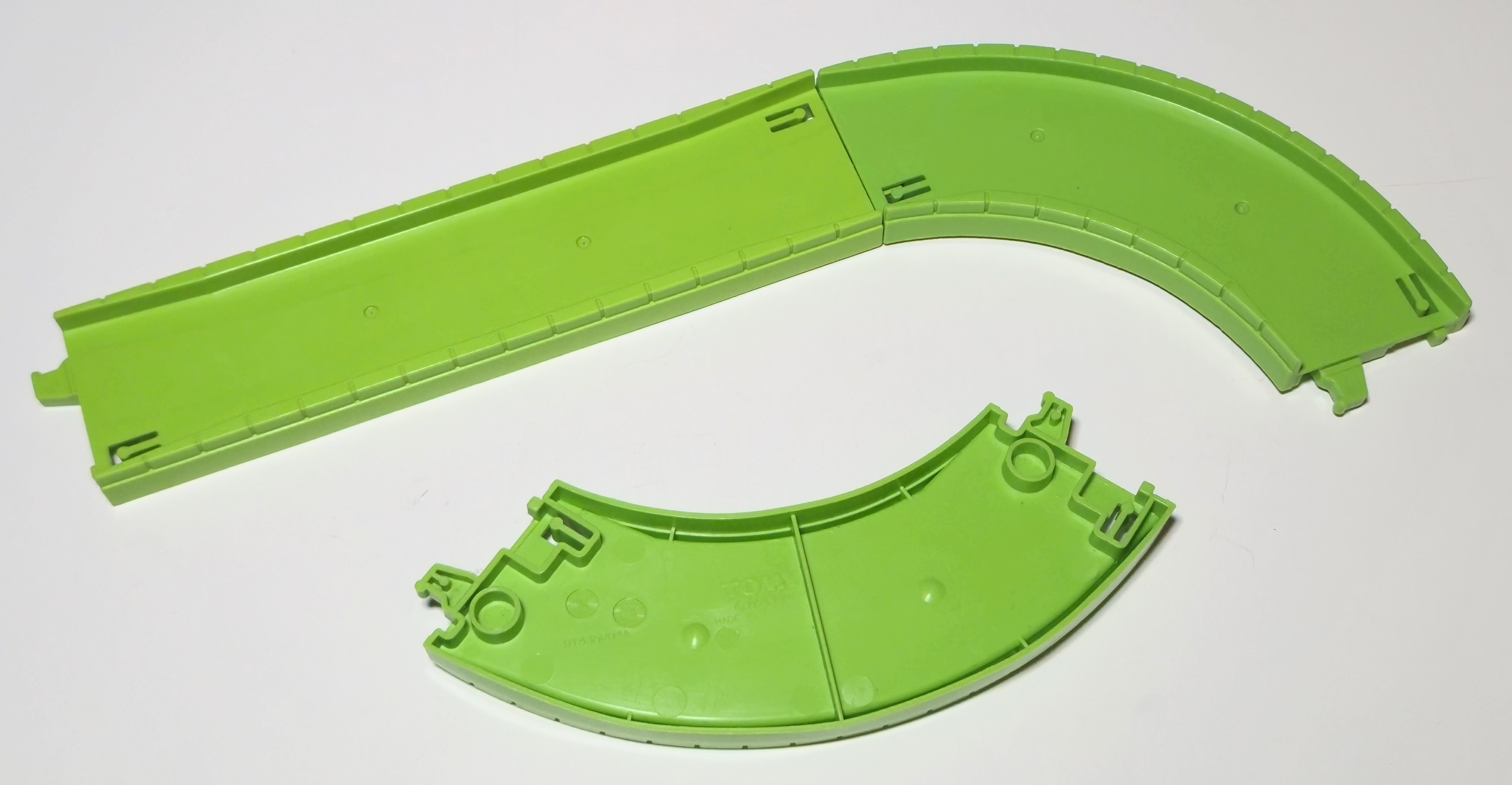 Because the parallel road and rail section has two concave rail connectors, a double convex quarter straight rail and a regular quarter straight rail were included to complete the loop of track. The rest of the road in this set is lightish green Plaroad, which was reaching the end of its life in 2008.