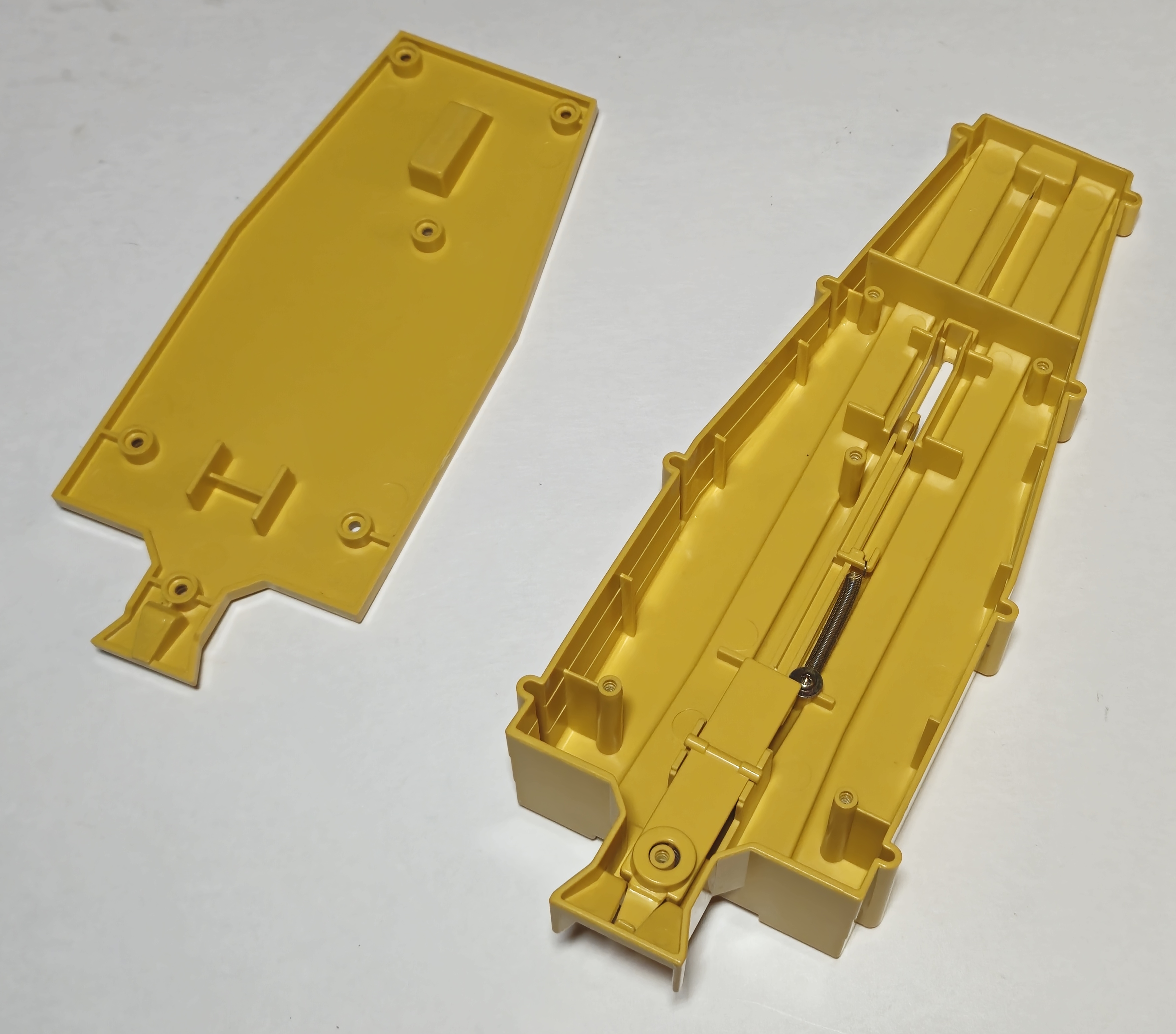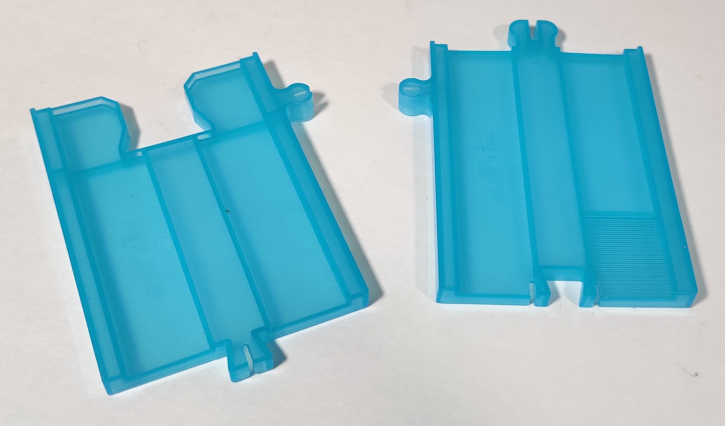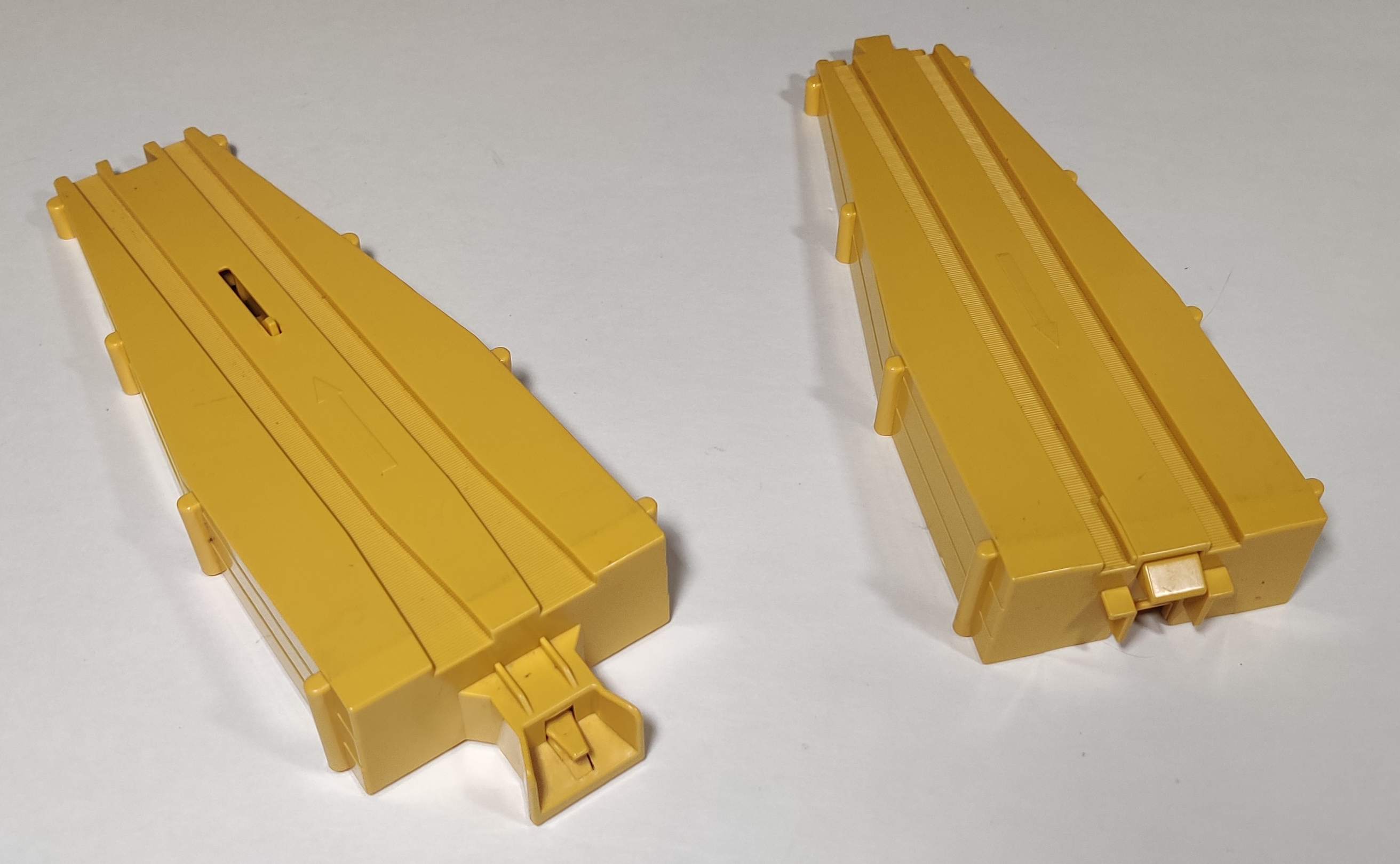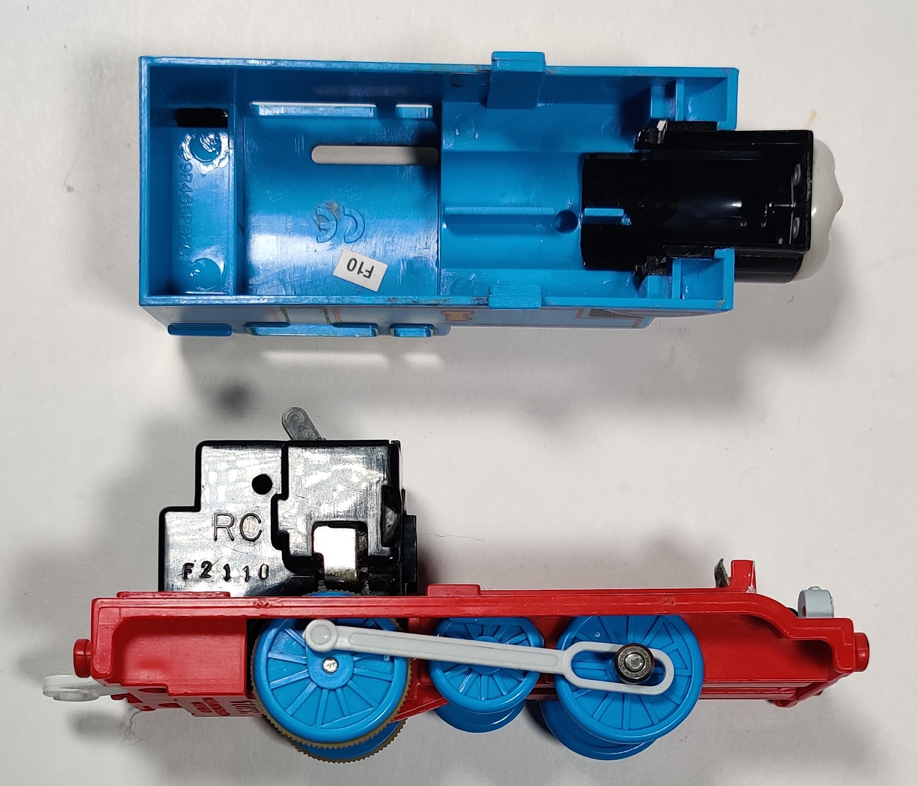 As you could see above, Thomas struggles a little bit to get the ferry across. There are a few mechanical issues that have developed with age - this set is very nearly 15 years old at time of writing! When I first got it, the white protrusion in Cranky's base to connect to the ferry arm was not properly linked to the mechanism that actually drives Cranky. Upon disassembling the base and removing the screw holding the two pieces together I found that the key molded into the side of the ferry arm clip that fits inside a keyway in the geared mechanism below had shorn off and was rattling around inside the base. I glued this bit of plastic back into place and the two parts are interlinked again, although I suspect I probably ended up gluing the key into the slot as well, which is probably not too bad a thing and will help keep the two locked together anyways. After solving this problem, I had to rearrange the water track sections and adjust the joints until Thomas would power it all the way around anyways. I wonder if part of the reason Cranky's up and down movement was removed was because trains could not deliver enough power through the transmission system of the ferry and down the arm and against the spring and through the gearing and up Cranky, because it seems like it is already close, at least with a used and 15-year-old motor.