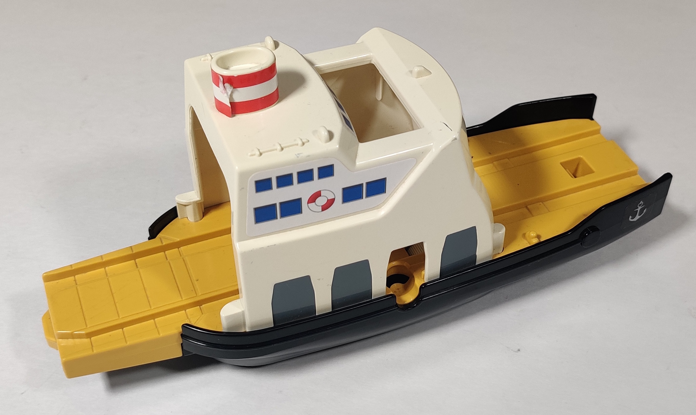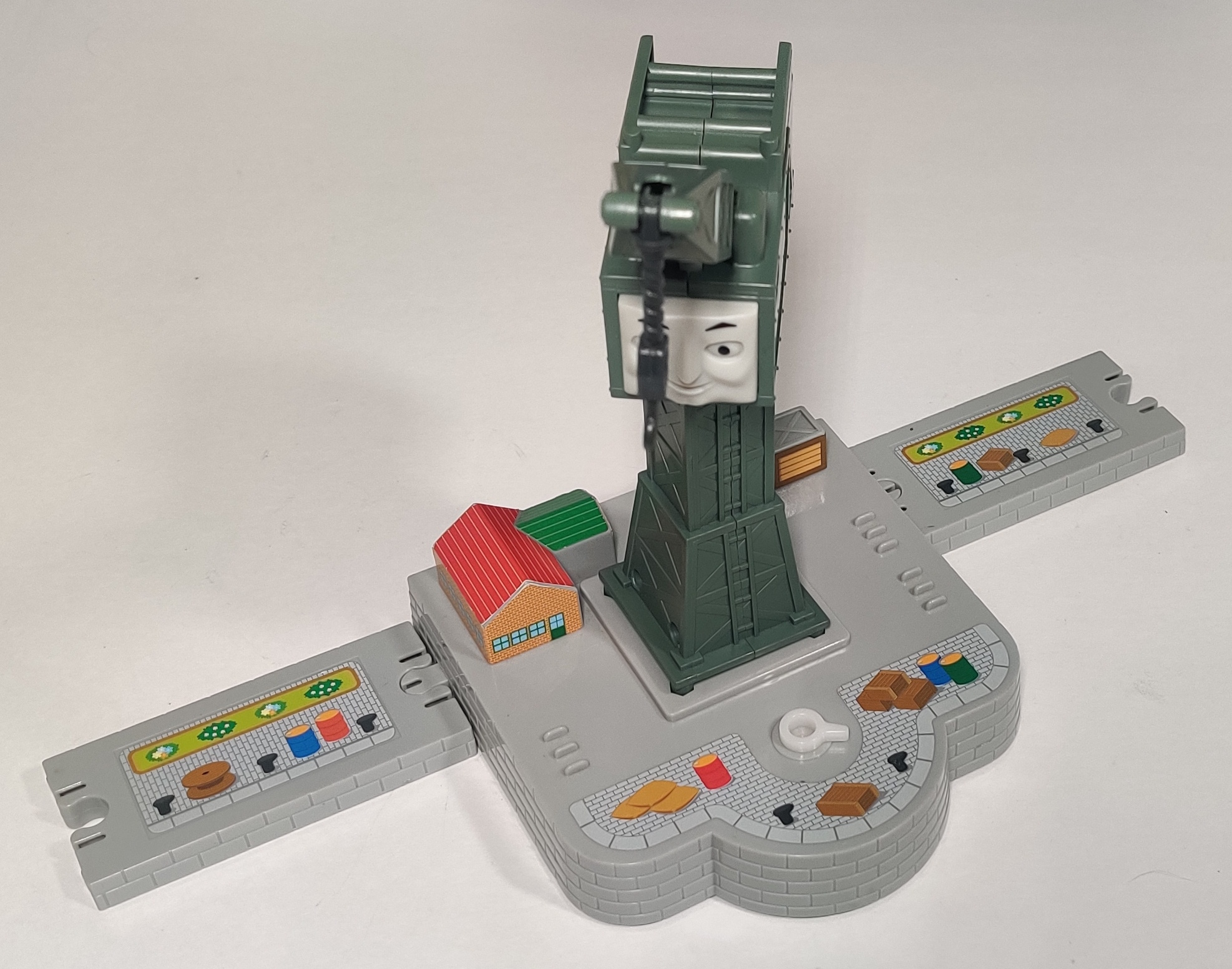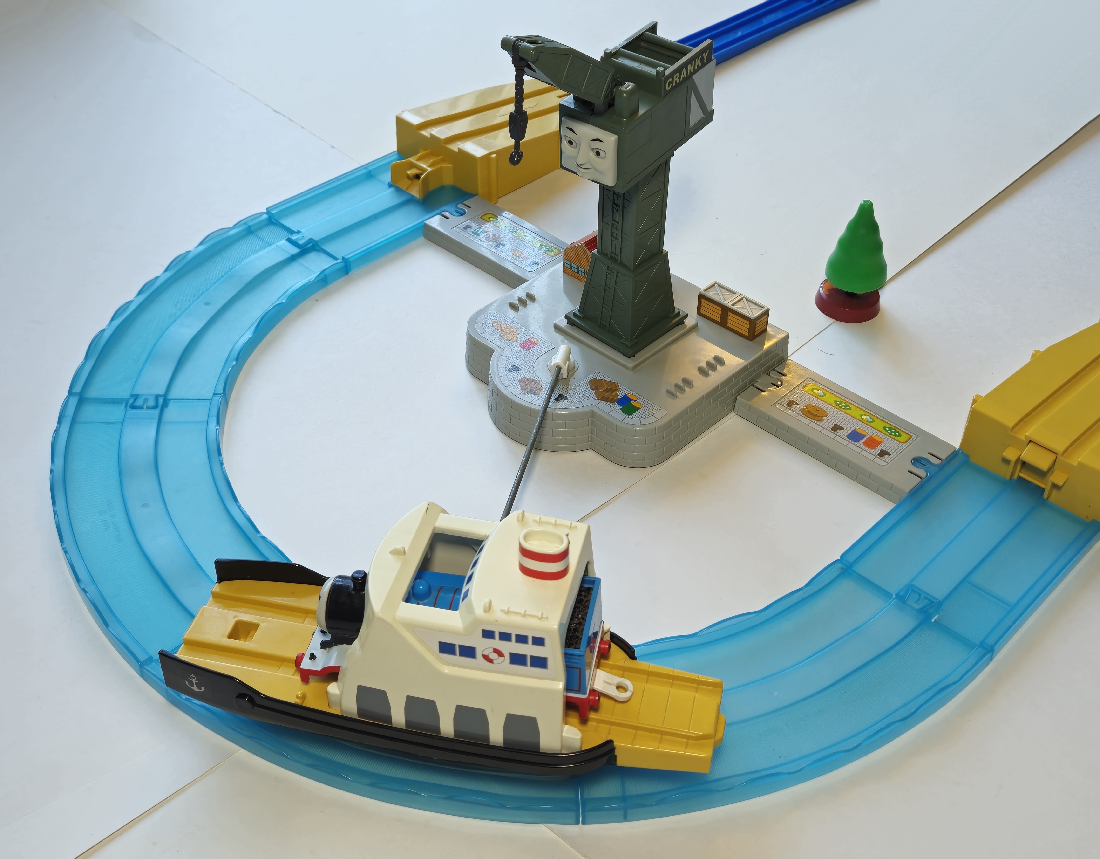 Also included is the ferryboat that Thomas or another train can ride in and drive the ferry across the water track. The ferry has its outer rear wheel powered with a traction tire. A round cutout accommodates the metal arm that keeps the ferry at the right distance and also causes Cranky to swing. The ferry is large enough to hold the larger Thomas series tender engines.