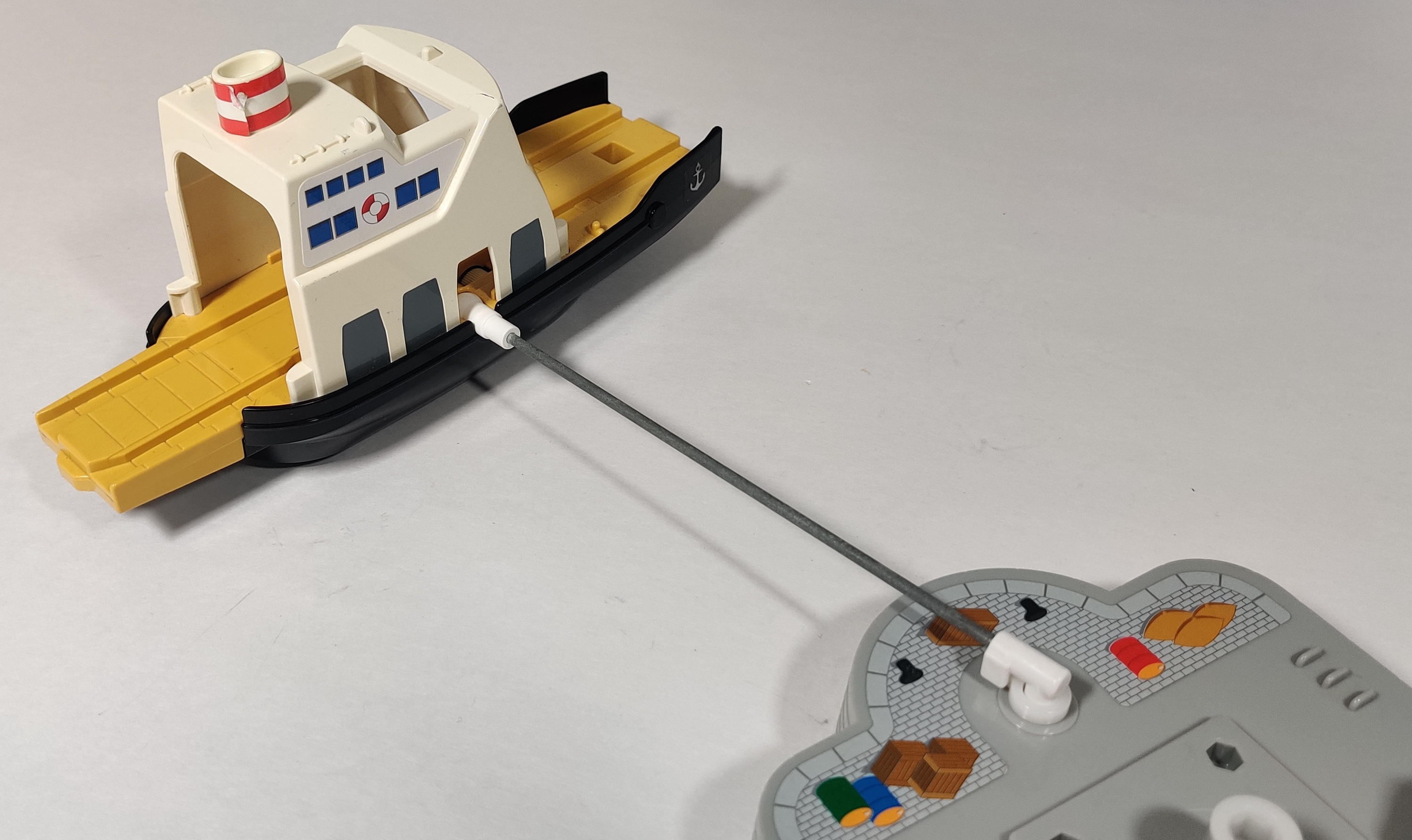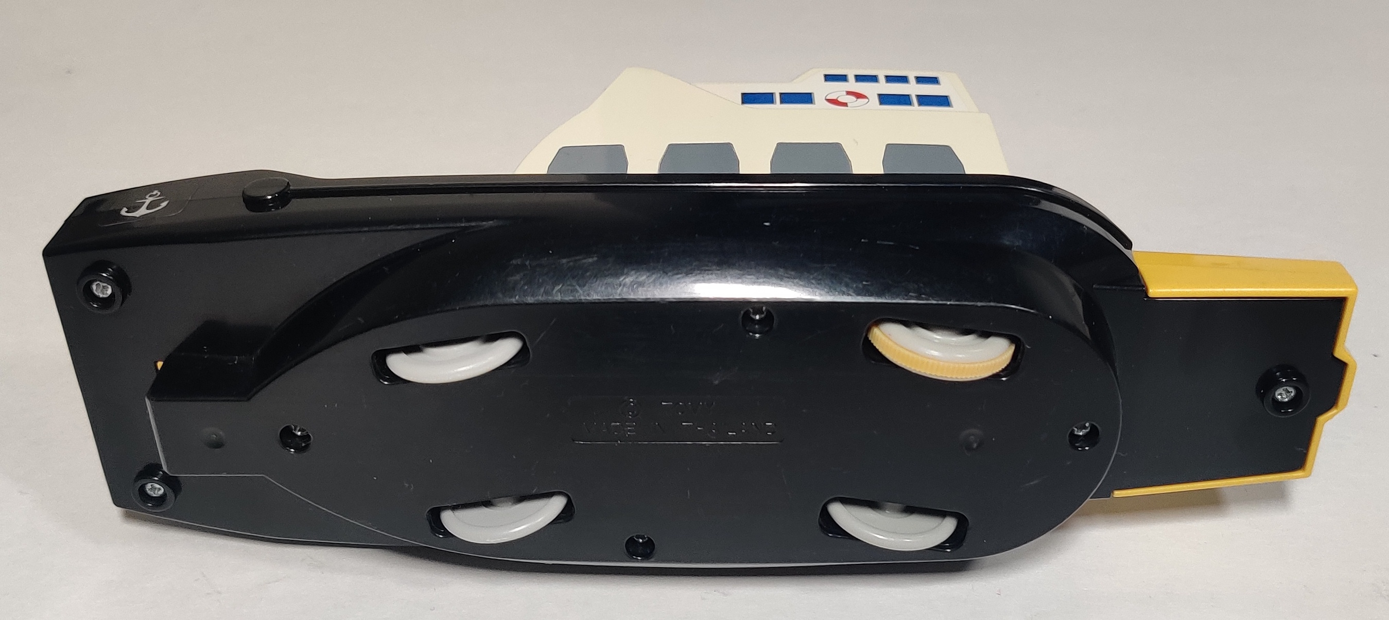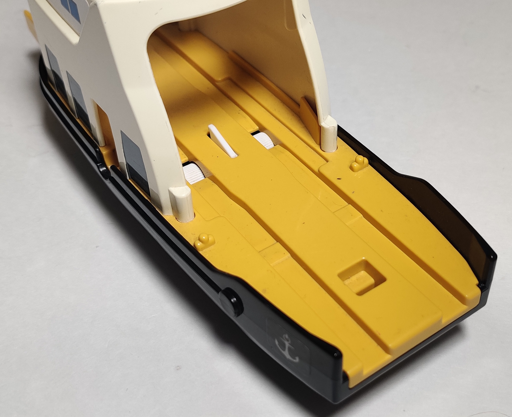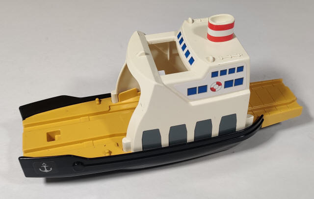 Also included is the ferryboat that Thomas or another train can ride in and drive the ferry across the water track. The ferry has its outer rear wheel powered with a traction tire. A round cutout accommodates the metal arm that keeps the ferry at the right distance and also causes Cranky to swing. The ferry is large enough to hold the larger Thomas series tender engines.