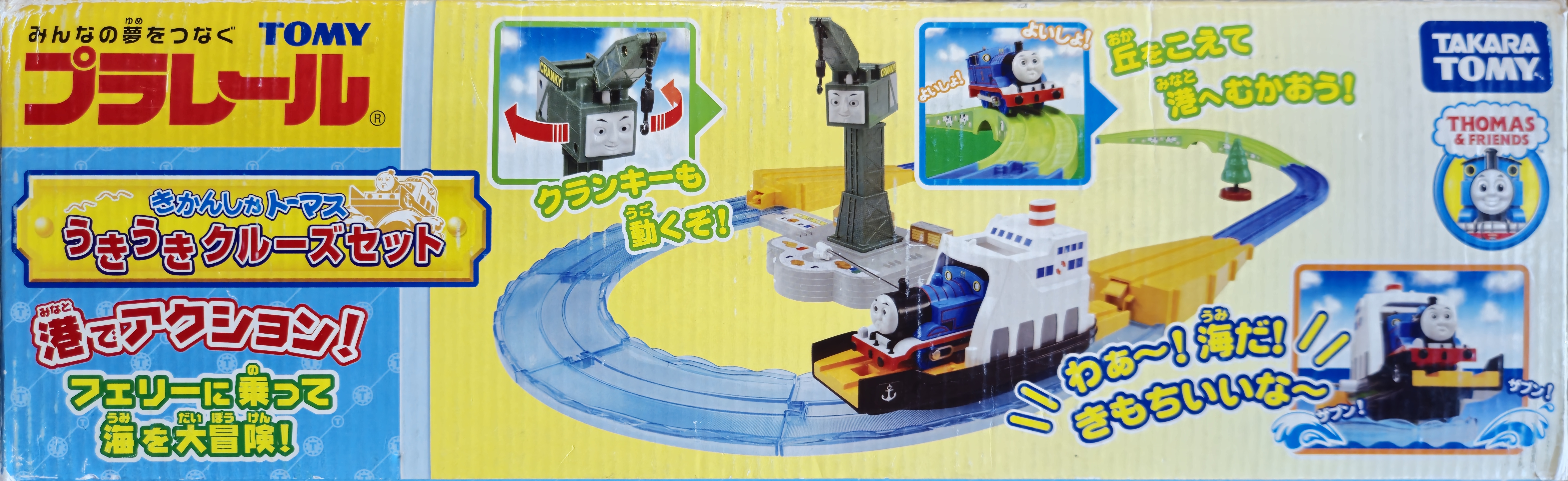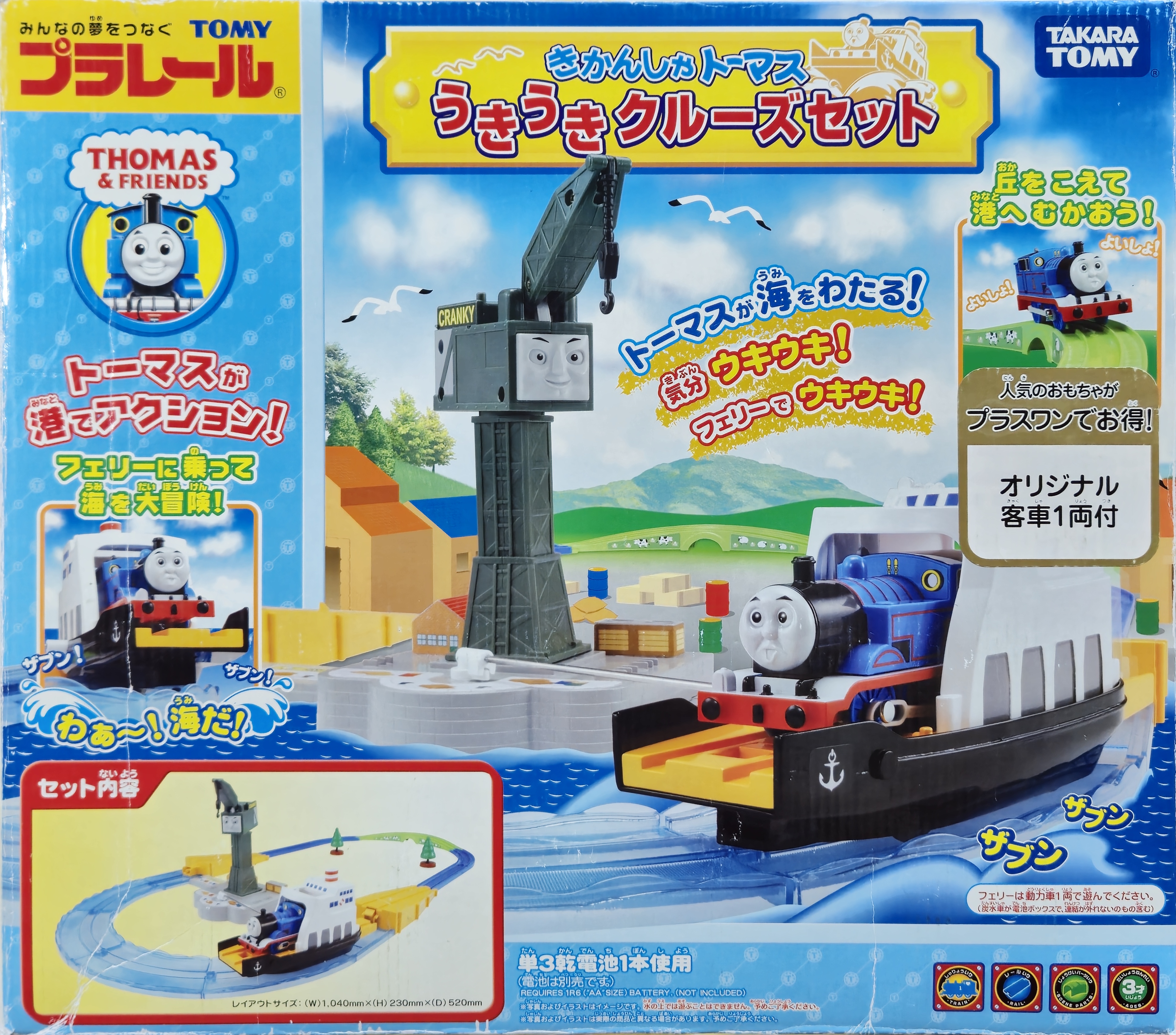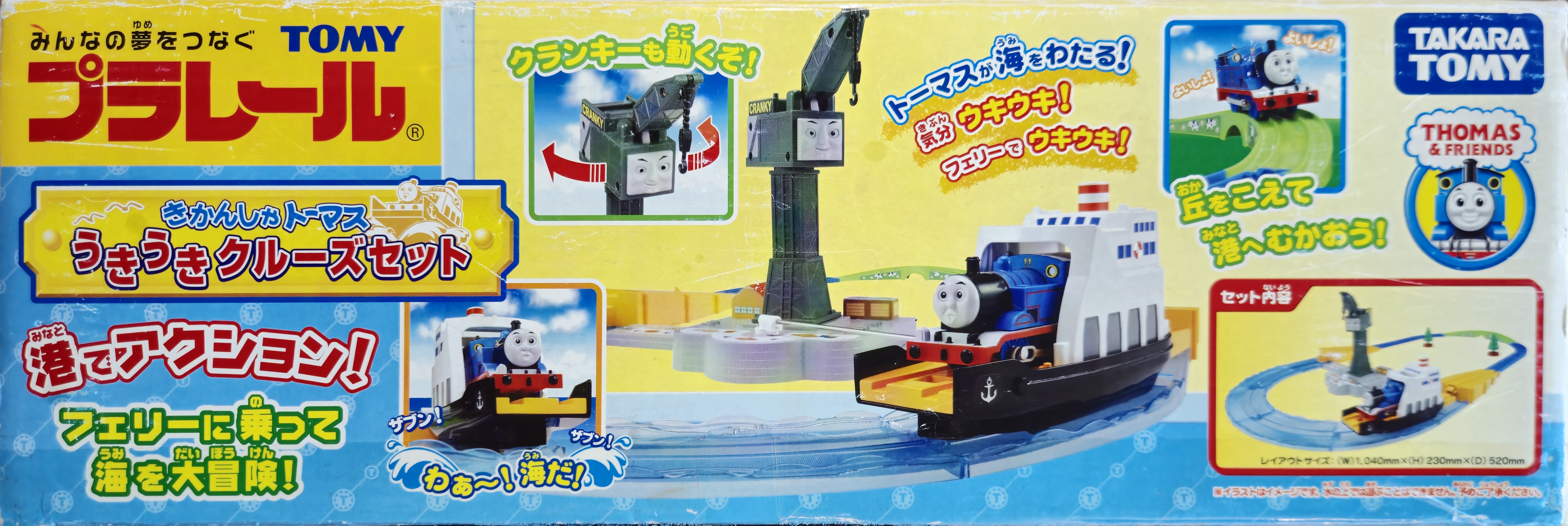 The Plarail Thomas the Tank Engine Exciting Cruise Set (プラレールきかんしゃトーマス うきうきクルーズセット) is a Thomas-series Plarail set released in July 2010 that features Thomas and Cranky recreating a classic 1970 regular Plarail set with a steam locomotive that boards and powers a ferryboat around part of the layout where it disembarks and continues on.