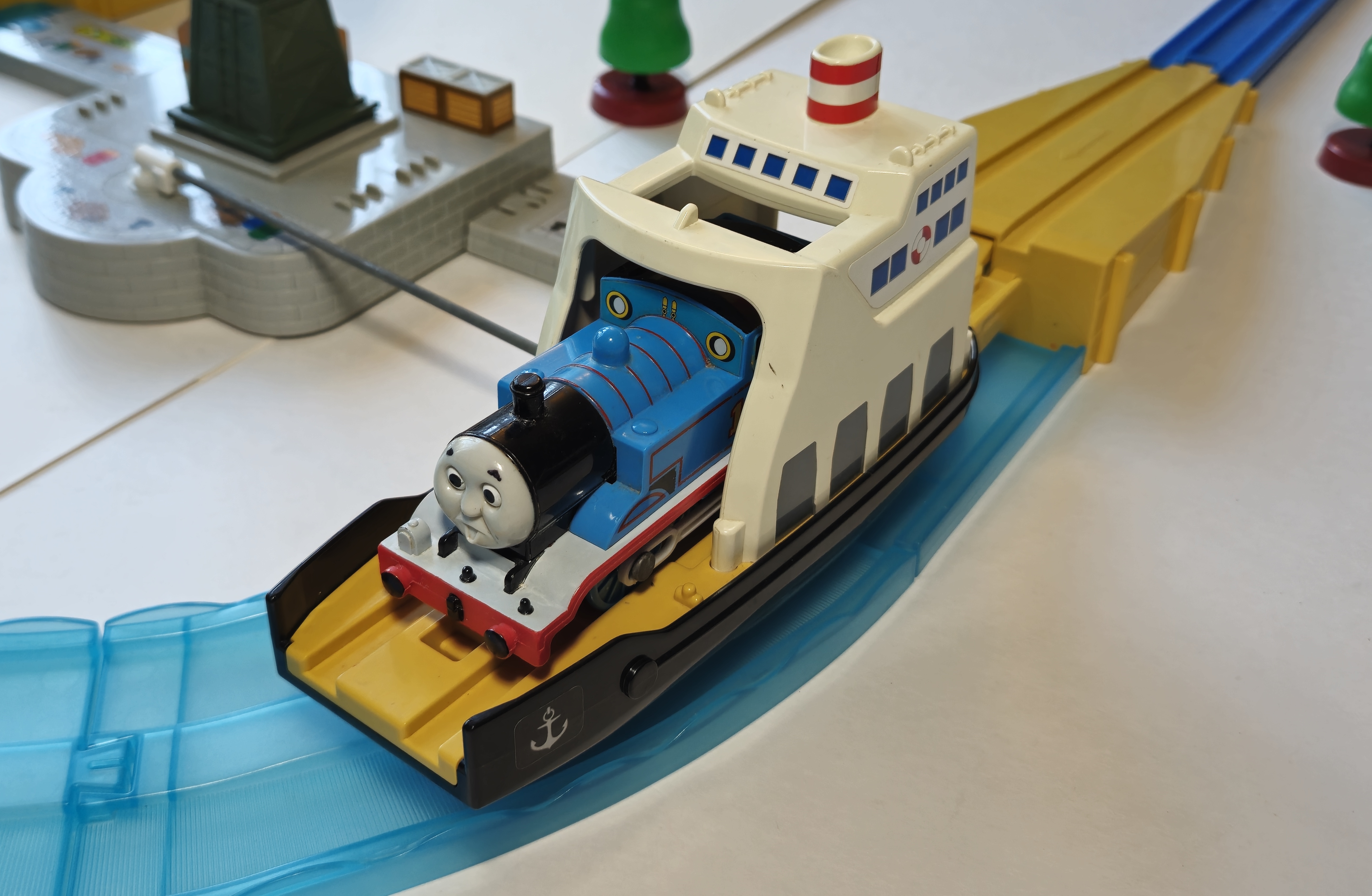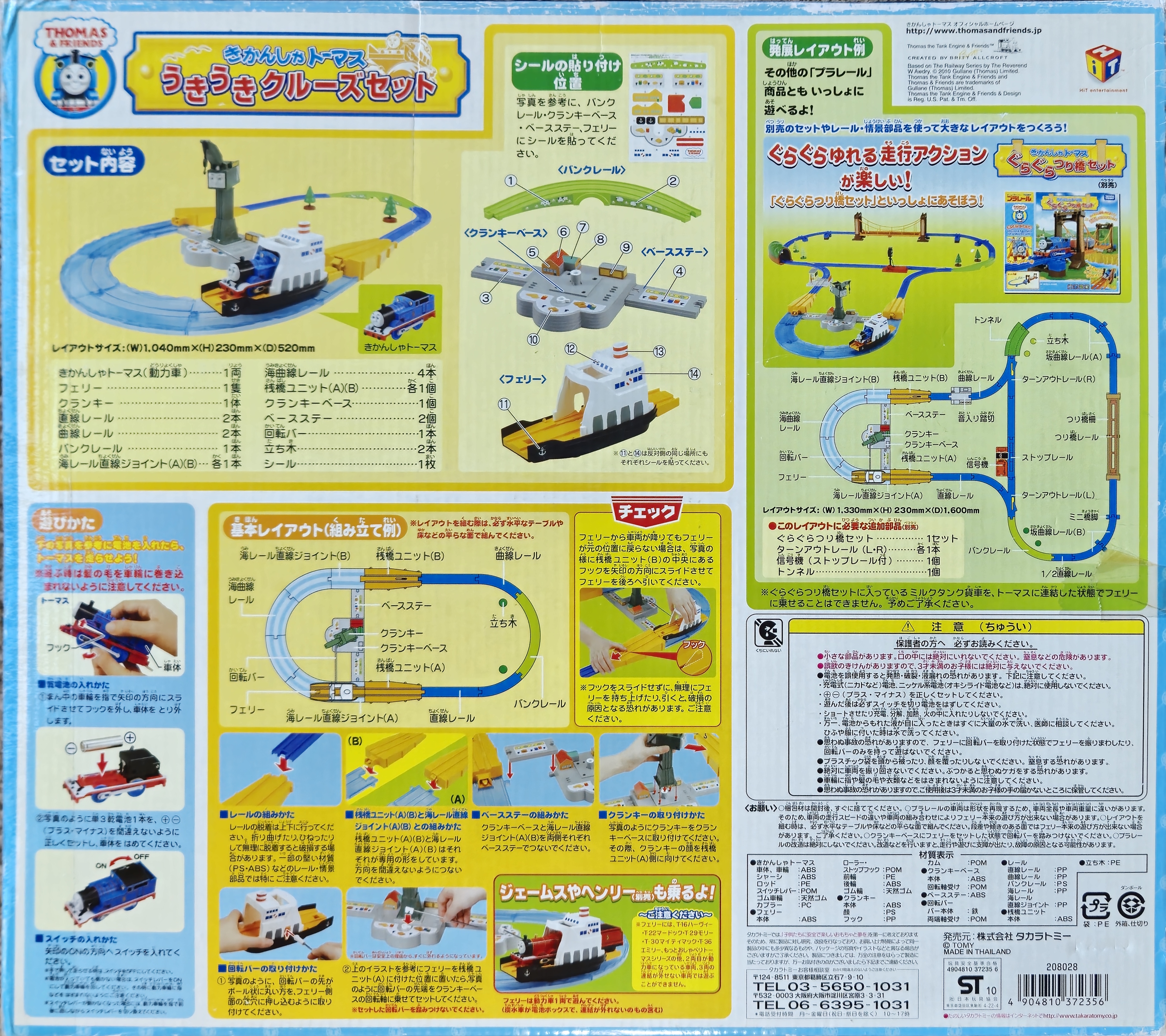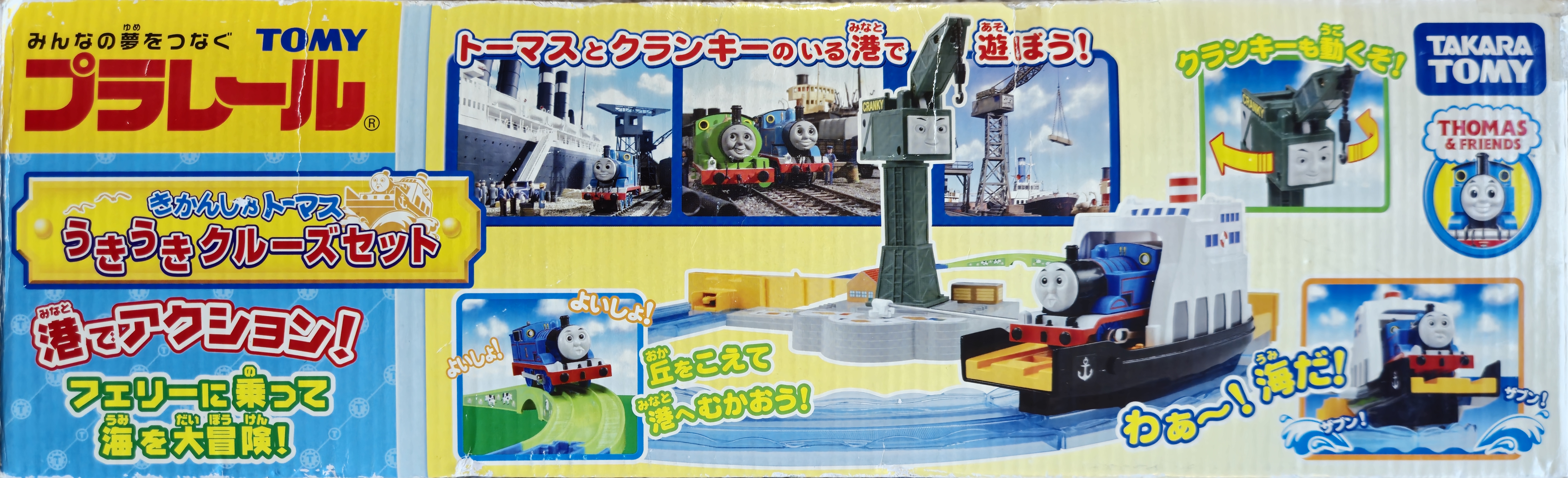 The Plarail Thomas the Tank Engine Exciting Cruise Set (プラレールきかんしゃトーマス うきうきクルーズセット) is a Thomas-series Plarail set released in July 2010 that features Thomas and Cranky recreating a classic 1970 regular Plarail set with a steam locomotive that boards and powers a ferryboat around part of the layout where it disembarks and continues on.