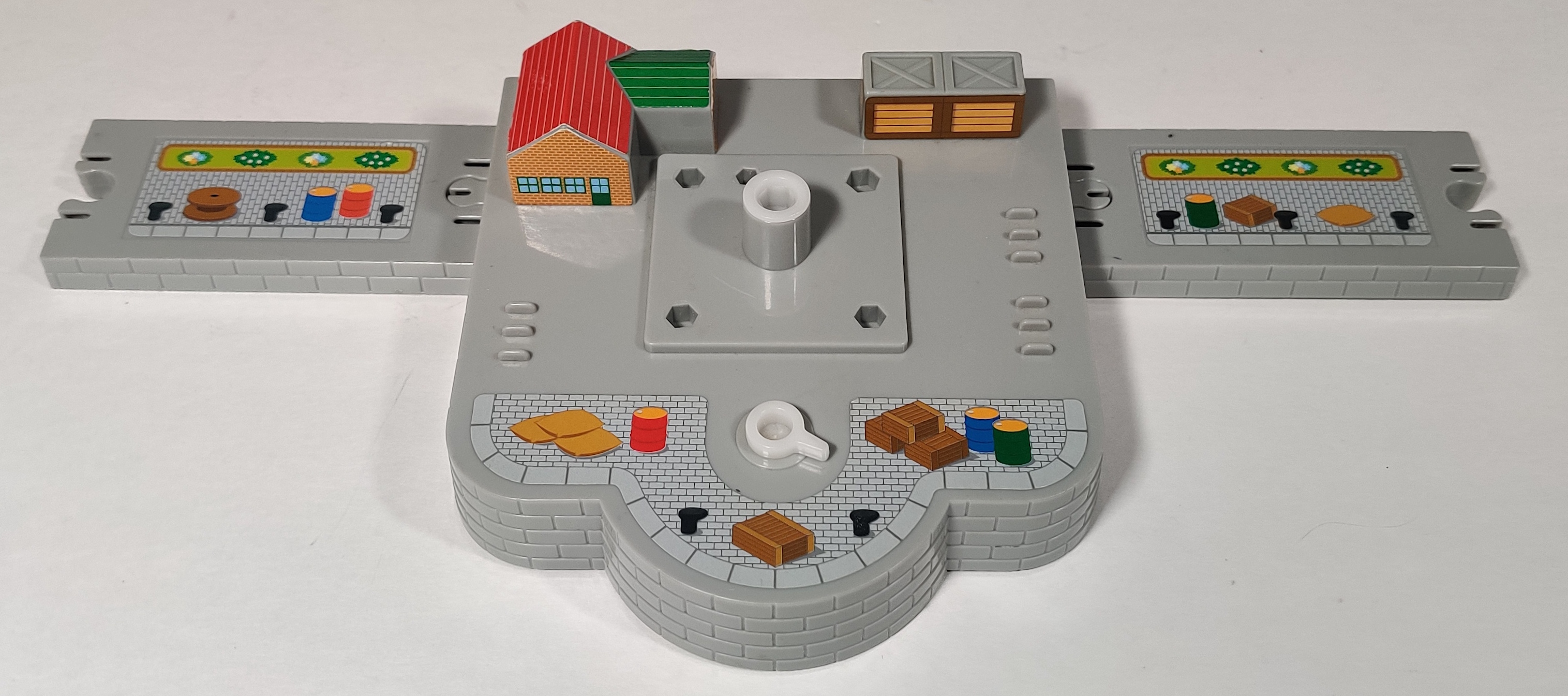 The pier section is made up of three stickered pieces with the large center section having a mechanism that links the movement of the ferry to Cranky's swinging. Cranky's pier is also compatible with PlaKids, with a few different slots to put them in.