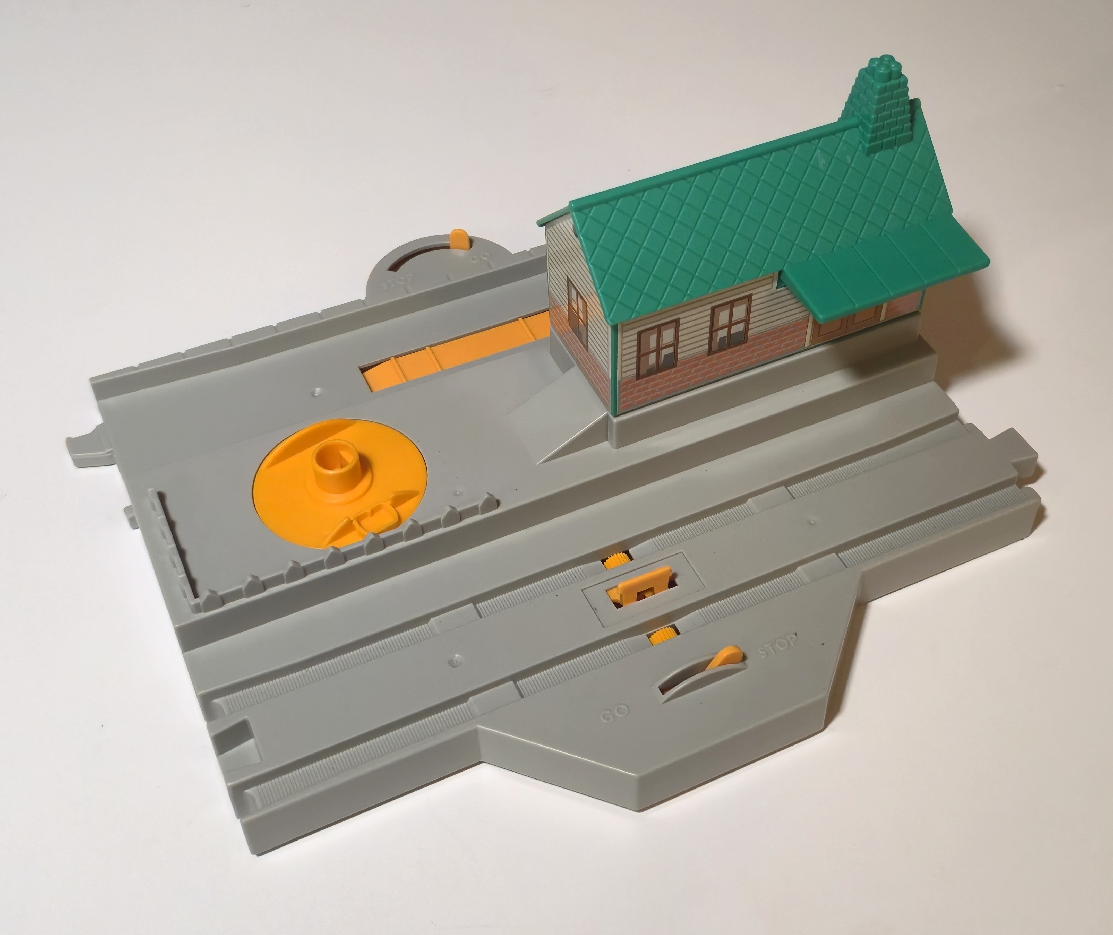 The station building is the same tooling as the one used on the J-25 Thomas the Tank Engine Railroad Crossing Station in a different color with different stickers.