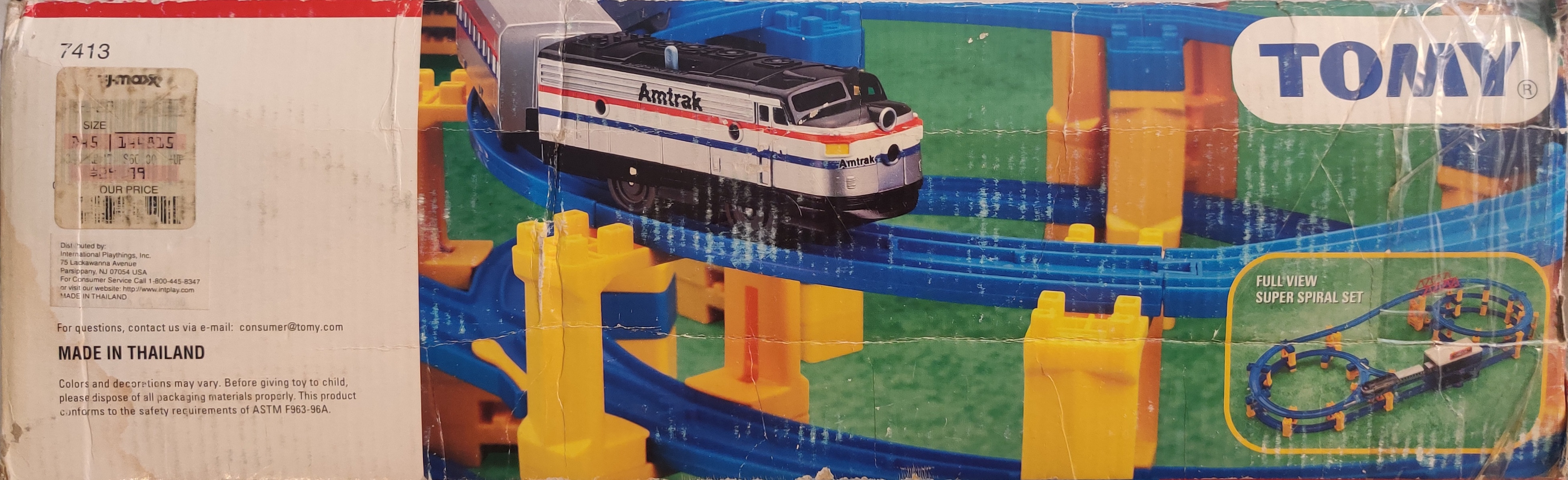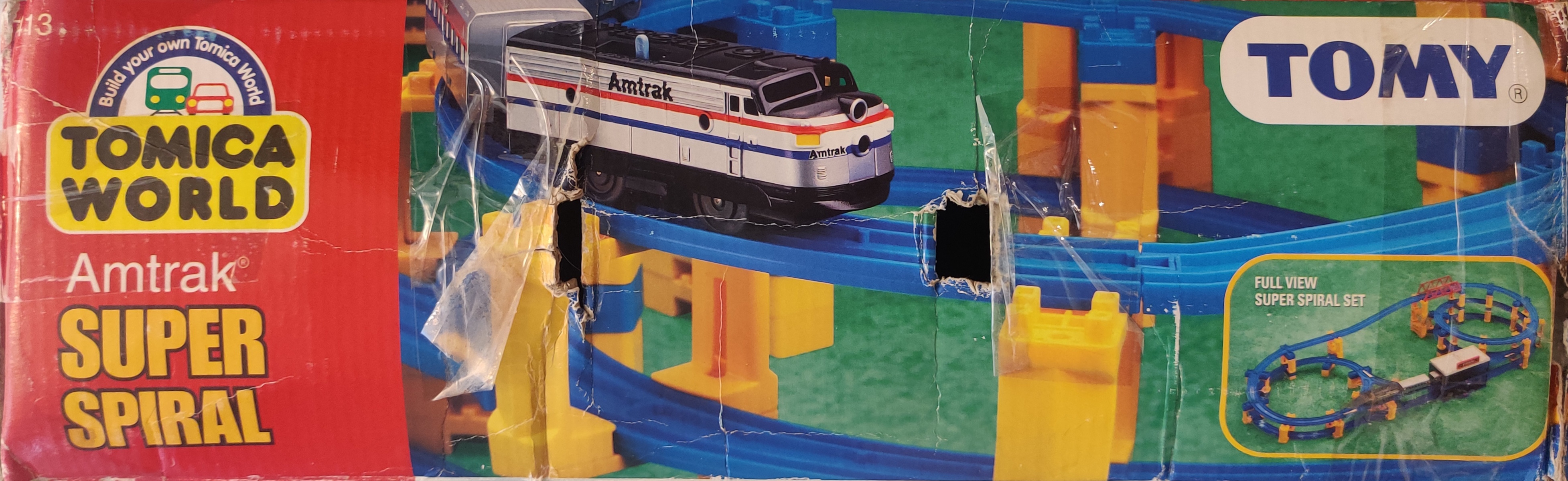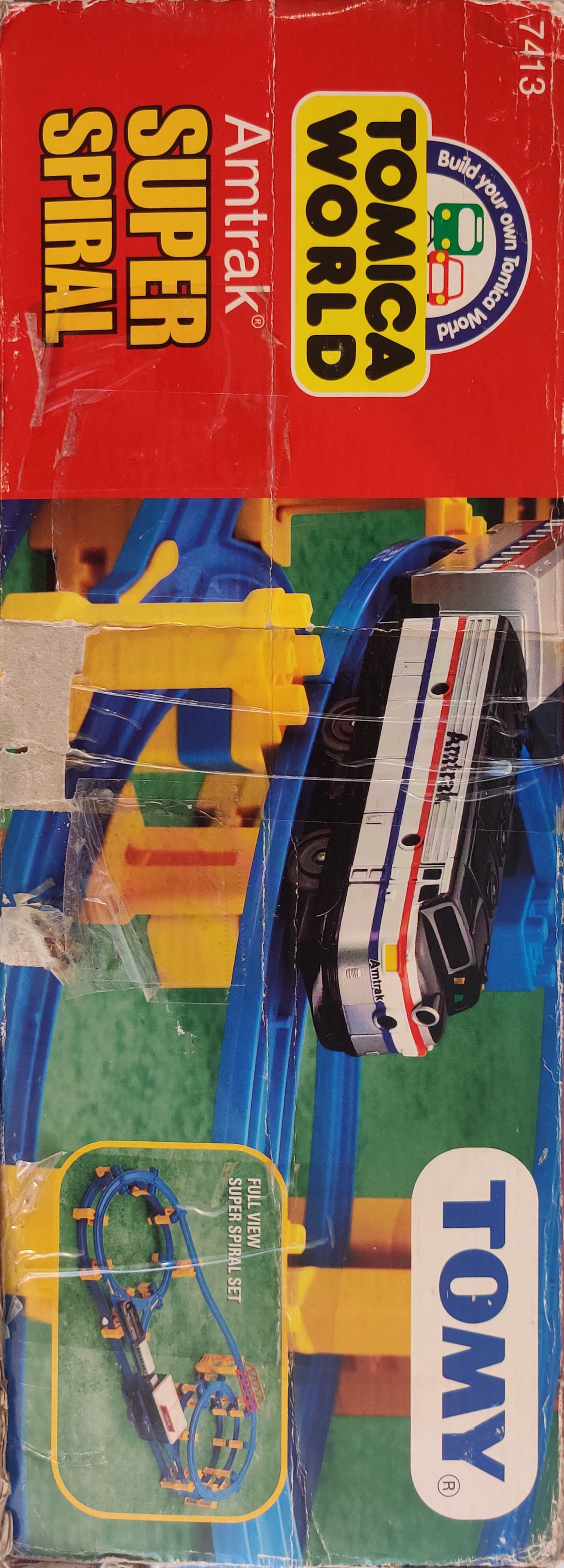 The 7413 Amtrak Super Spiral Set was a 2001 Tomica World set released in the United States based on the European 7429 Super Spiral Set. This American version does not include any Motor Tomica road elements but does include a nice American Amtrak F unit diesel and passenger cars as well as a two-level panel station.