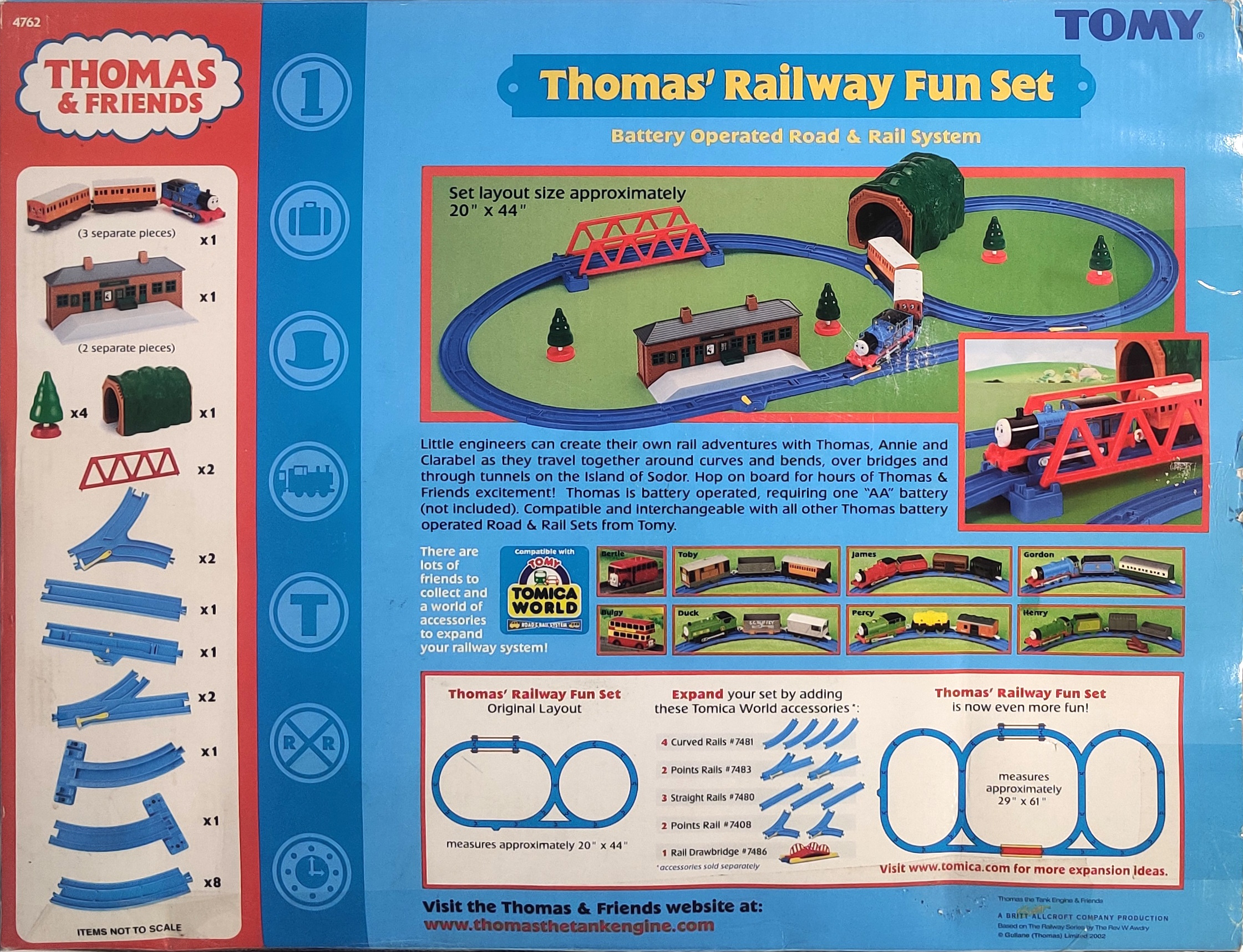 The 4762 Thomas' Railway Fun Set is a 2002 American Battery Operated Road & Rail System set with Thomas, Annie, Clarabel, Ffarquhar station, and a tunnel and bridge on a modified figure-eight style layout.