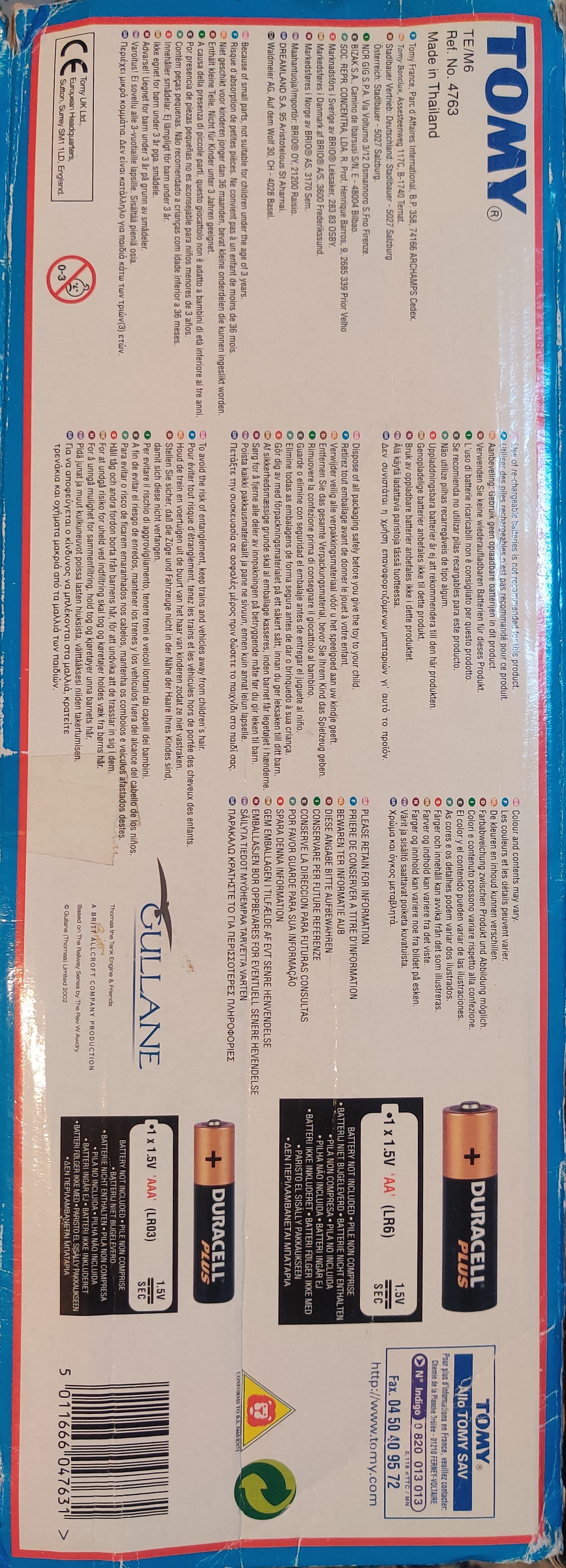 The 4763 Percy and Bulgy Set is a 2002 European Tomica World Thomas set which includes Percy, Bulgy, and a layout similar to the older regular Tomica World Large Set. The box shows the Thomas variant of the overpass bridge but with the regular Tomica World (or Plarail) accessories - the set itself comes with the regular Thomas version with four trees. Having seemingly been released fairly limitedly and for not all that long, most copies seem to have originally included a Tomica World VHS.