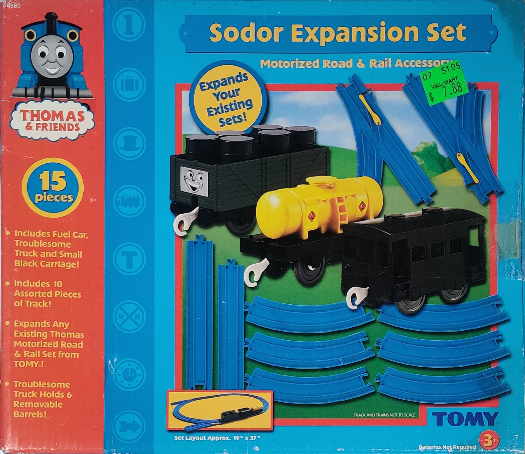 The Sodor Expansion Set is an accessory pack for the American Thomas Motorized Road & Rail system first produced in late 2004 and sold in 2005 under the 4880 catalogue number. The front of the box suggests that the six individual barrels are removable rather than the two pieces of three drums each, and the rear also suggests that at some point logs of some kind may have been included in the pack.